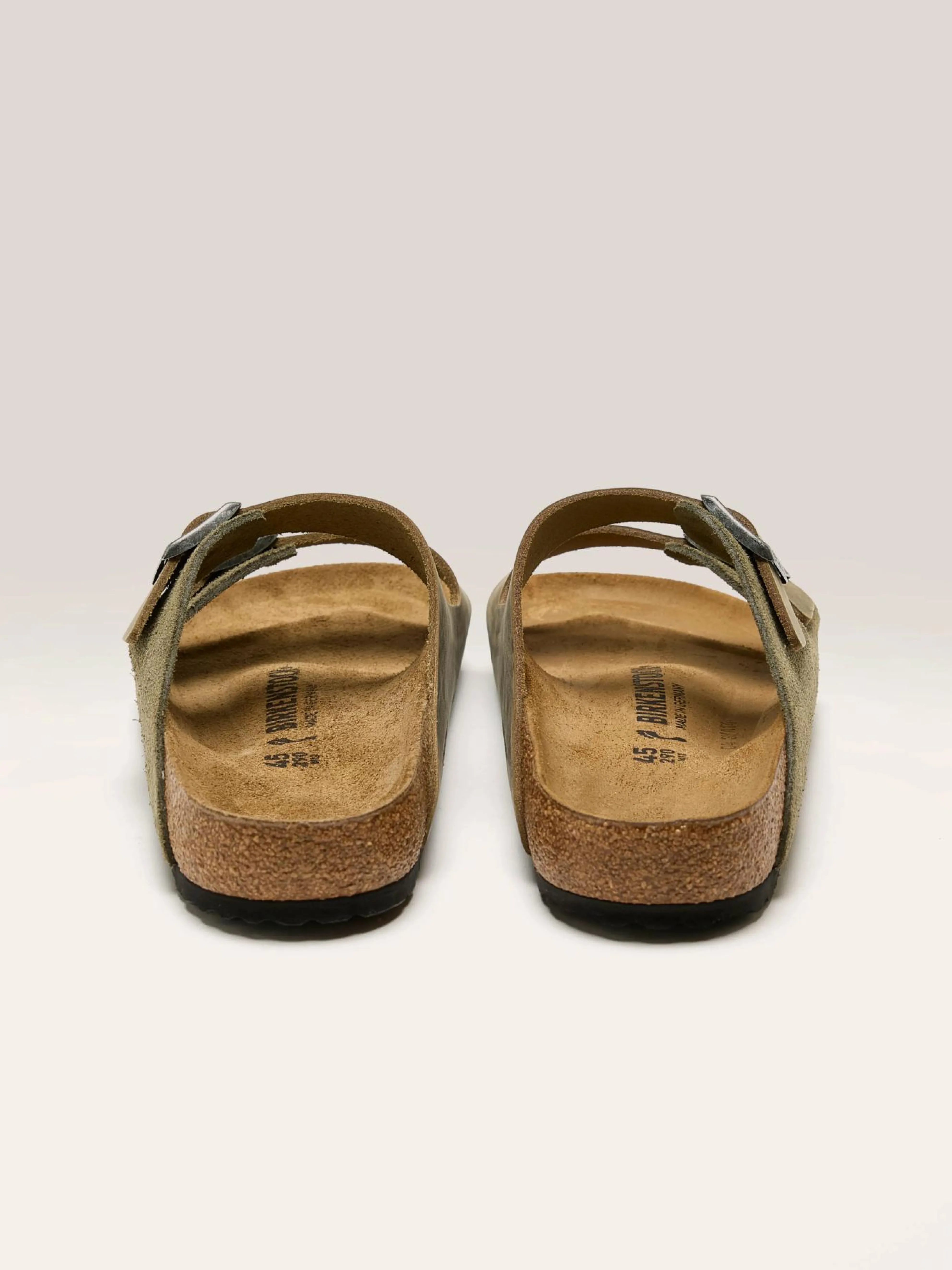 De Birkenstock Arizona sandalen hebben een bovenwerk van gemengd suède en leder met een opengewerkte rand.