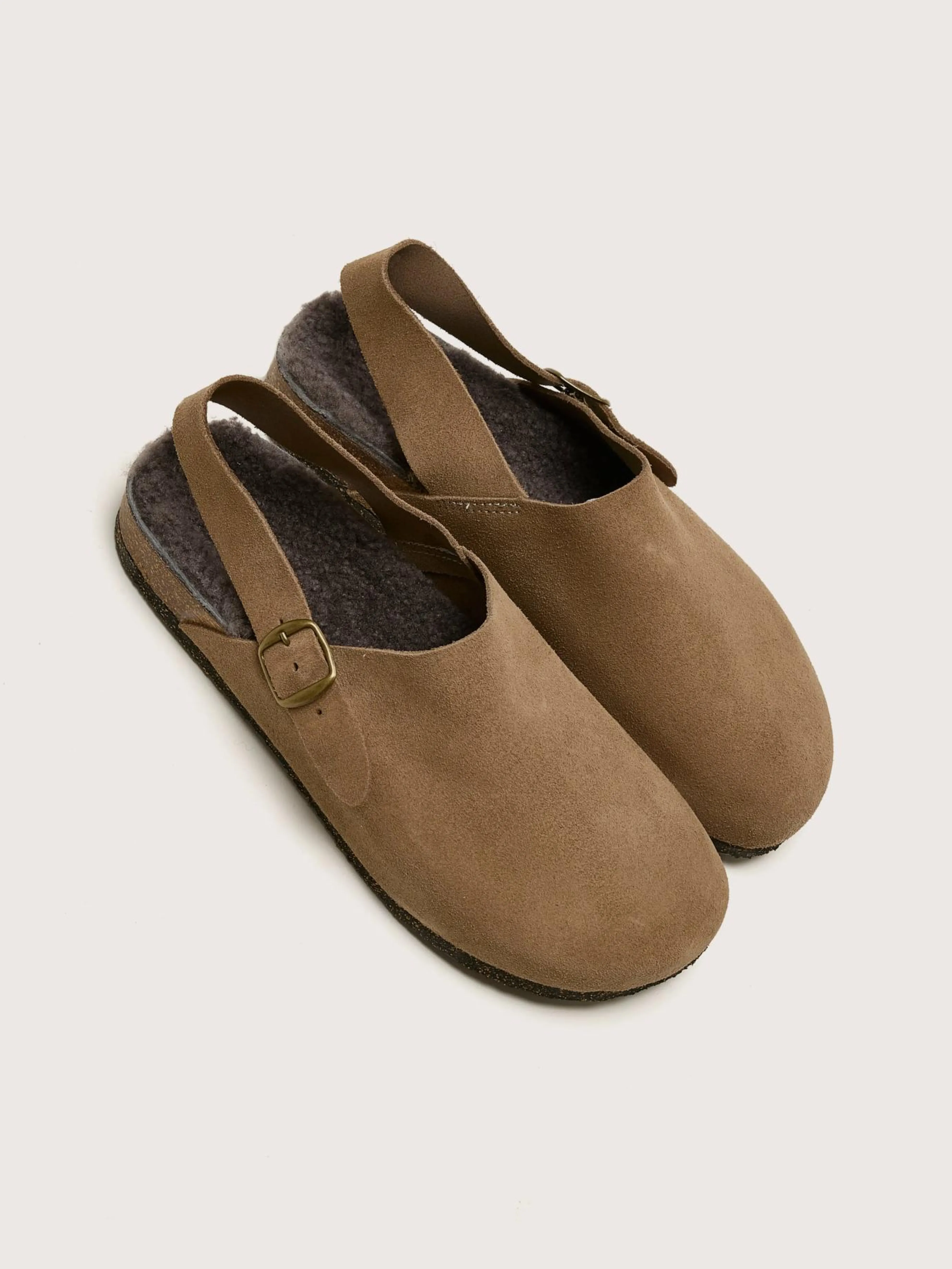 De Bosabo Taupe Suède klompen zijn handgemaakt in Frankrijk met een zacht suède bovenwerk en een schapenvacht gevoerd voetbed.