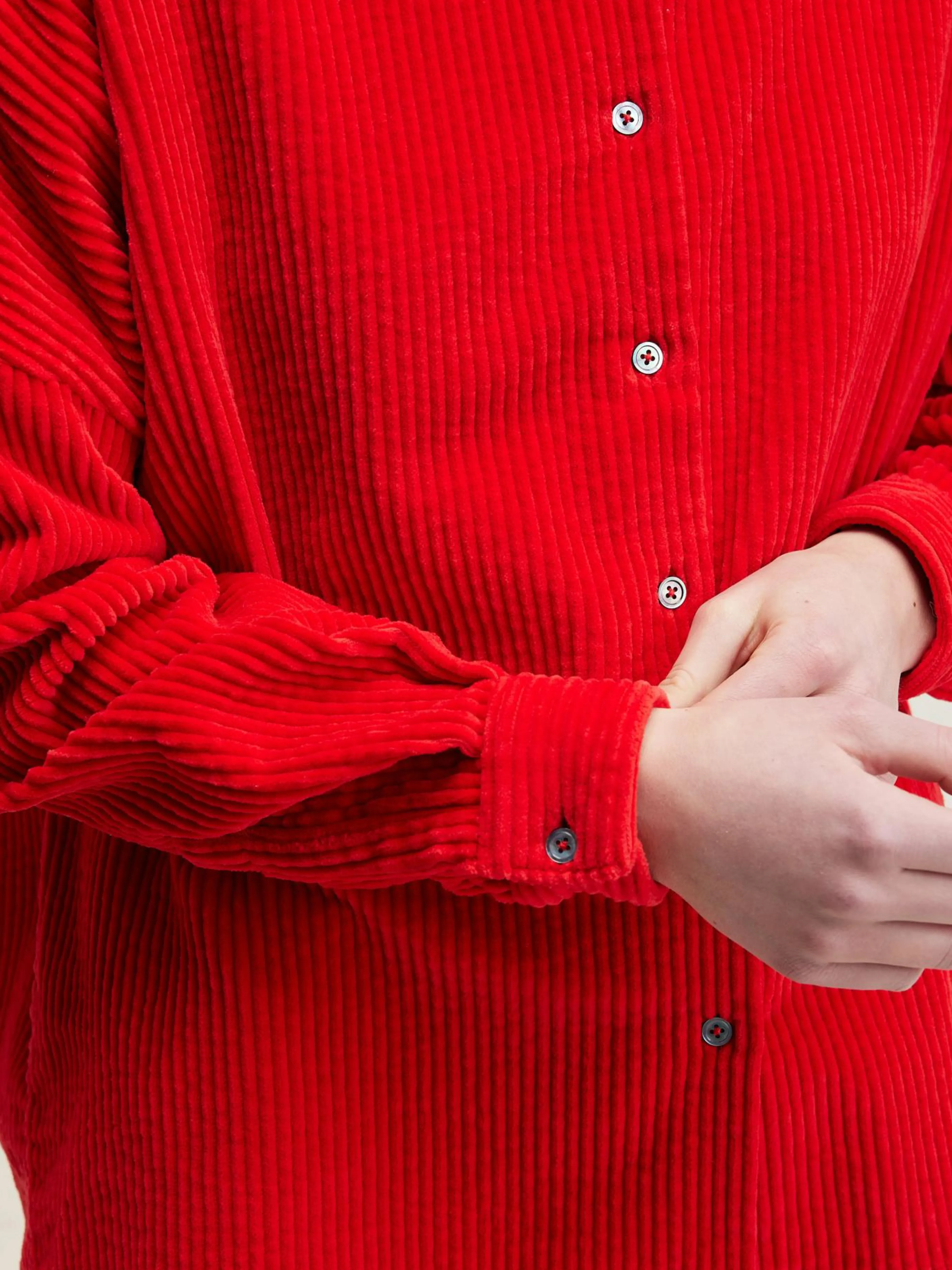 Oversized hemd van donkerrode corduroy, met klassieke kraag en lage schouderlijn.