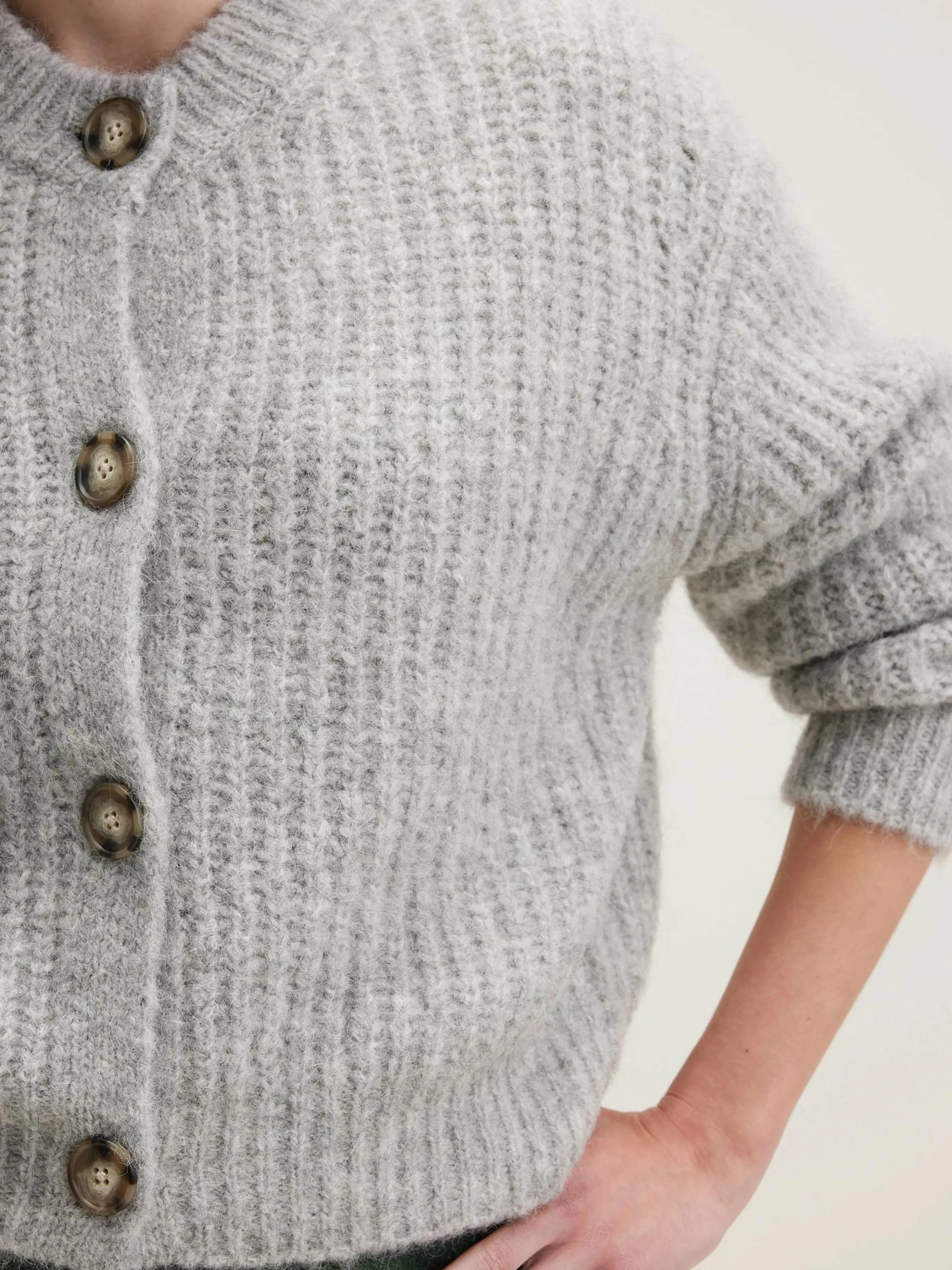 Klassieke, lichtgrijze cardigan van ribtricot.