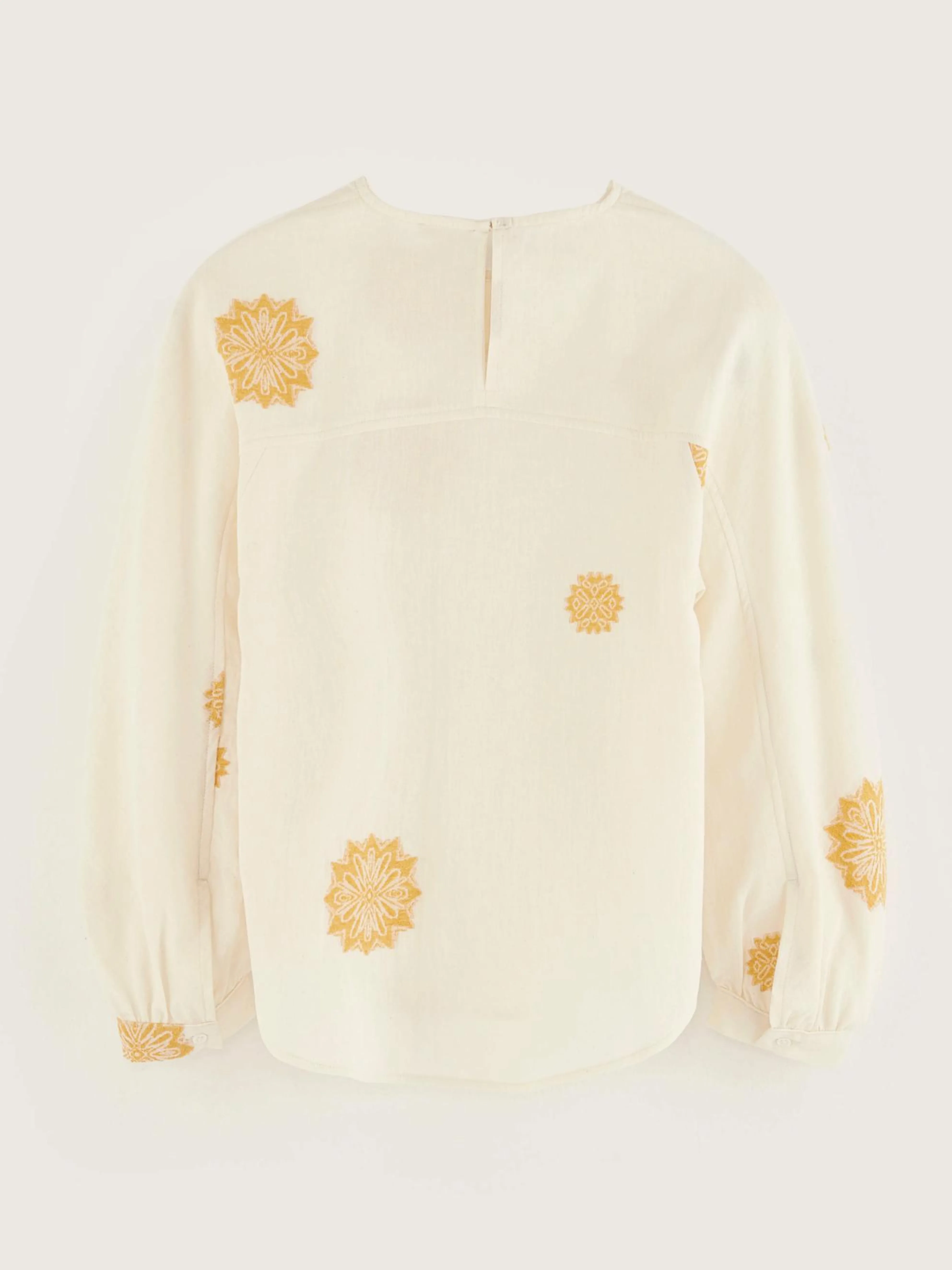 Aansluitende witte blouse met gouden zonnetjes, van jacquard fil coupé.