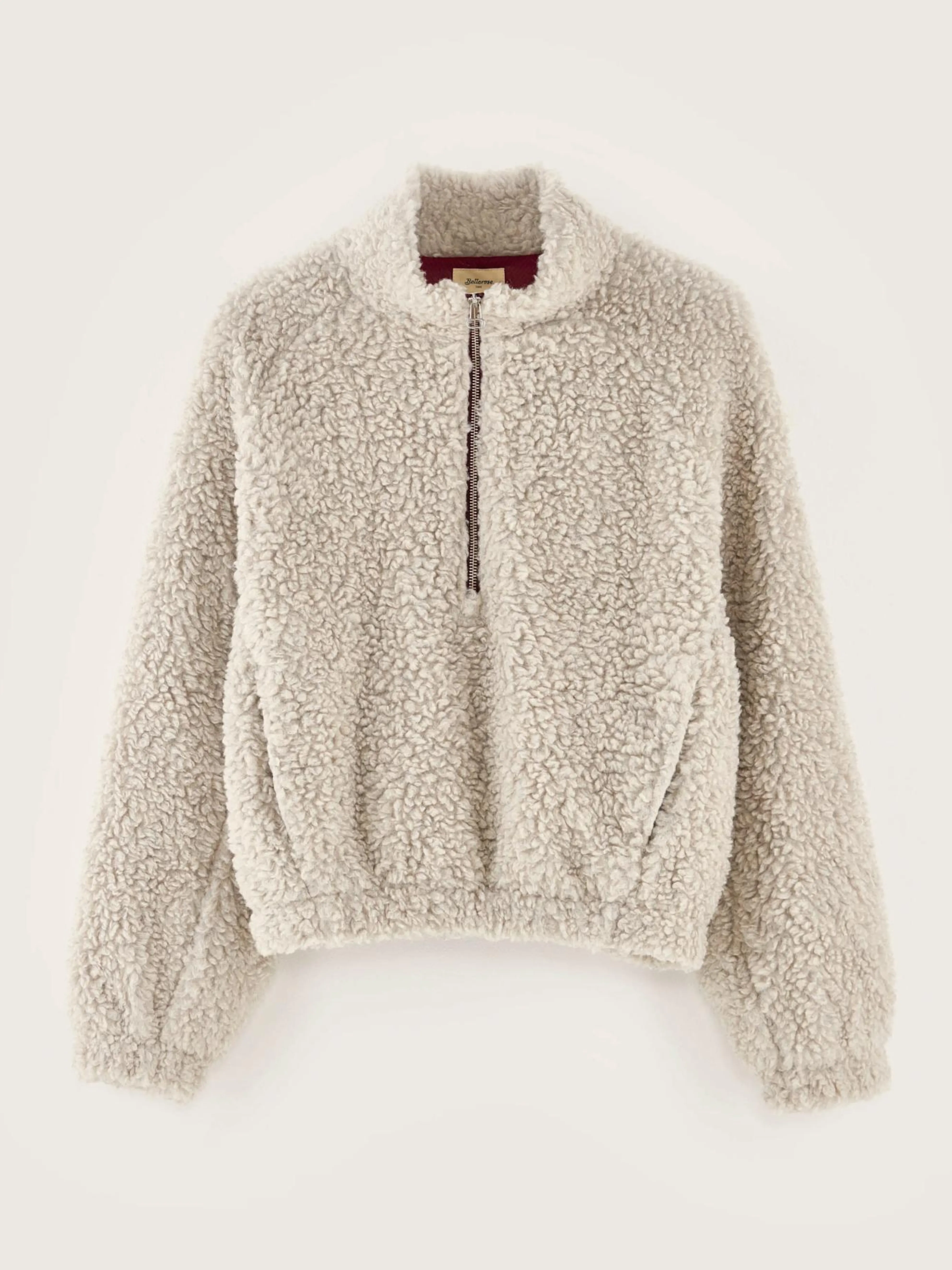 Sweatshirt om over het hoofd te trekken, van grijze krullende teddystof met bordeaux contrasten.