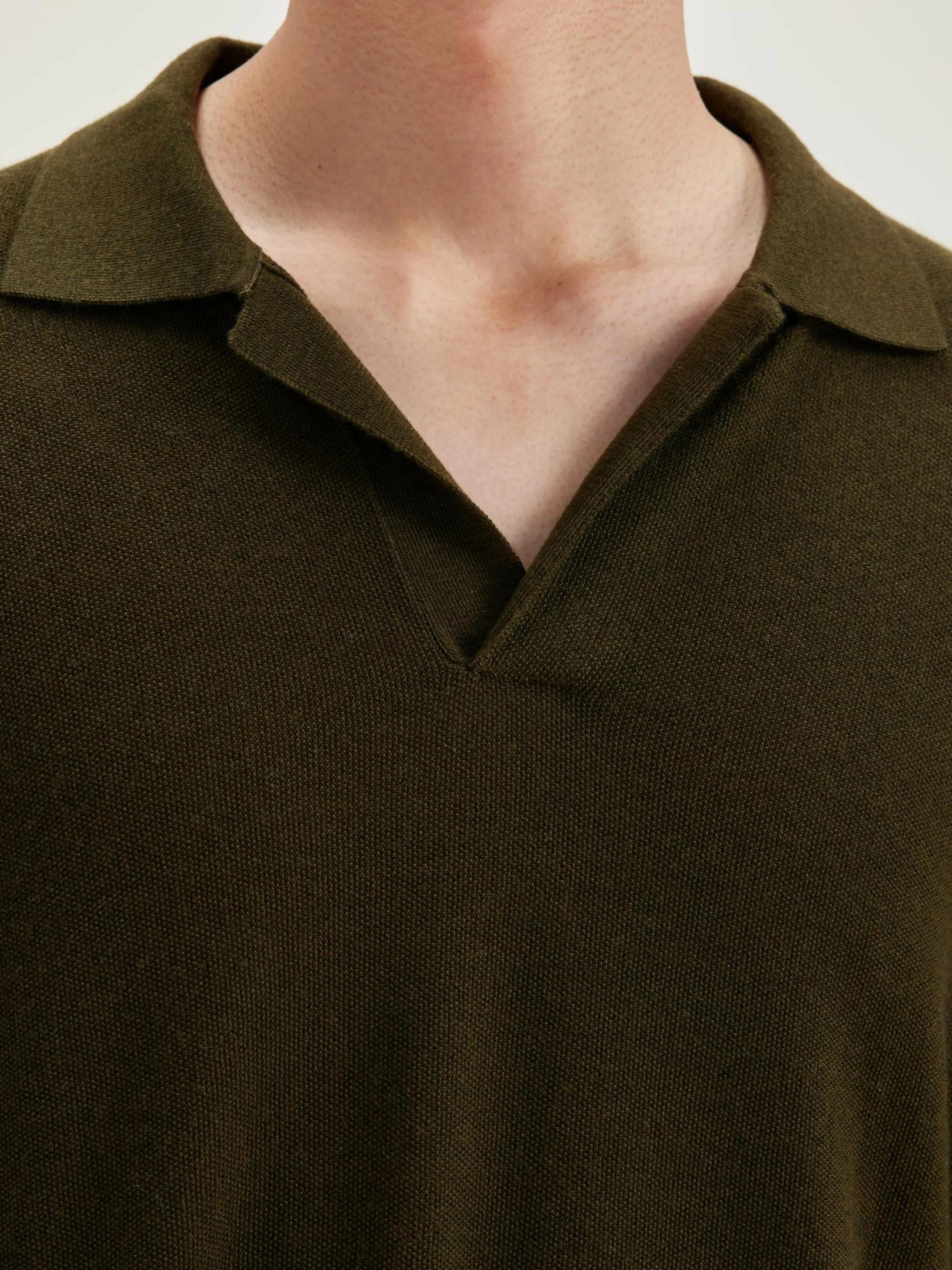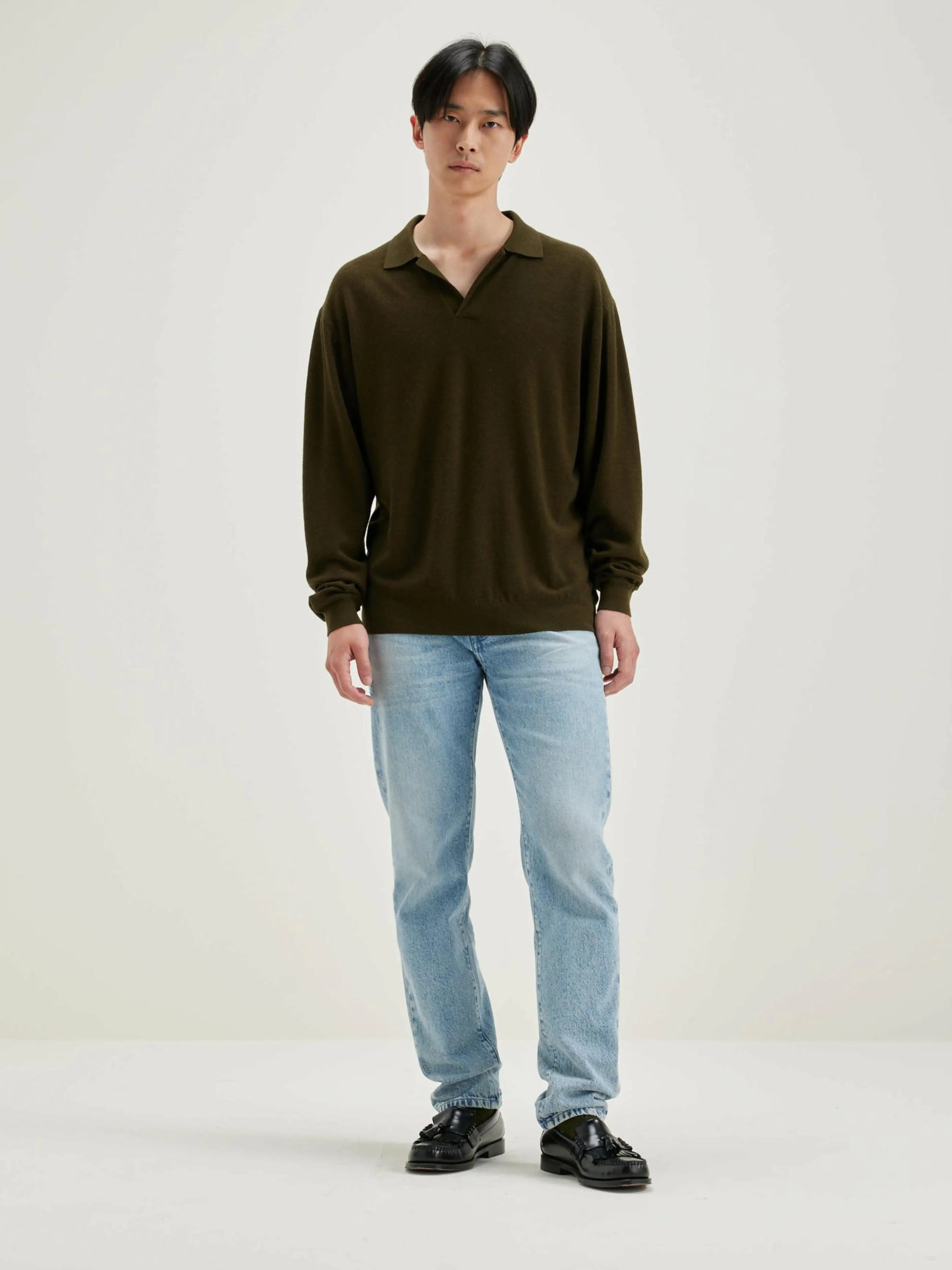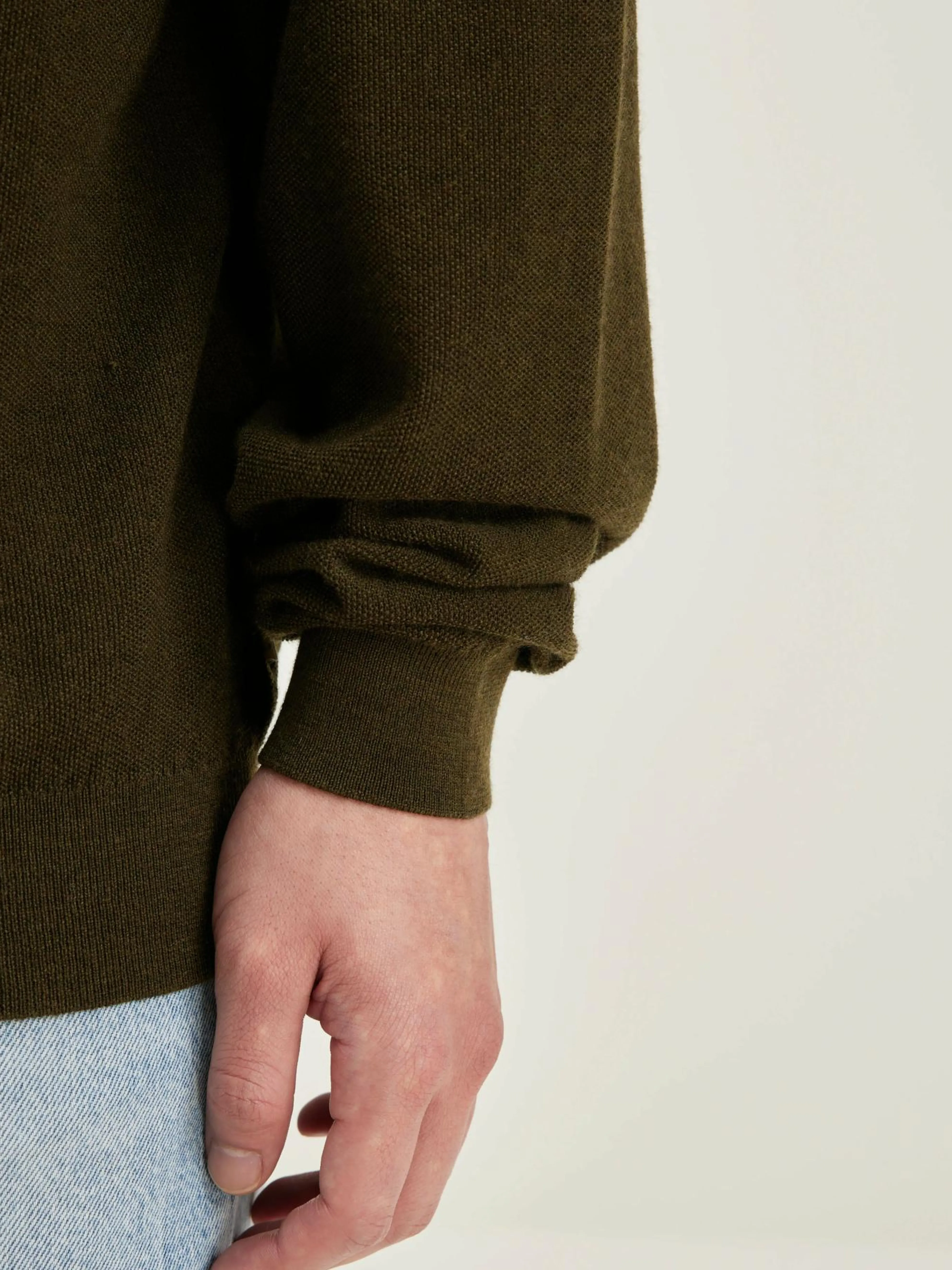 Comfortabele sweater in polostijl, van olijfgroene merinowol.