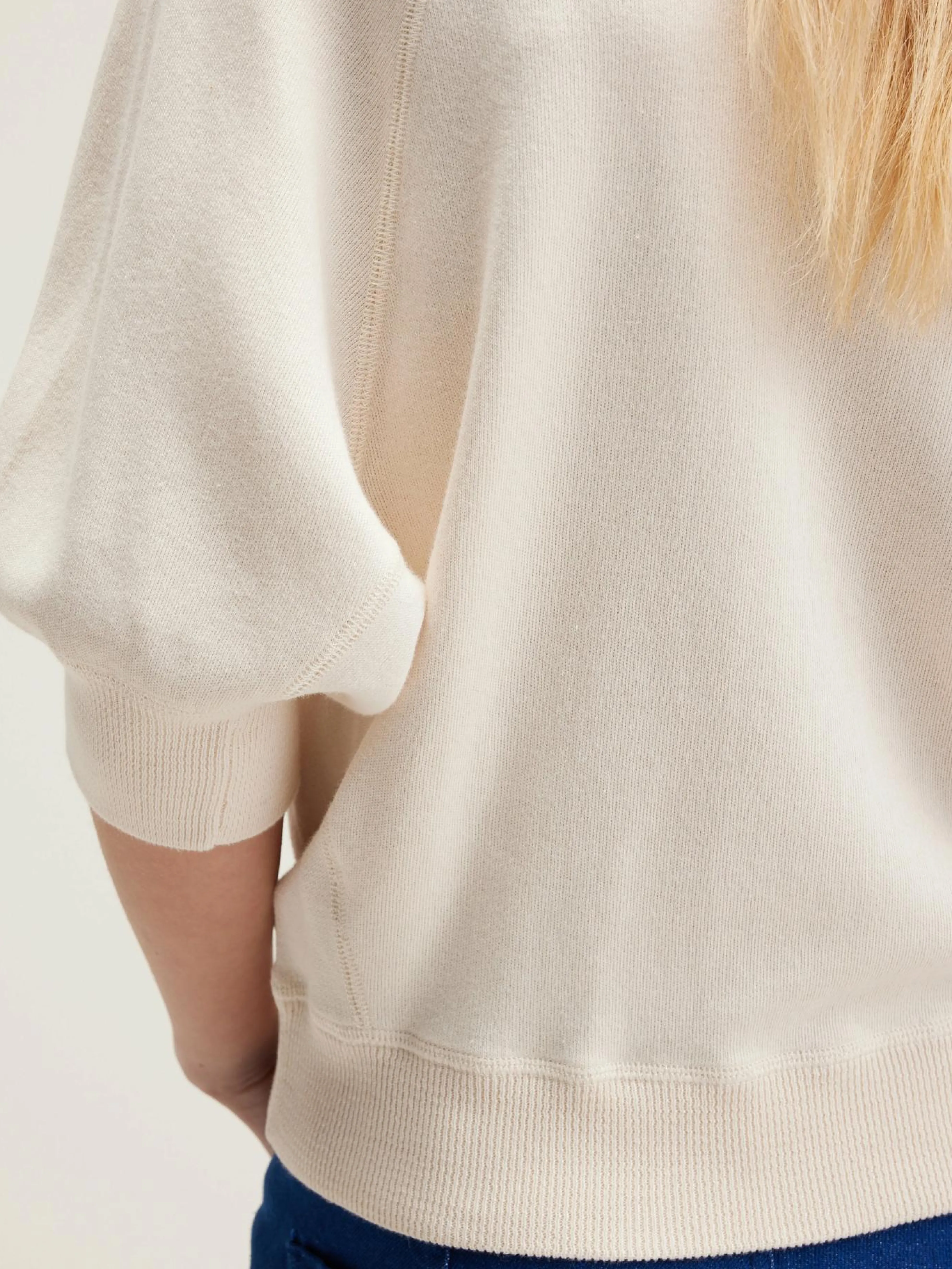 Oversizede crewneck trui met 3/4 mouwen en geribde boorden in ecru katoen.