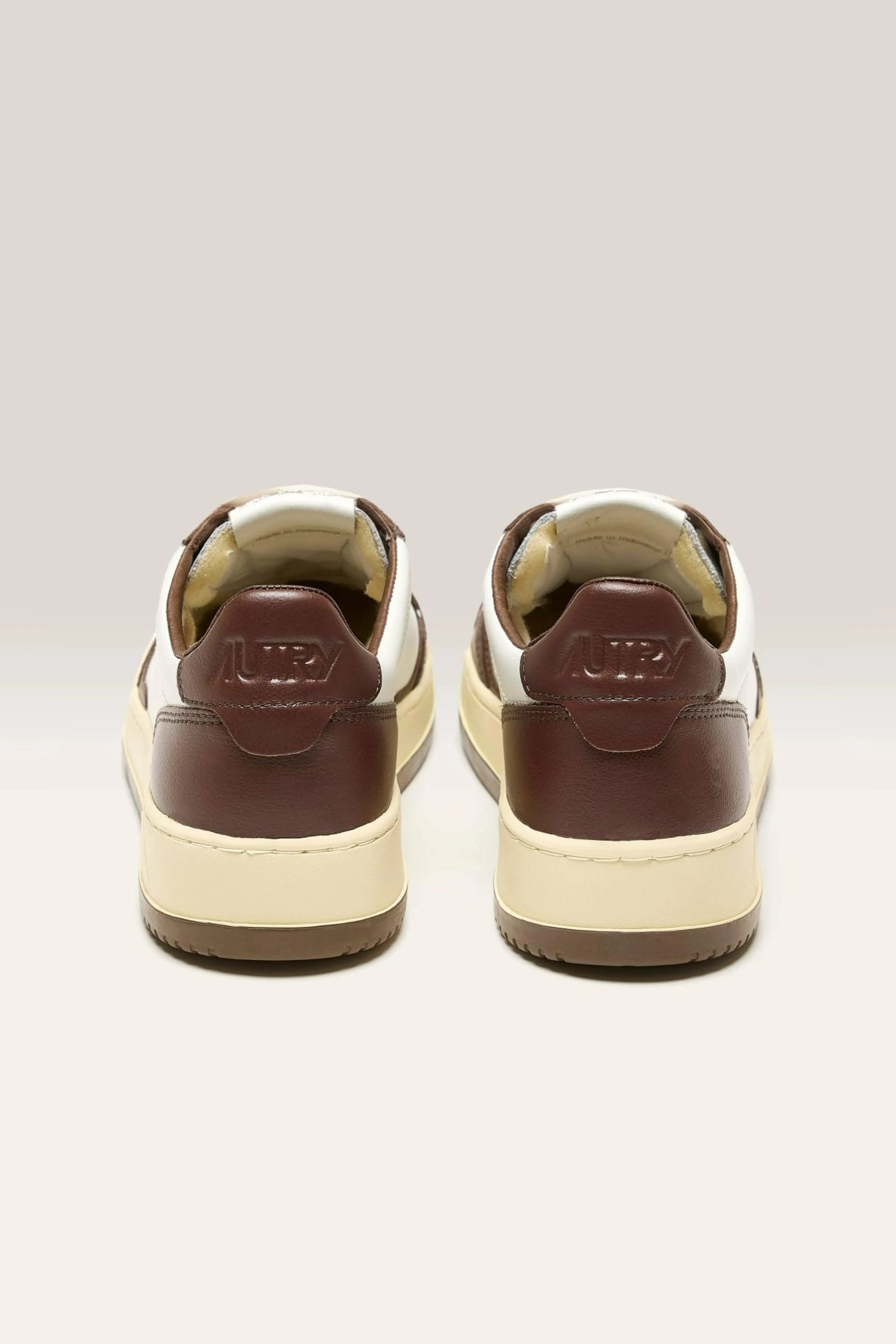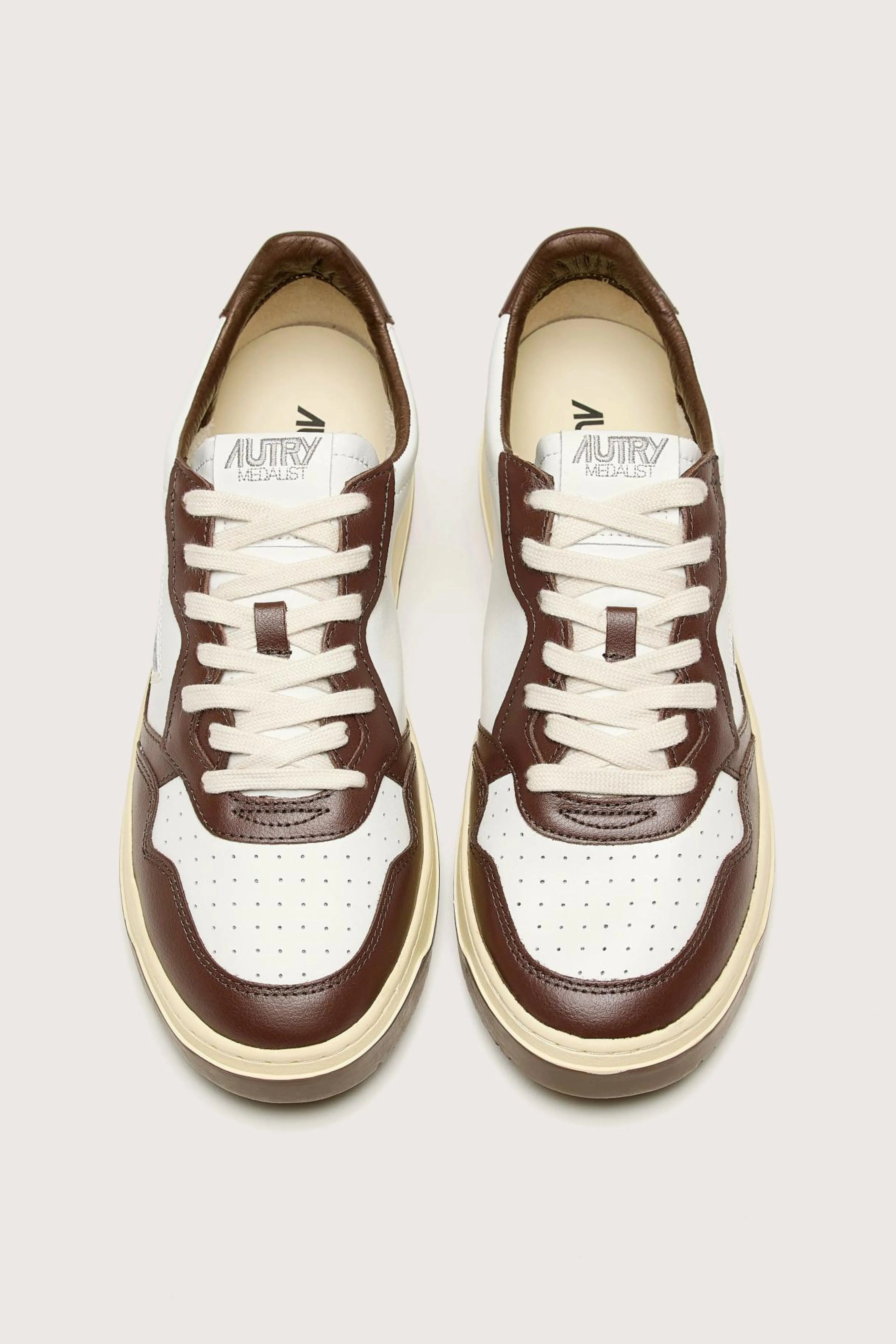 The Autry Medalist Low Bicolor sneaker features a white and chestnut supple leather upper with a perforated toe and black rubber outsole.