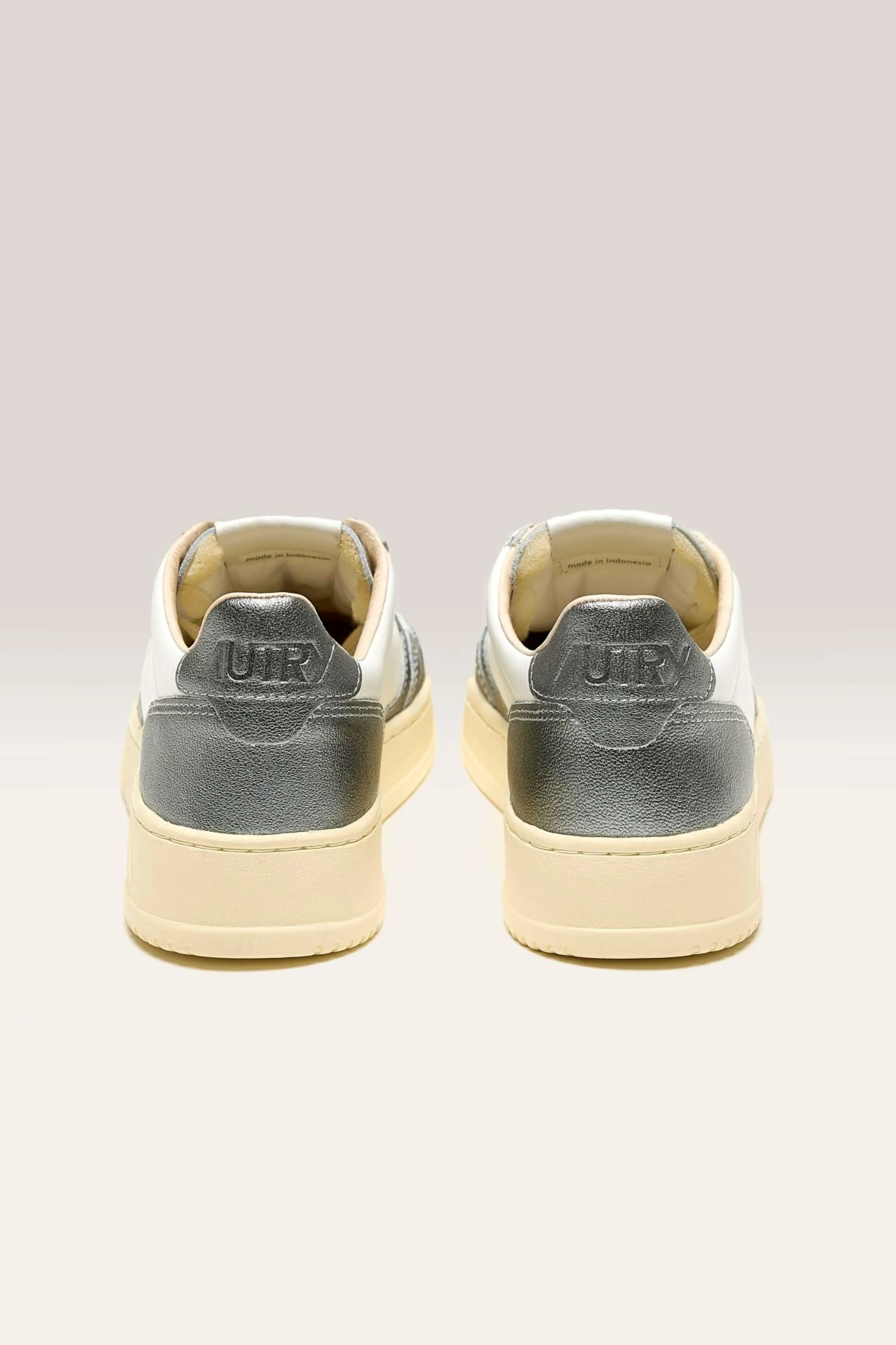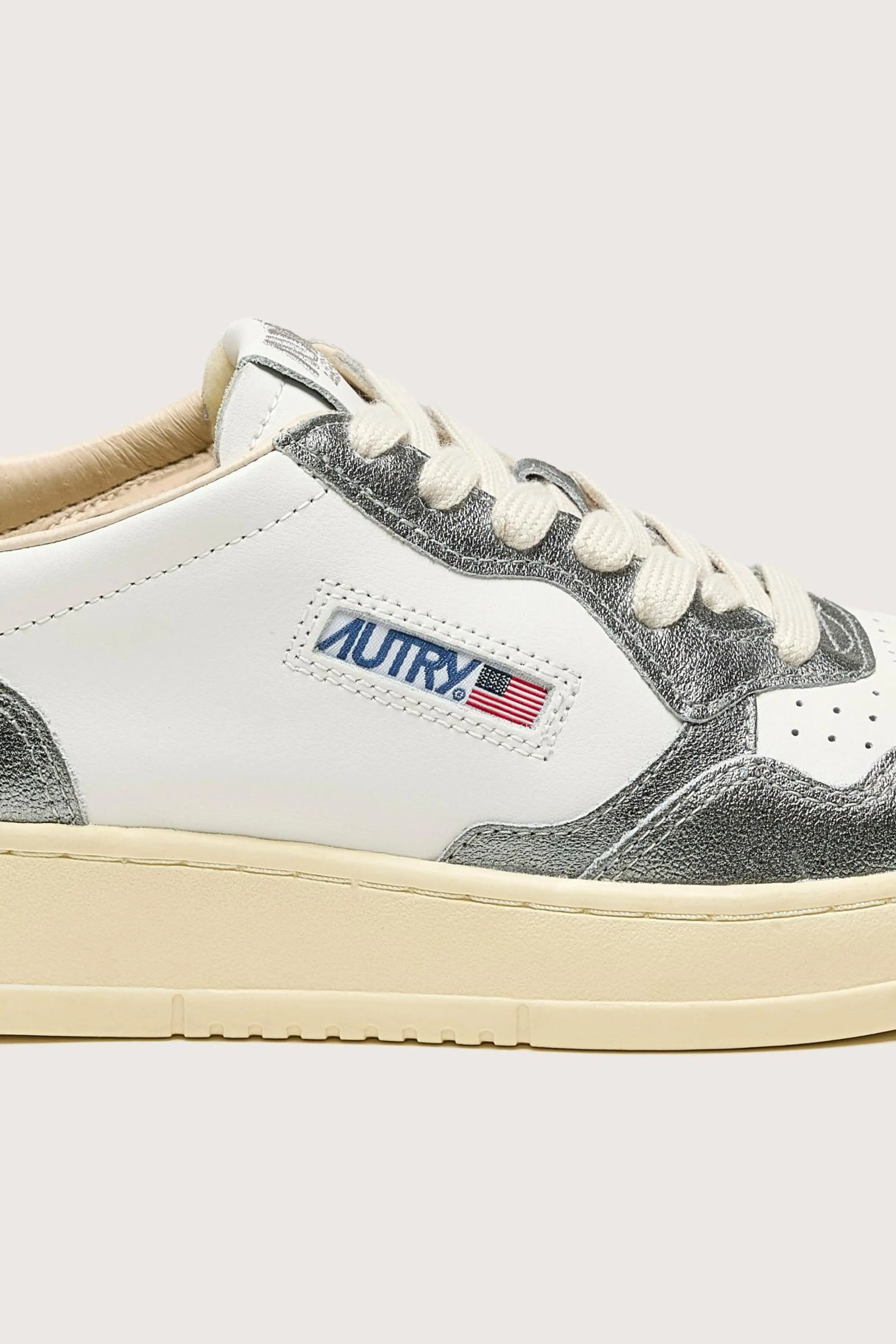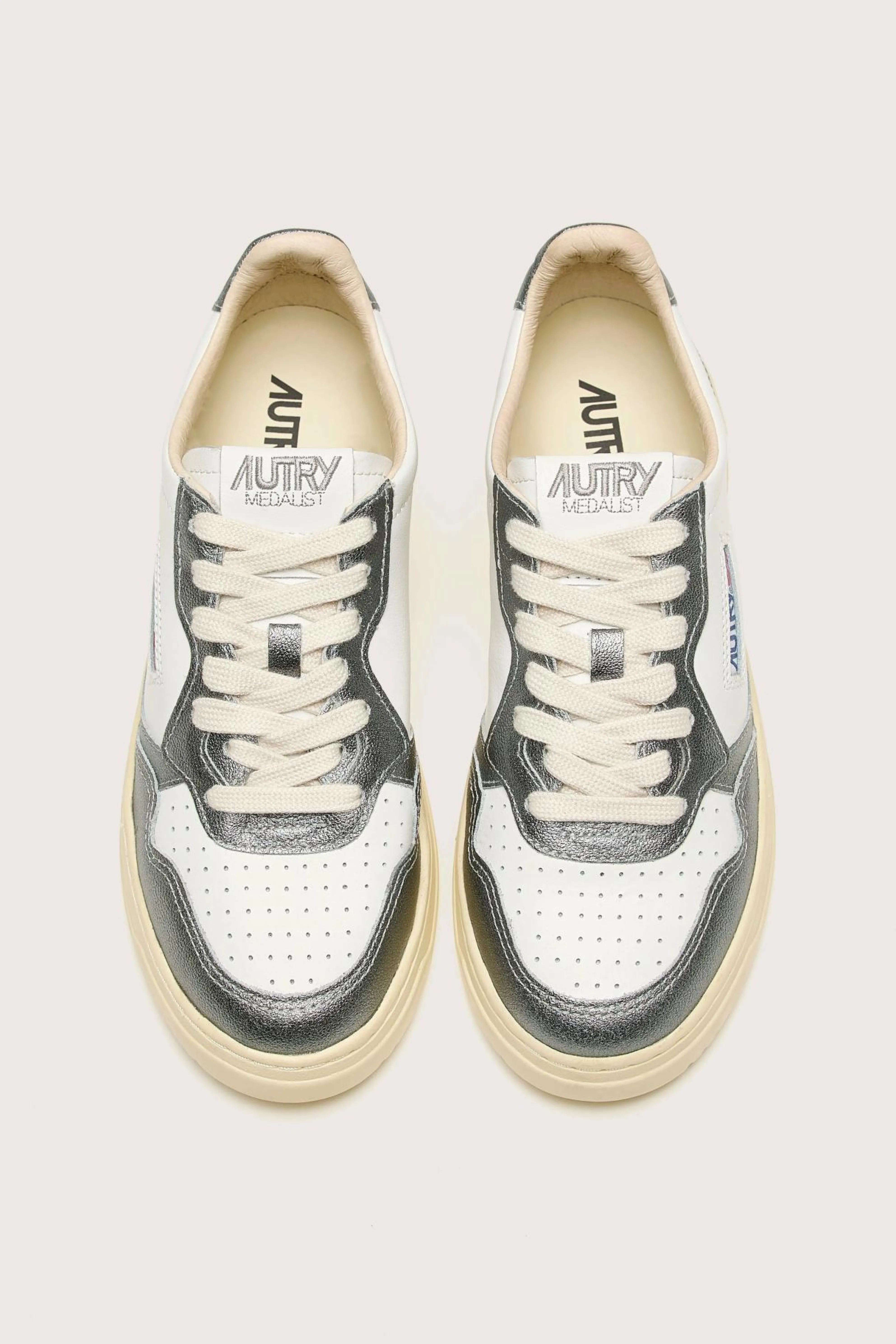 The Autry Medalist Low Bicolor sneaker features a white and steel grey supple leather upper with a perforated toe.