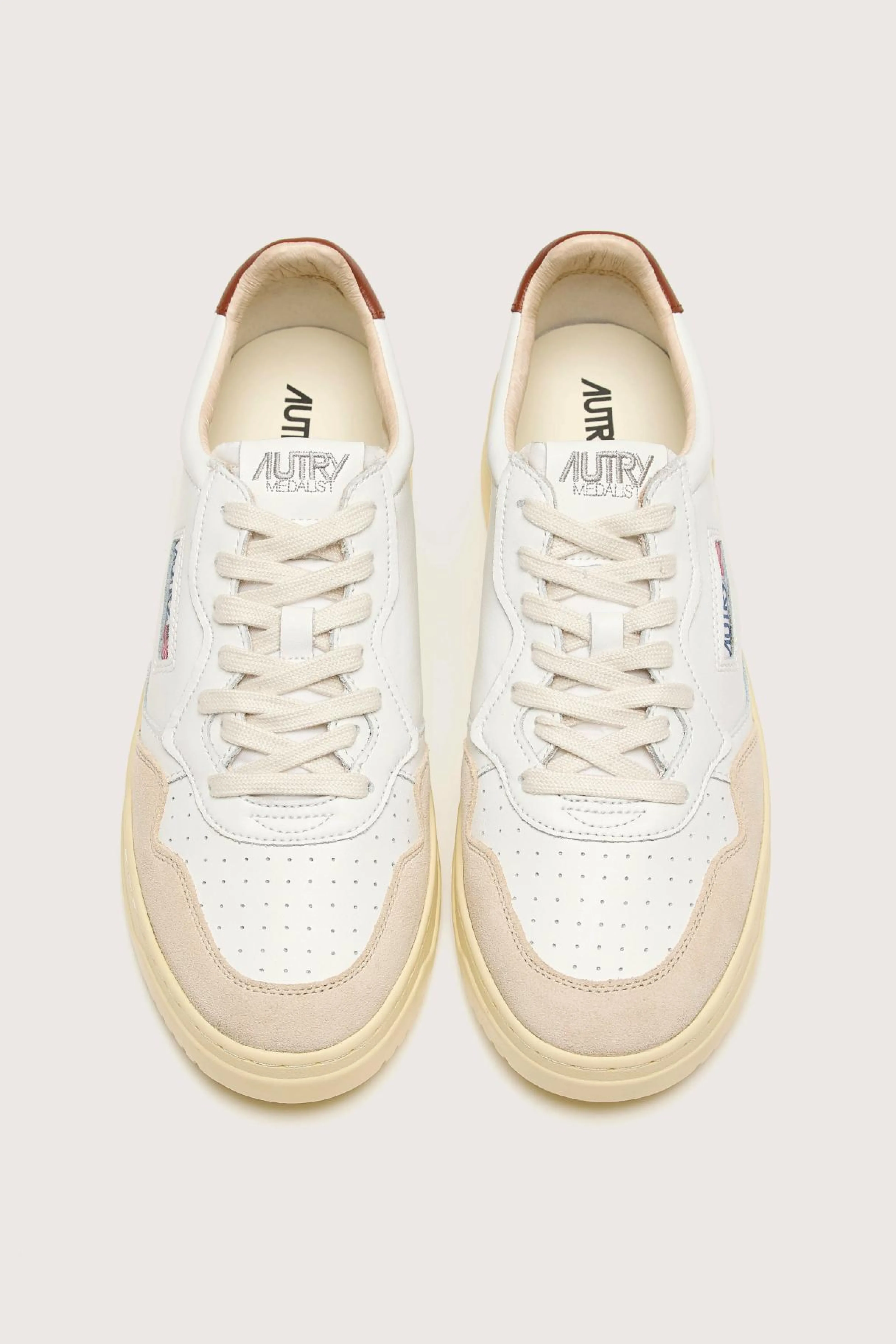 The Autry Medalist Low sneaker features a supple white leather upper, soft suede panels, and a perforated toe.