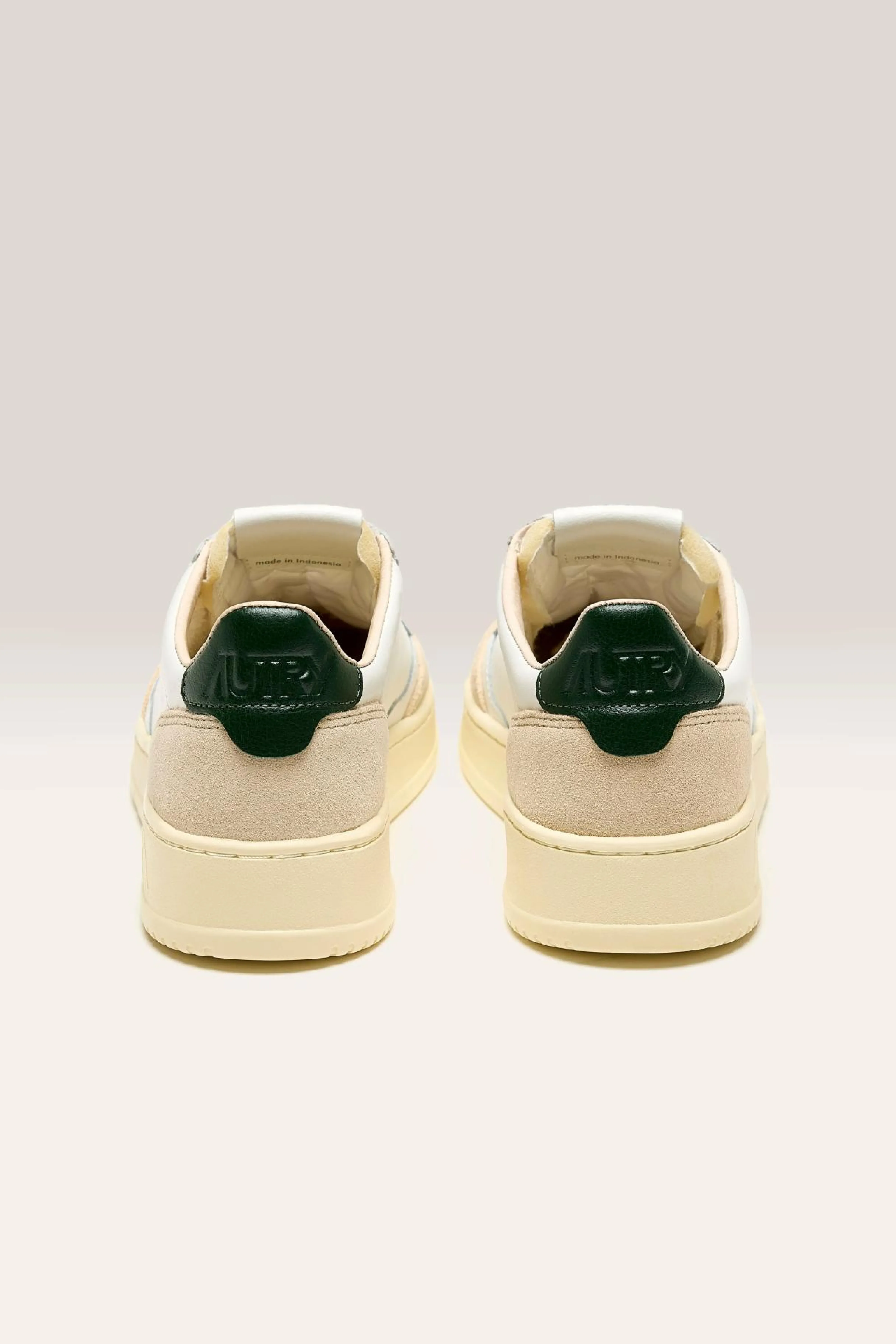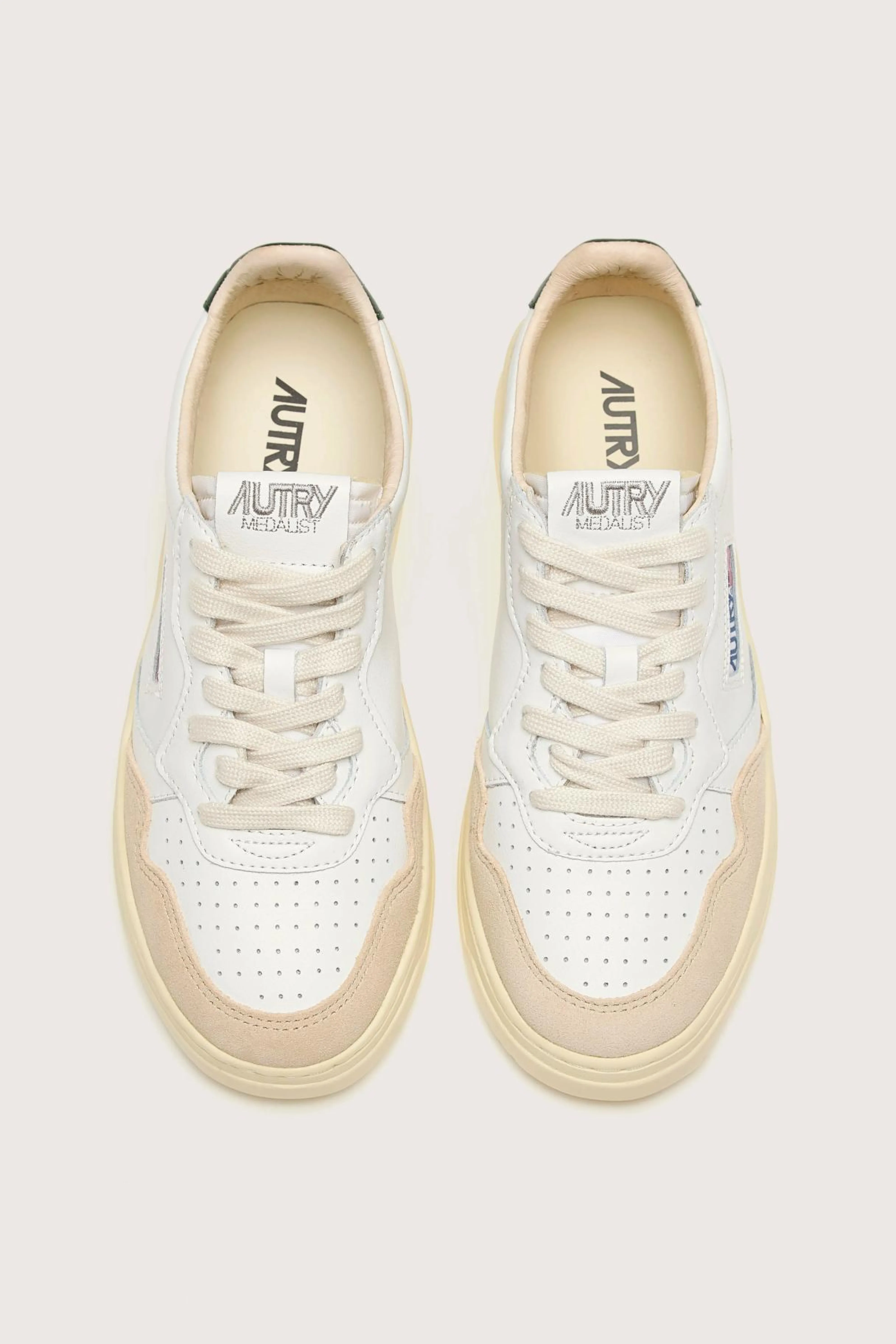 The Autry Medalist Low sneaker features a supple white leather upper, soft suede panels, and a perforated toe.