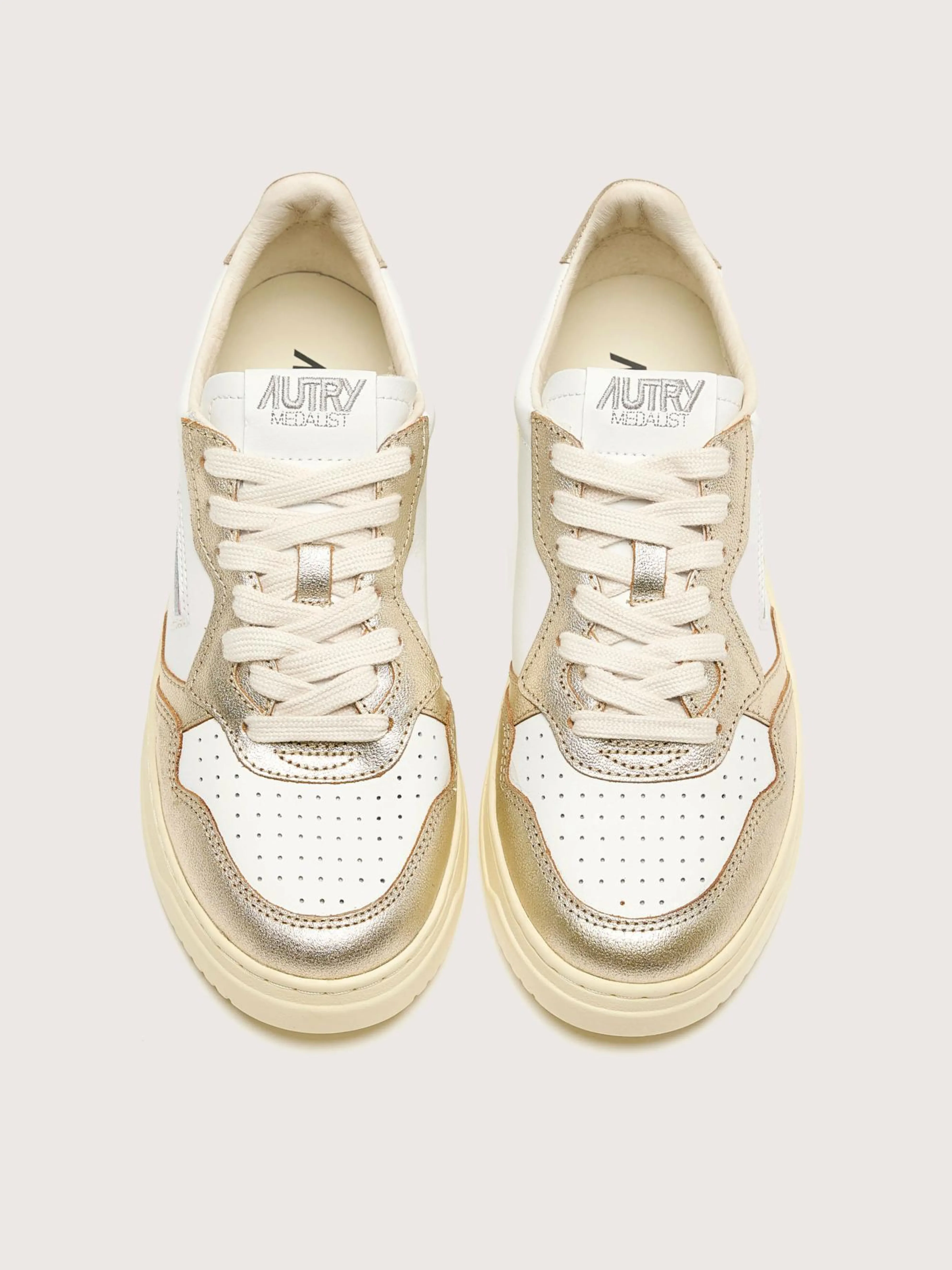 De Autry Medalist Low Bicolor sneakers hebben een wit en platina soepel lederen bovenwerk met een geperforeerde neus.