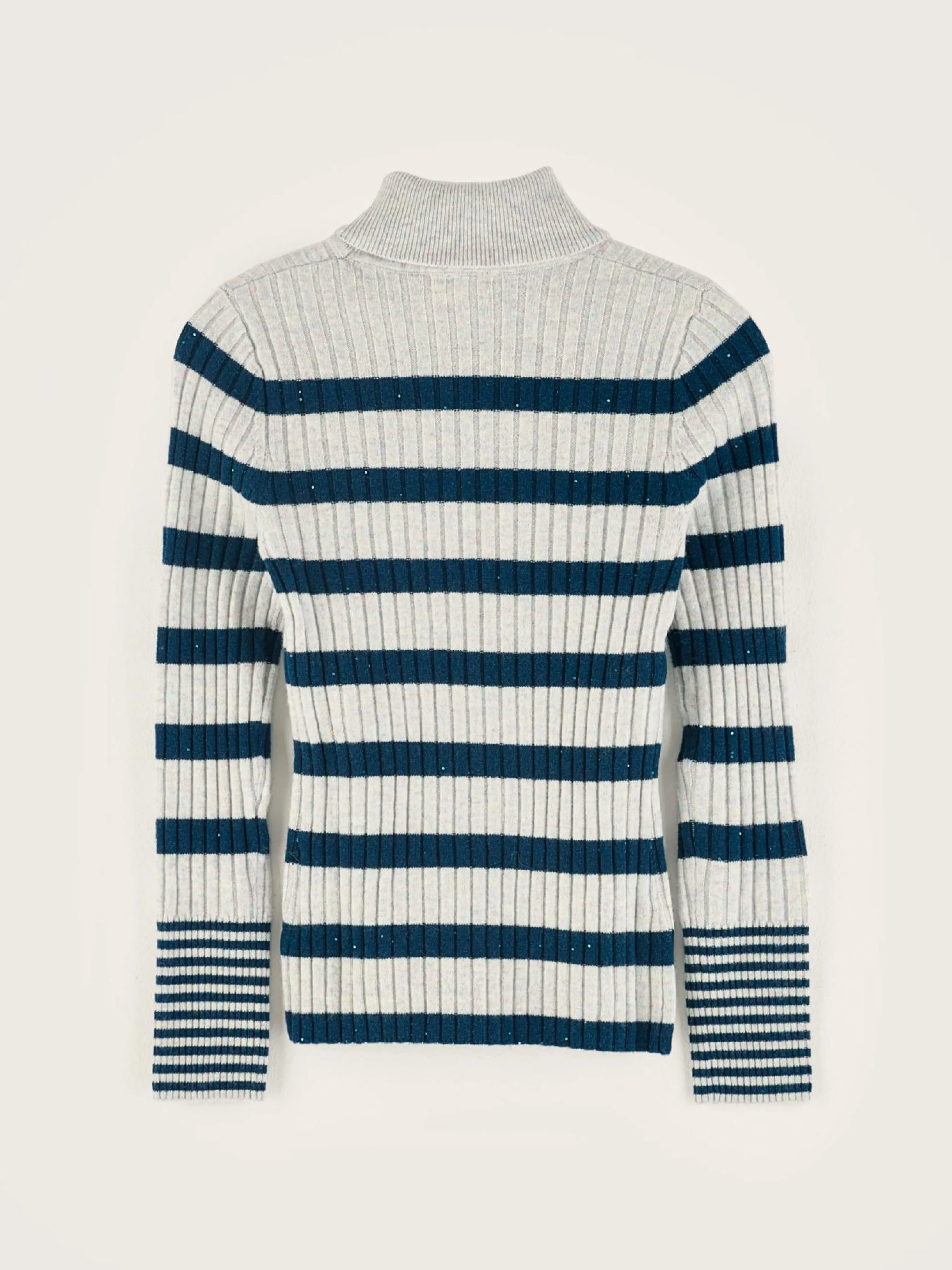 Aansluitende trui met hoge hals, van ribtricot. Met merinowol en glanzende strepen.
