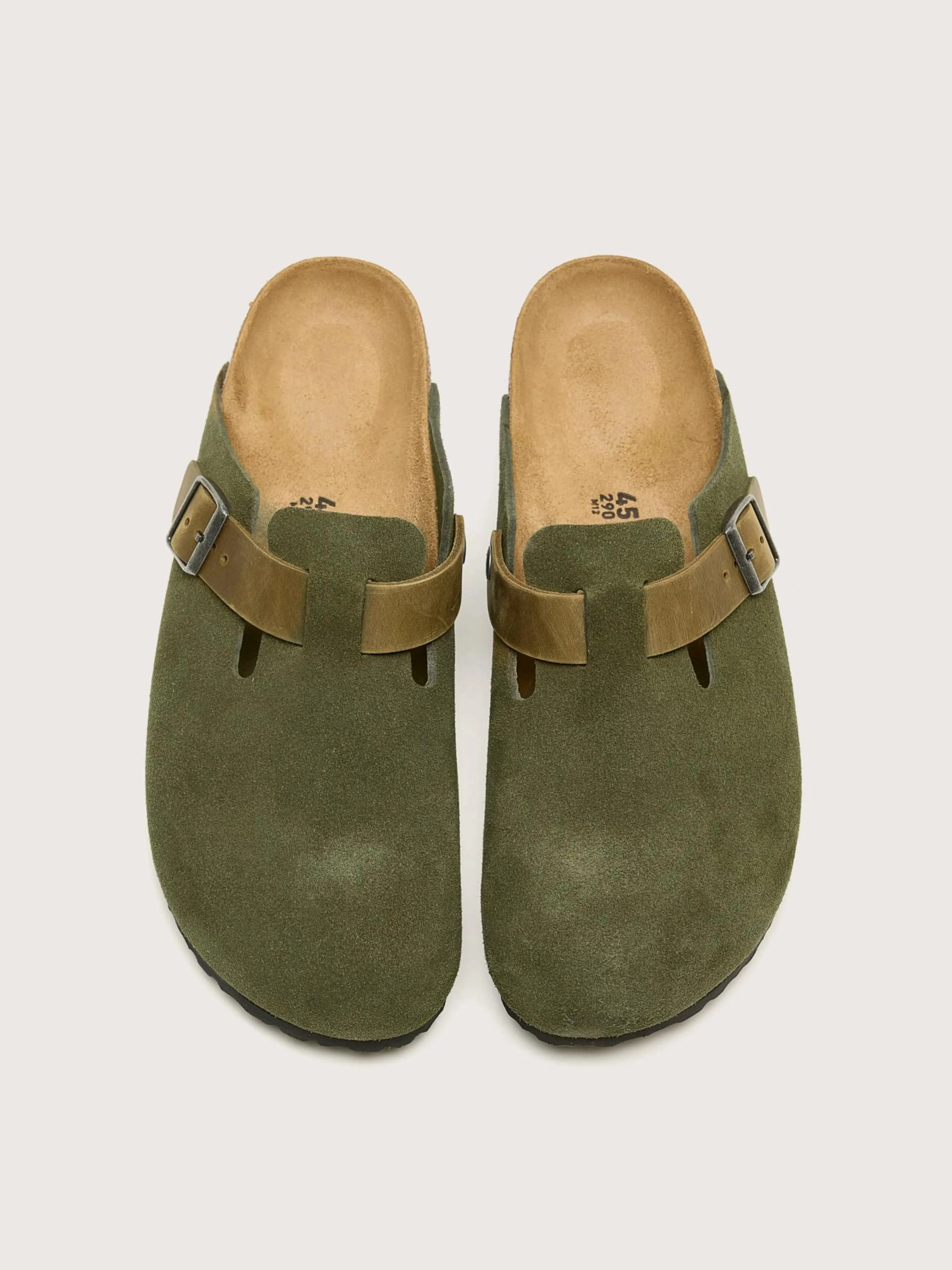 De Birkenstock Boston Gemengd Leder klompen hebben een zacht suède bovenwerk met een geolied lederen verstelbaar riempje en een kurken voetbed gevoerd met suède.