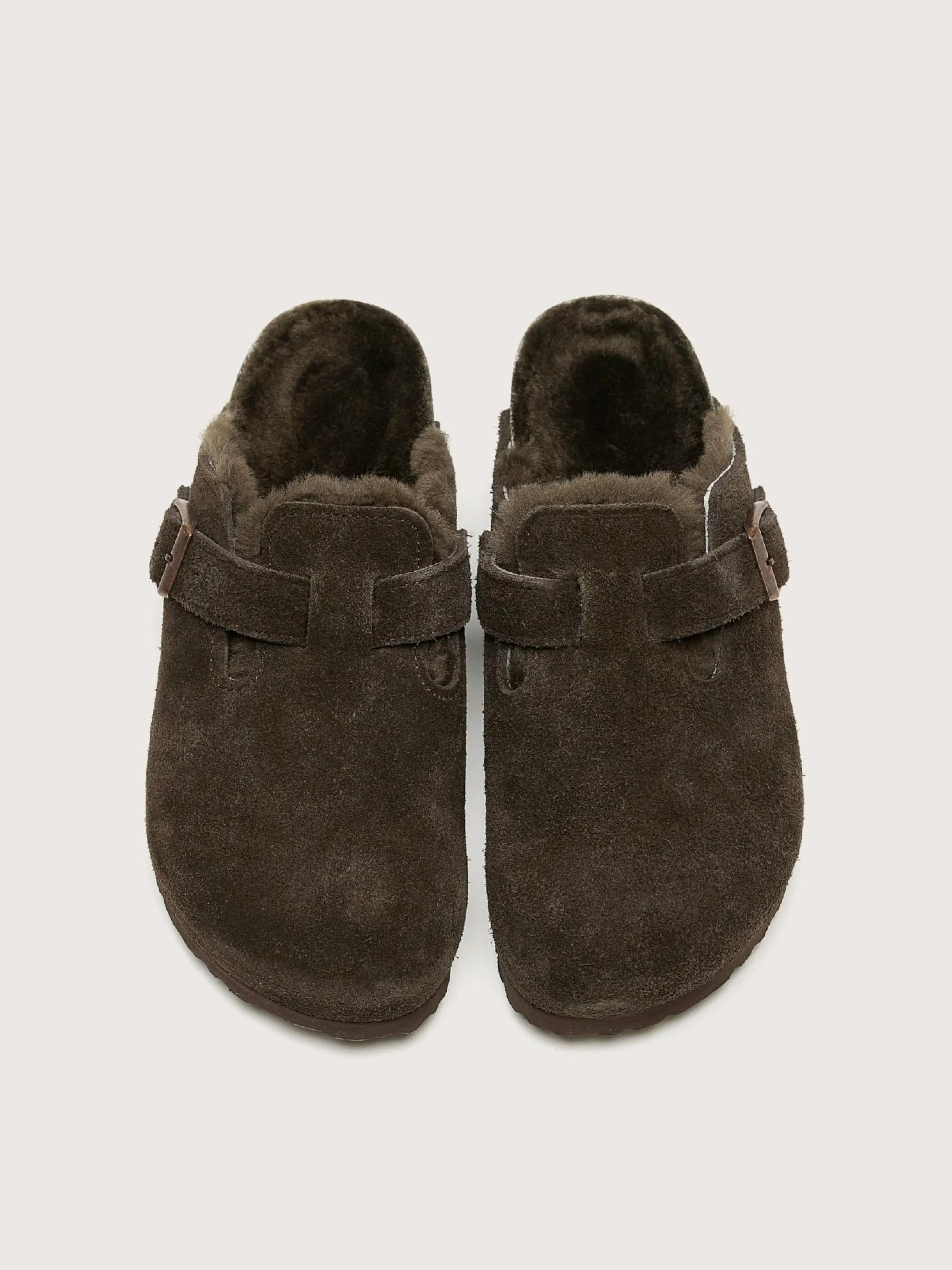 De Birkenstock Boston Shearling klompen hebben een premium suède bovenwerk met voering van natuurlijk lamsleder en een iconisch anatomisch gevormd kurken voetbed.