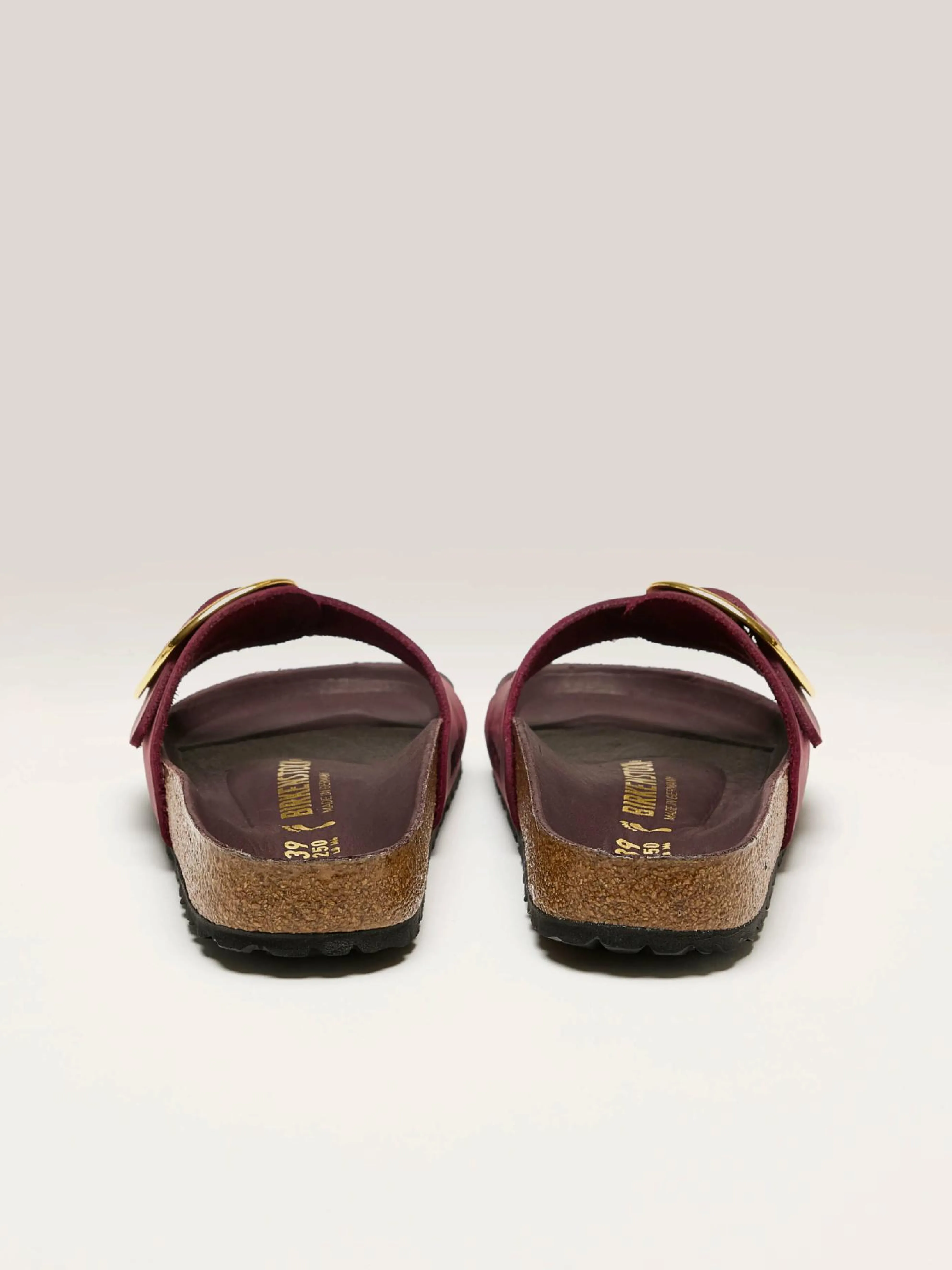 De Birkenstock Madrid Big Buckle sandalen hebben een grote metalen gesp, een zachte lederen voering en een dik bovenwerk van geolied nubuckleder met onafgewerkte randen.