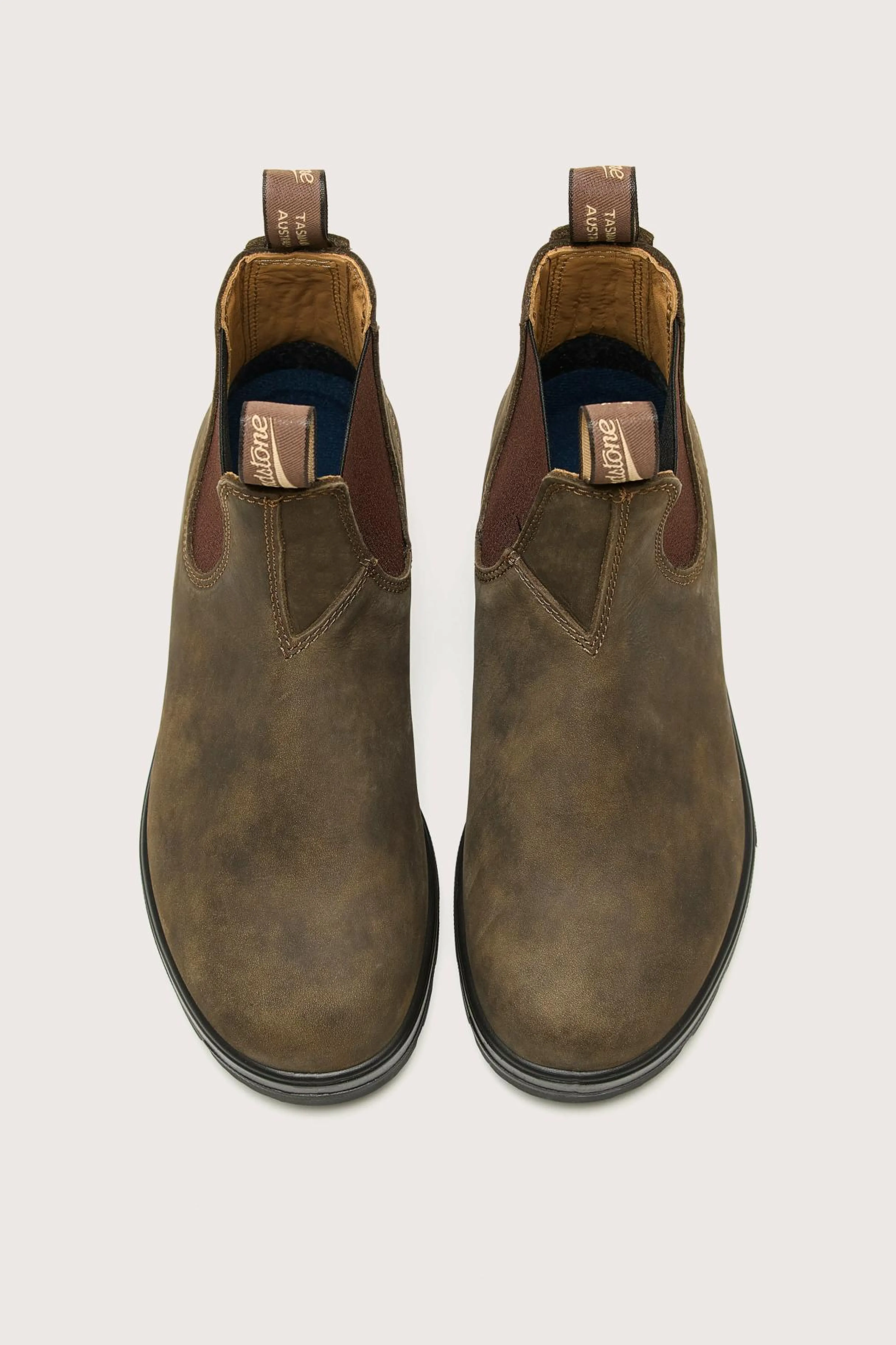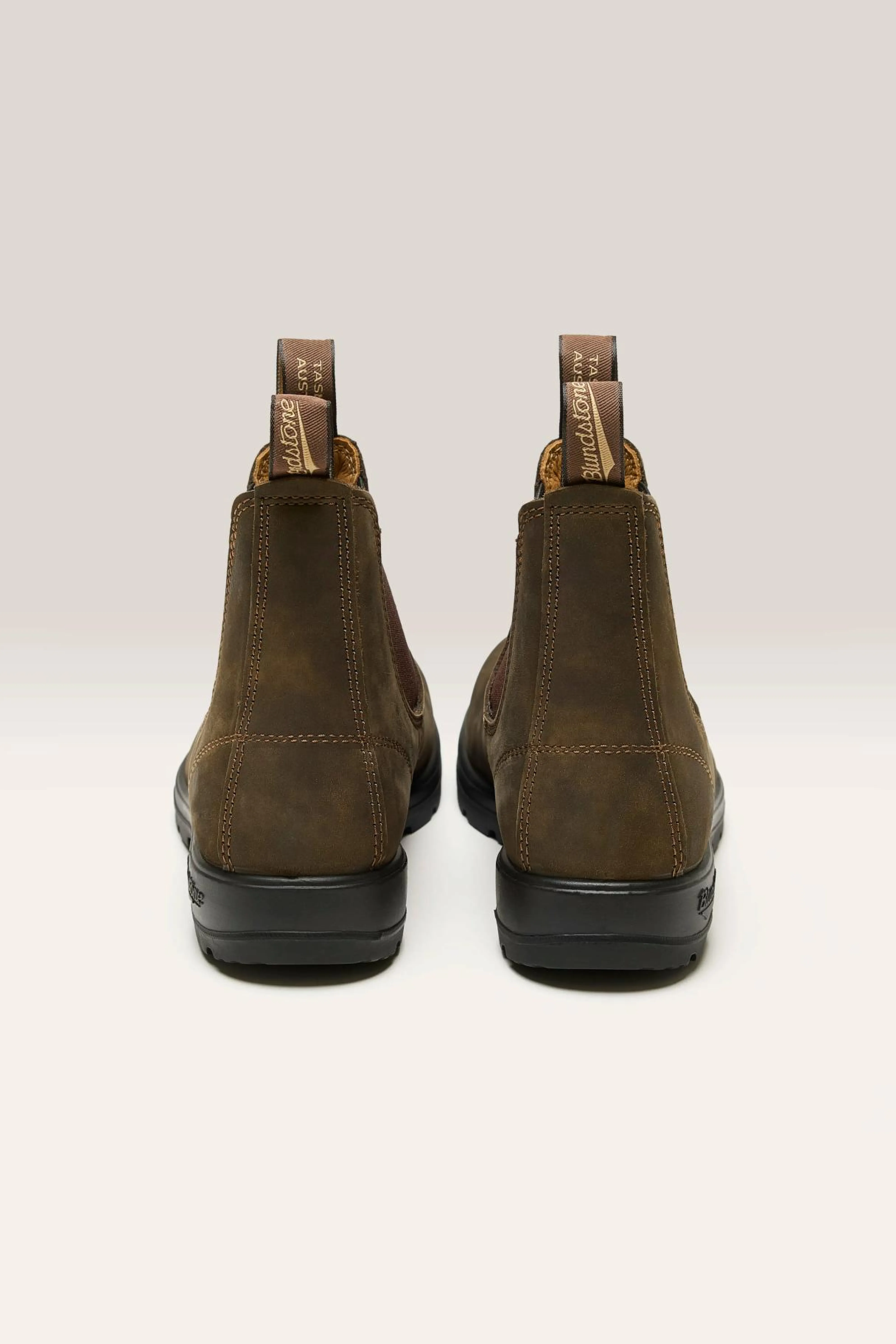 The signature Blundstone #585 classic Chelsea boots feature rustic brown premium water-resistant leather with elastic side panels and SPS Max Comfort system.