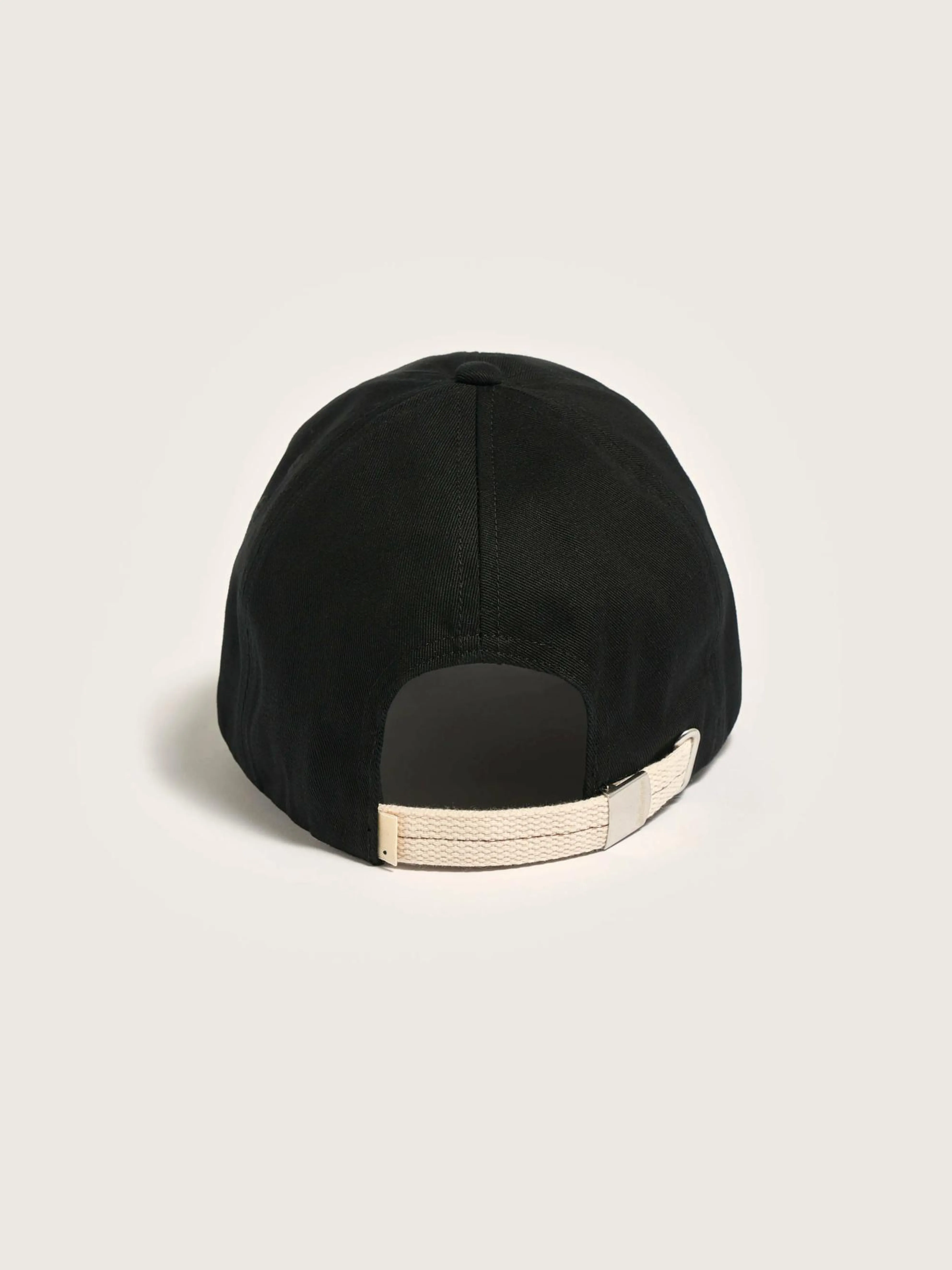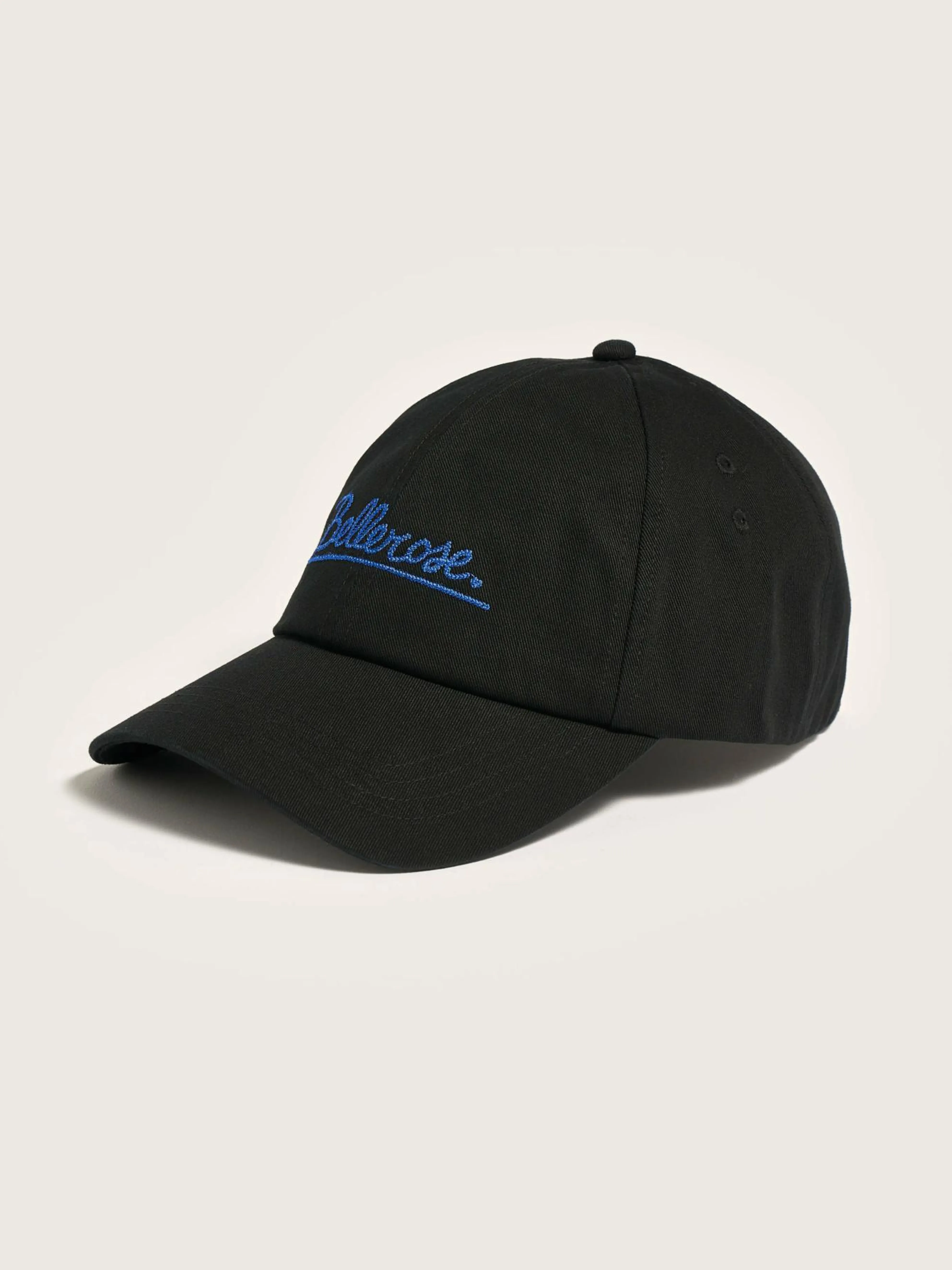 Klassieke 6-panel pet van zwart katoen met Bellerose blauw borduursel op de voorkant.