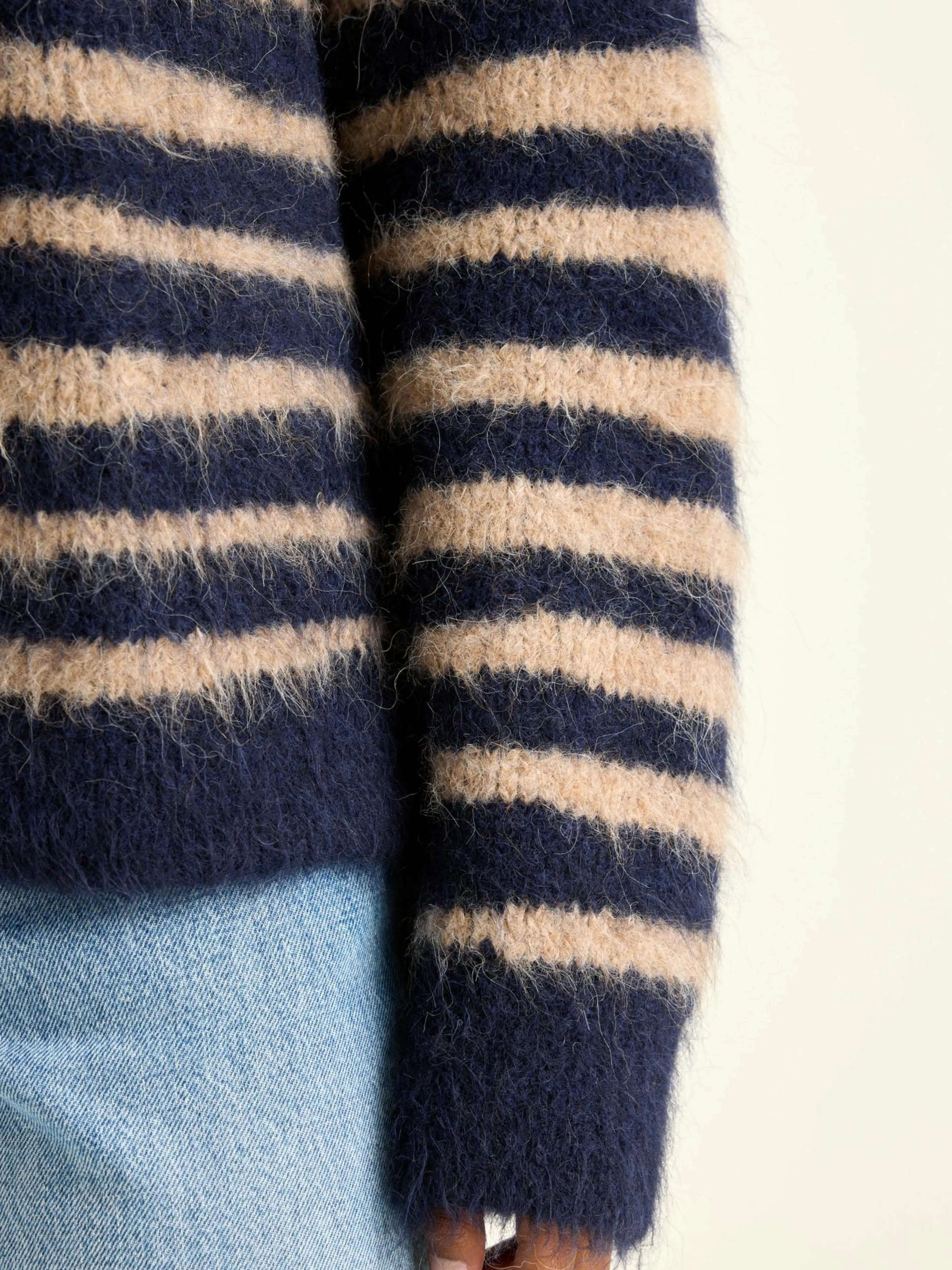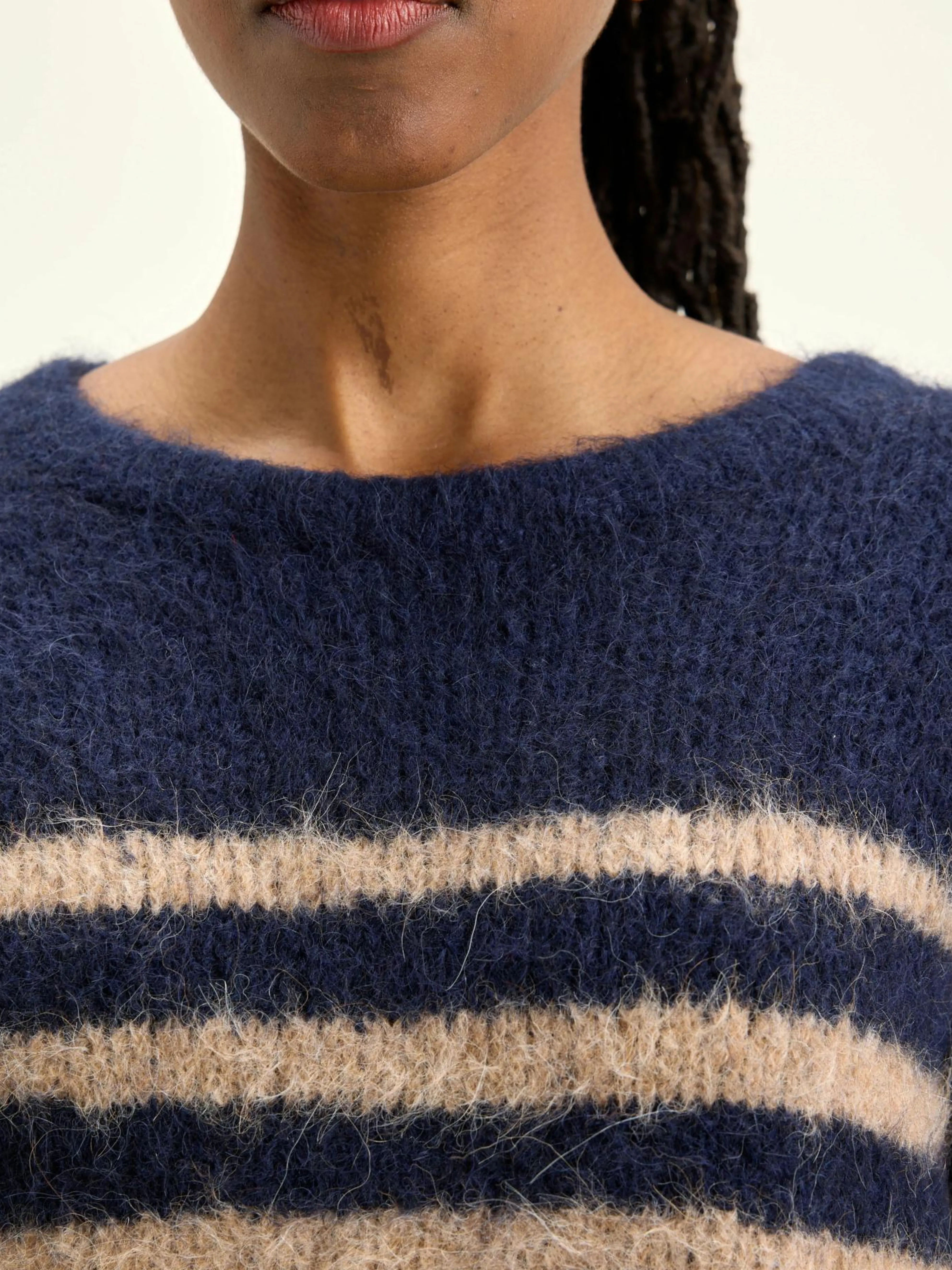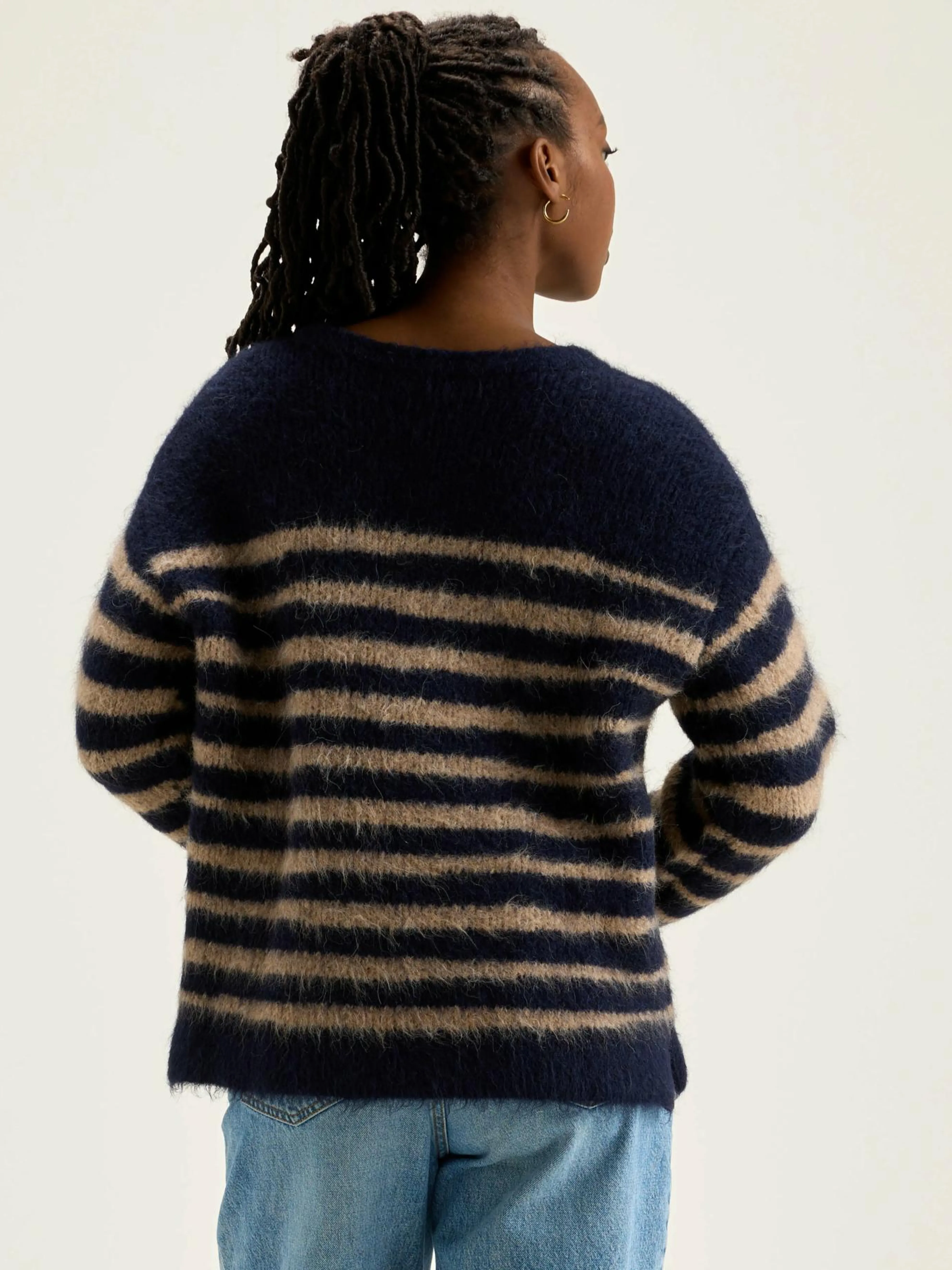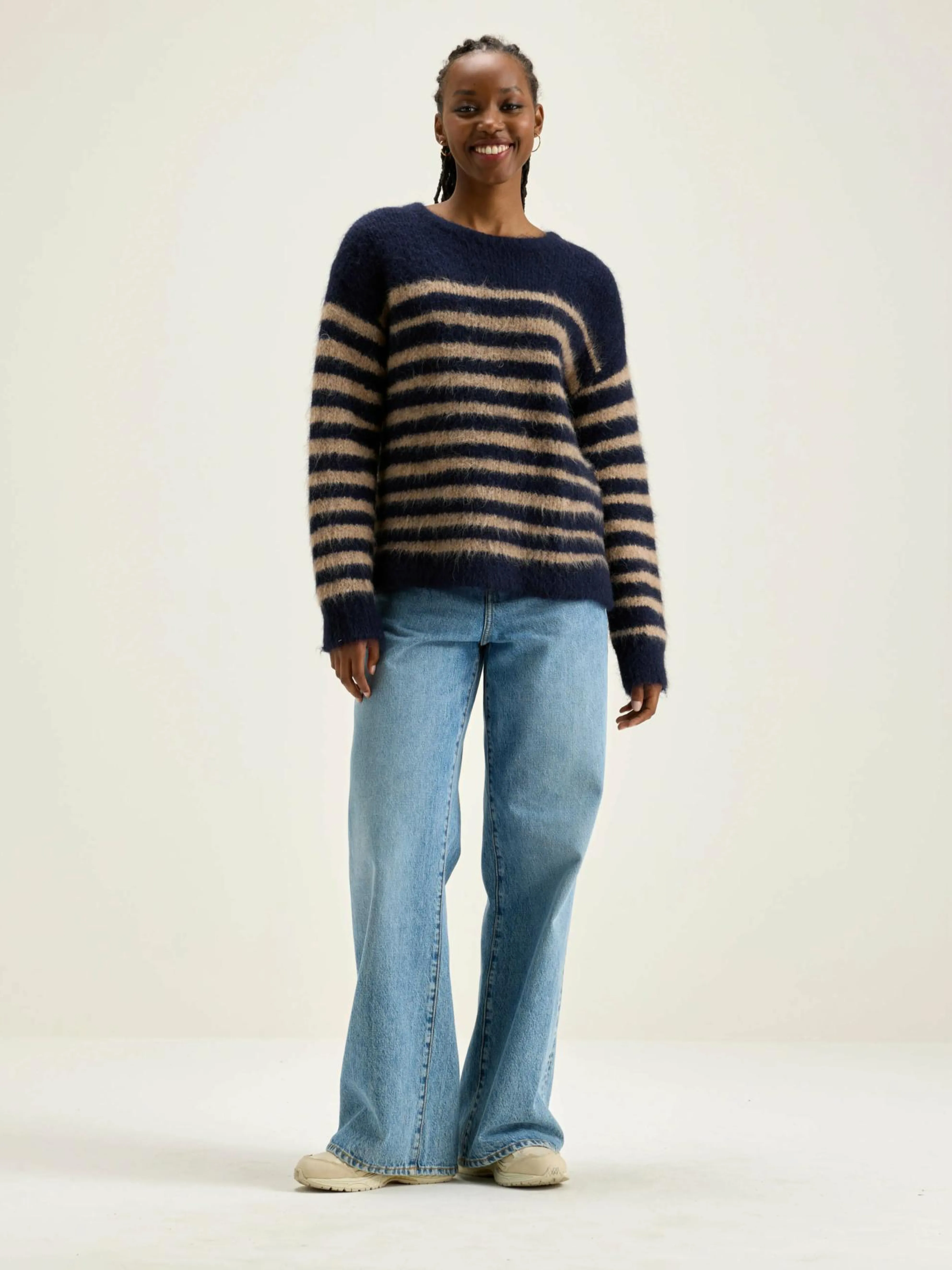 Klassieke trui met onregelmatige marineblauwe en beige strepen.