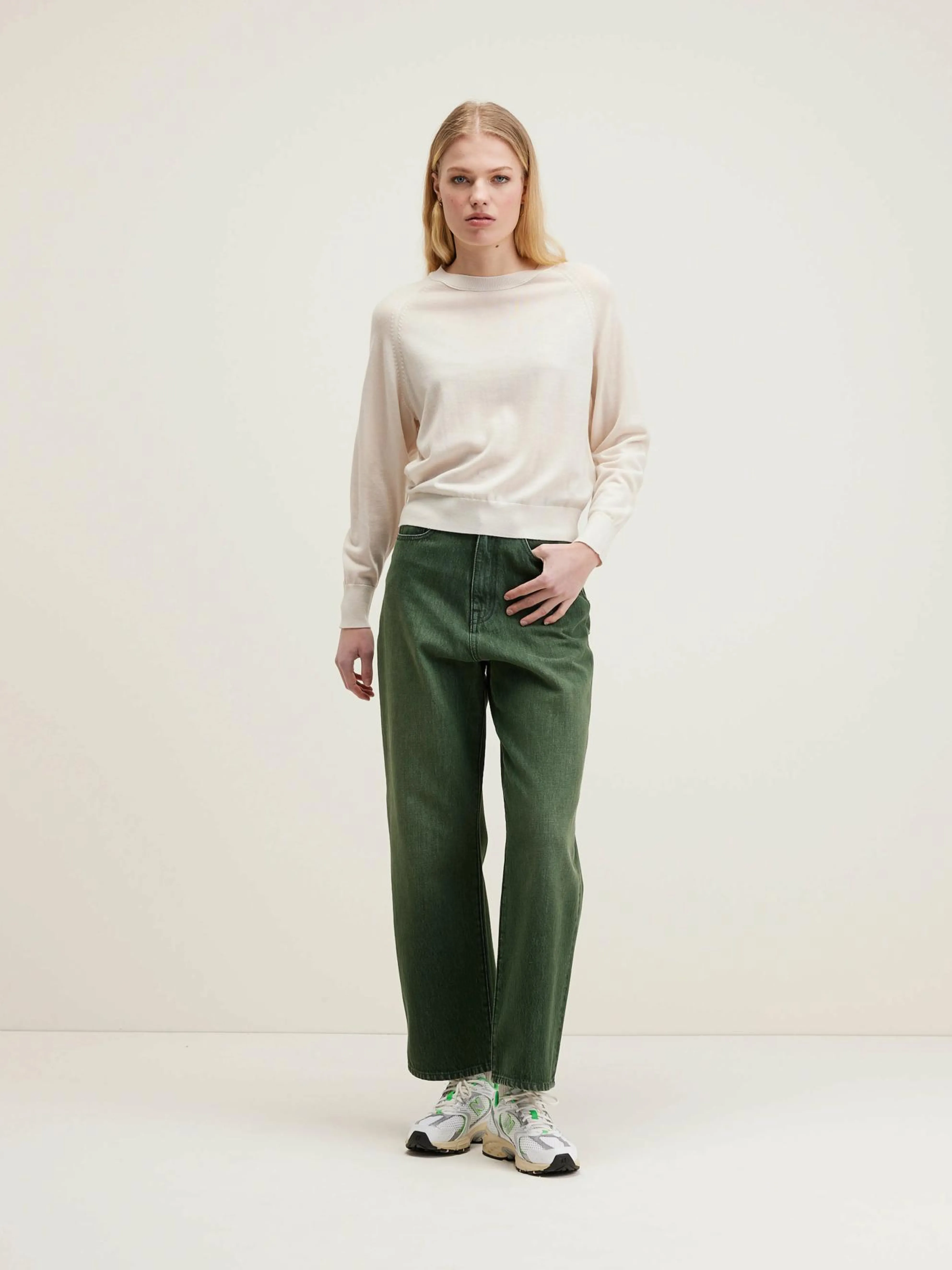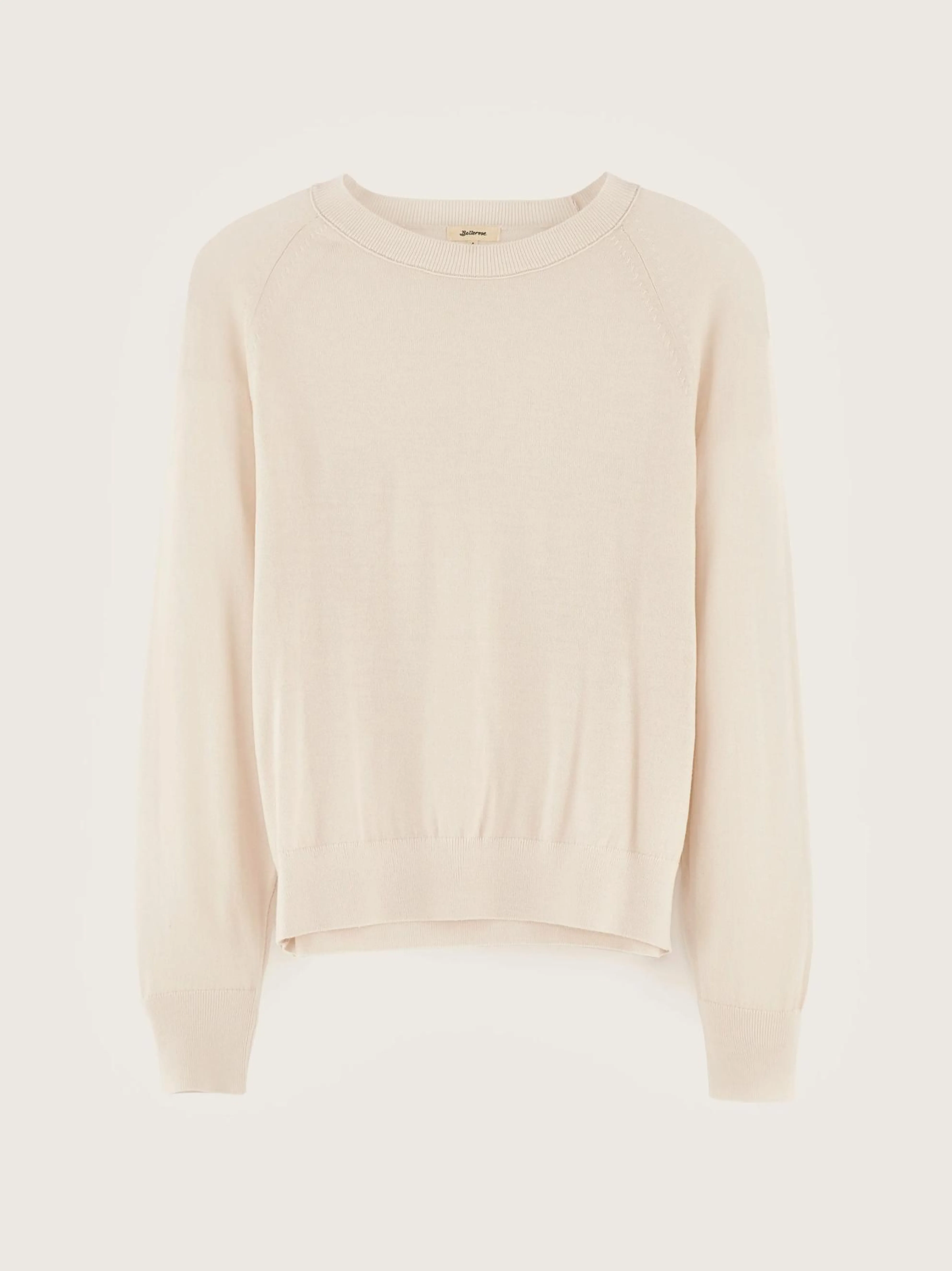 Klassieke, ivoorwitte trui van merinowol, met zadelmouwen.