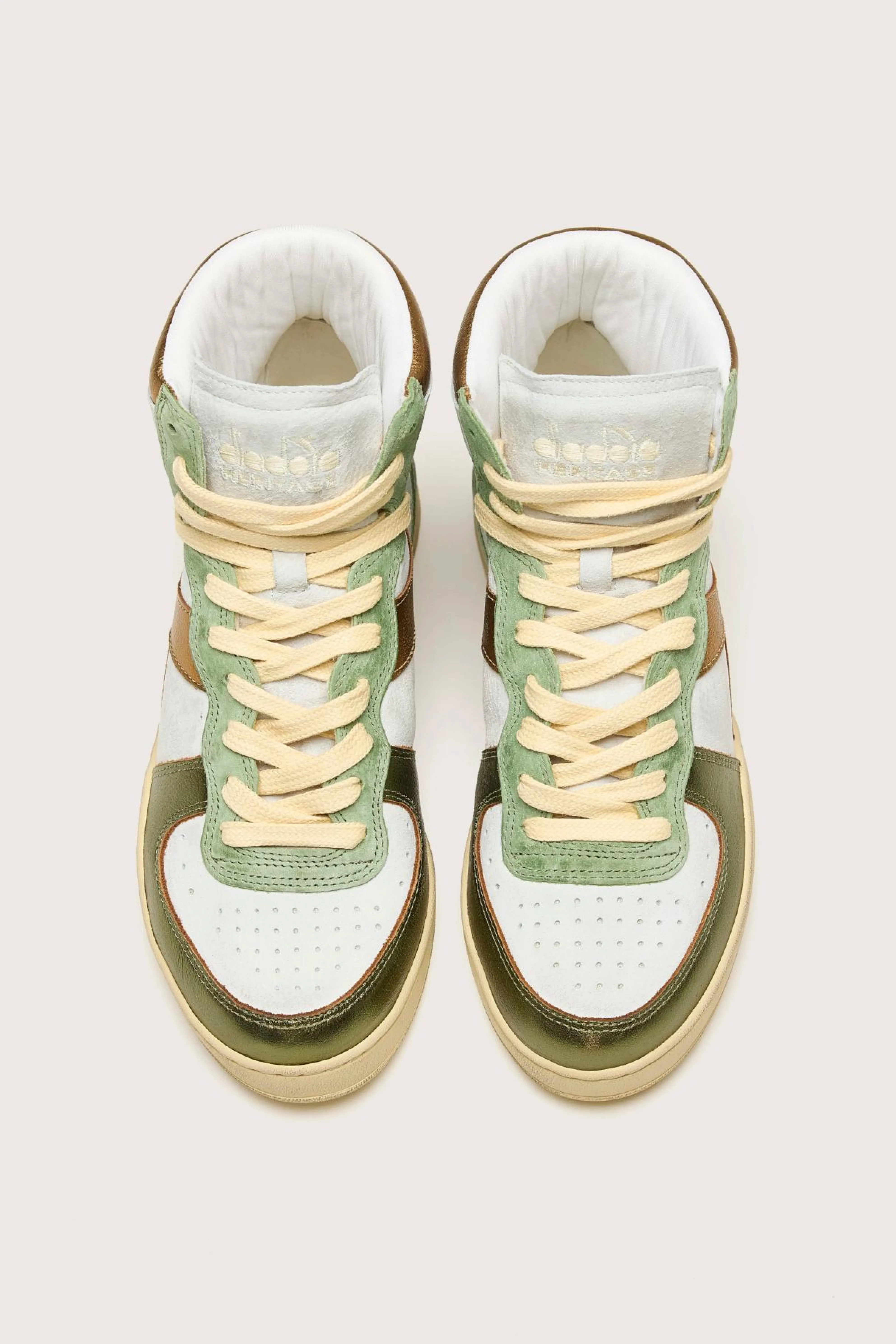 The Diadora Mi Basket Metal Pigskin Used heritage sneakers feature metallic-effect foiled leather with a distressed-look stonewash treatment.