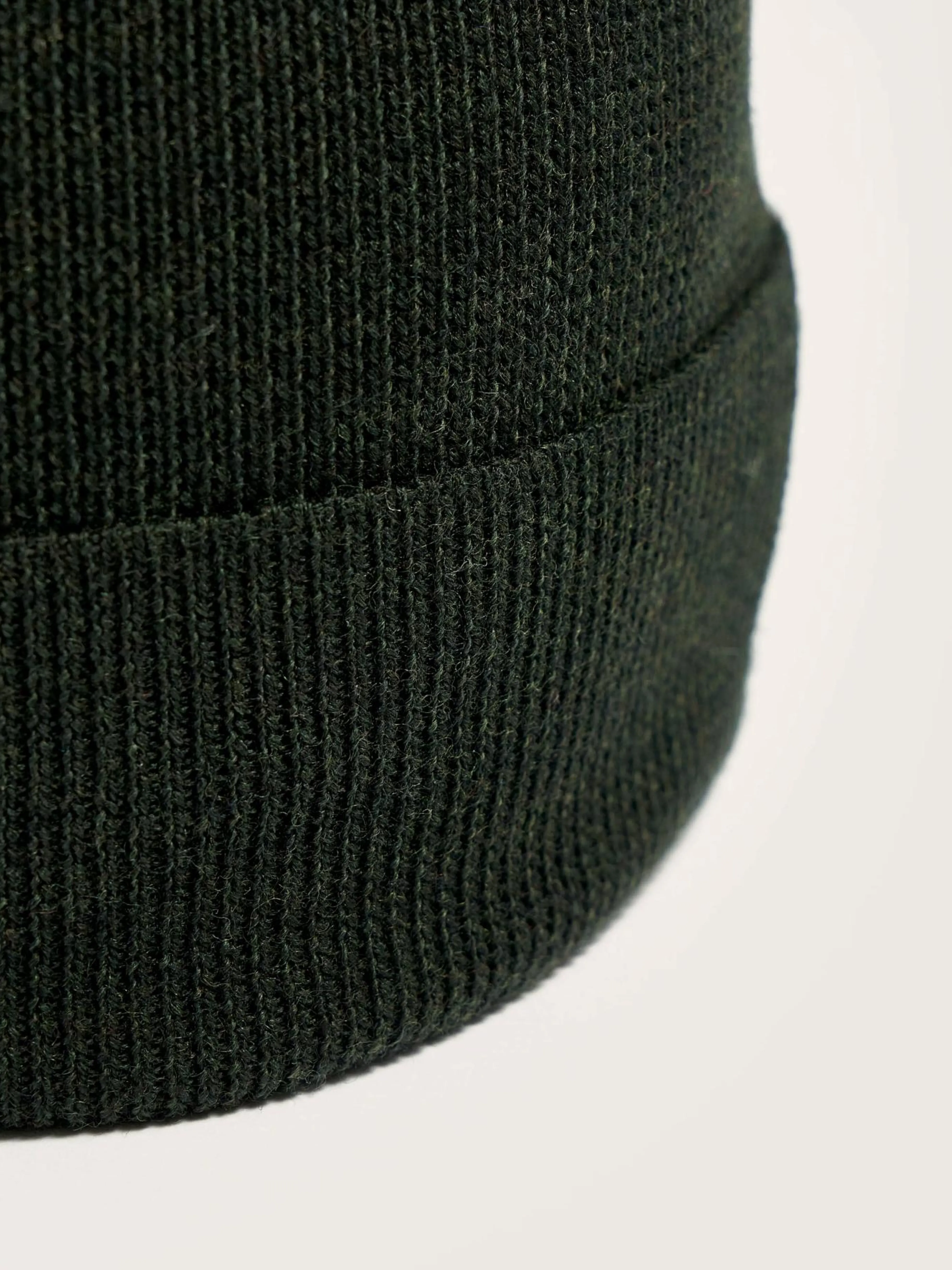 Klassieke geribbelde beanie van bosgroene, superfijne merinowol.