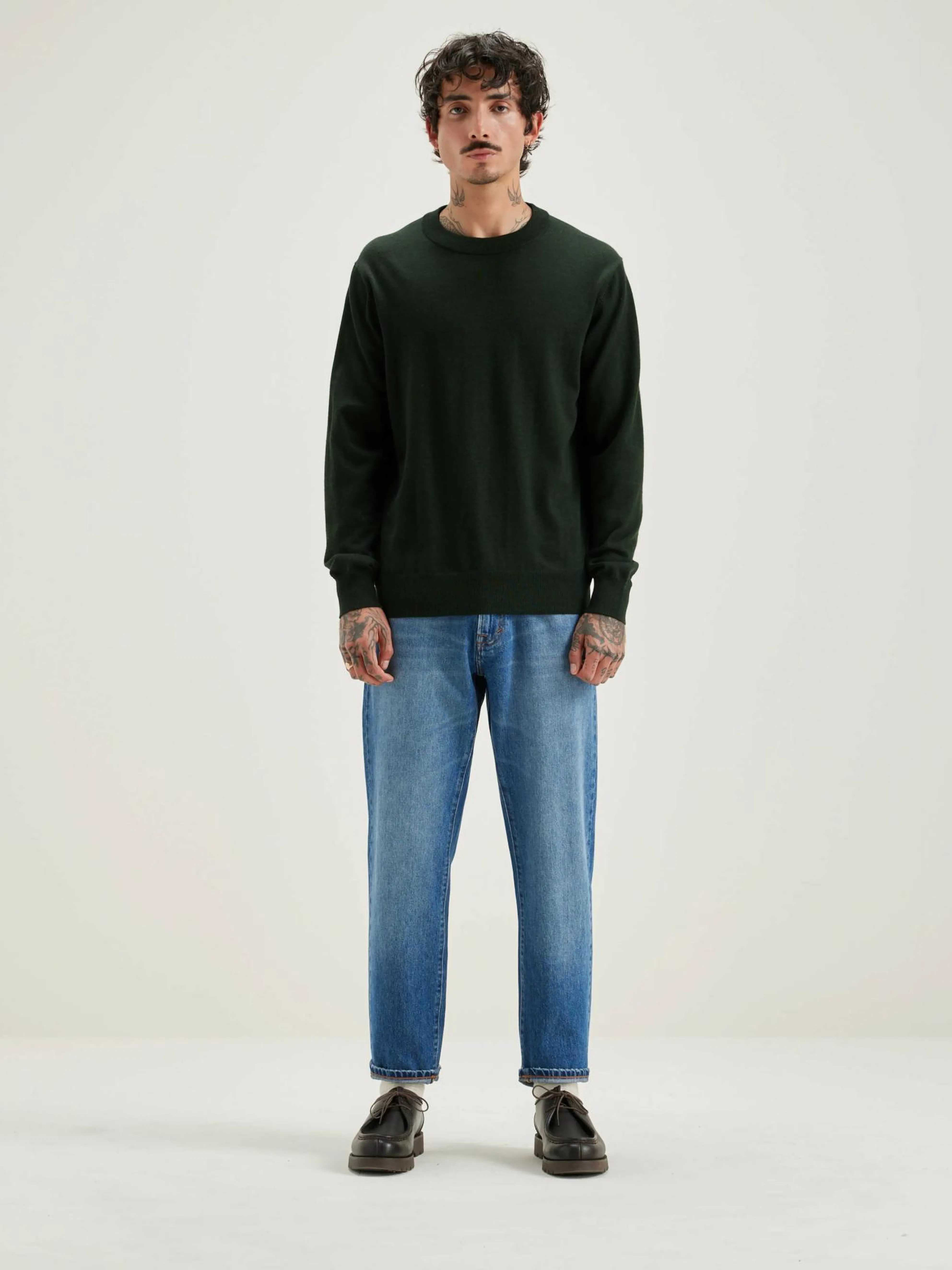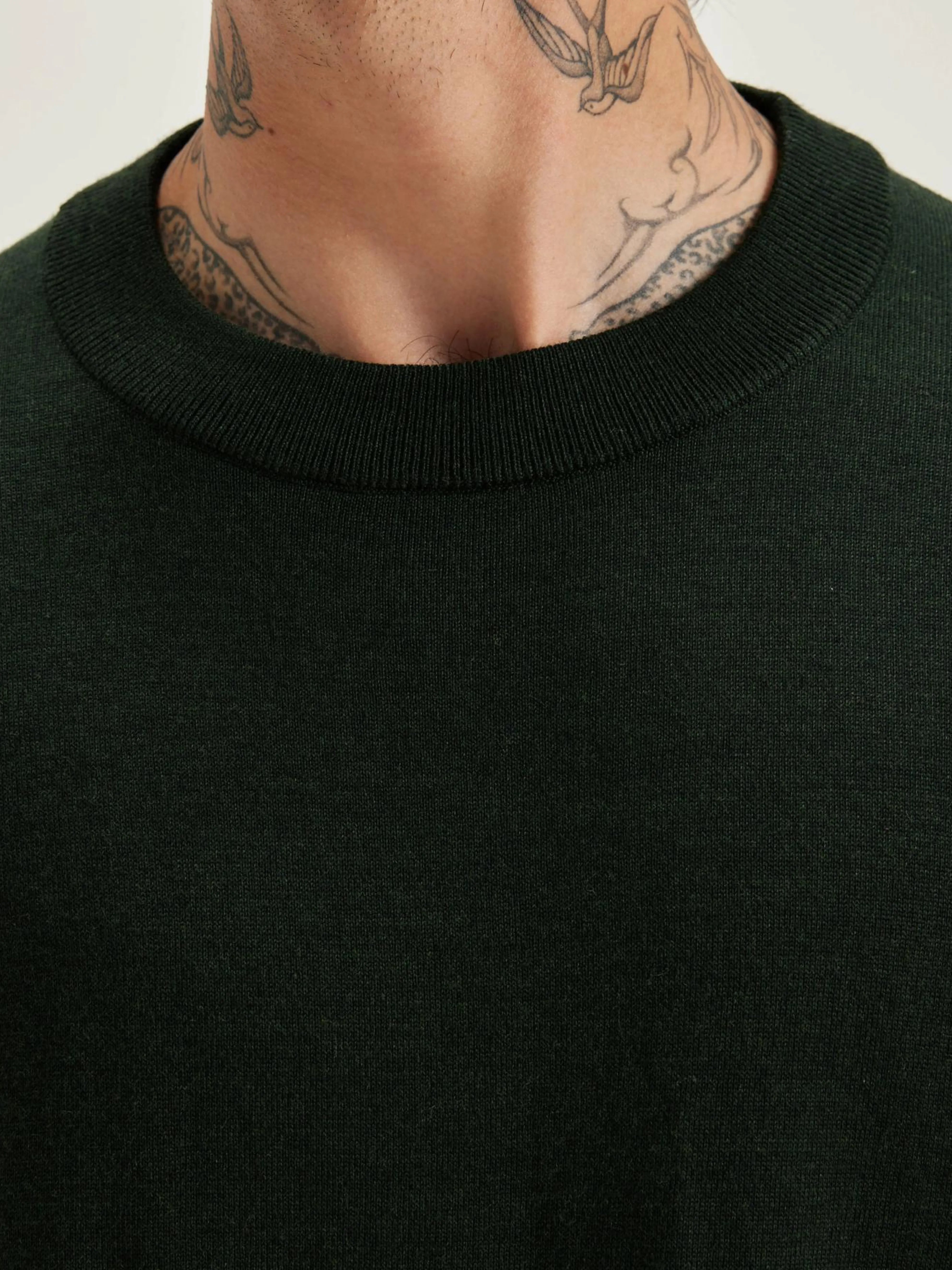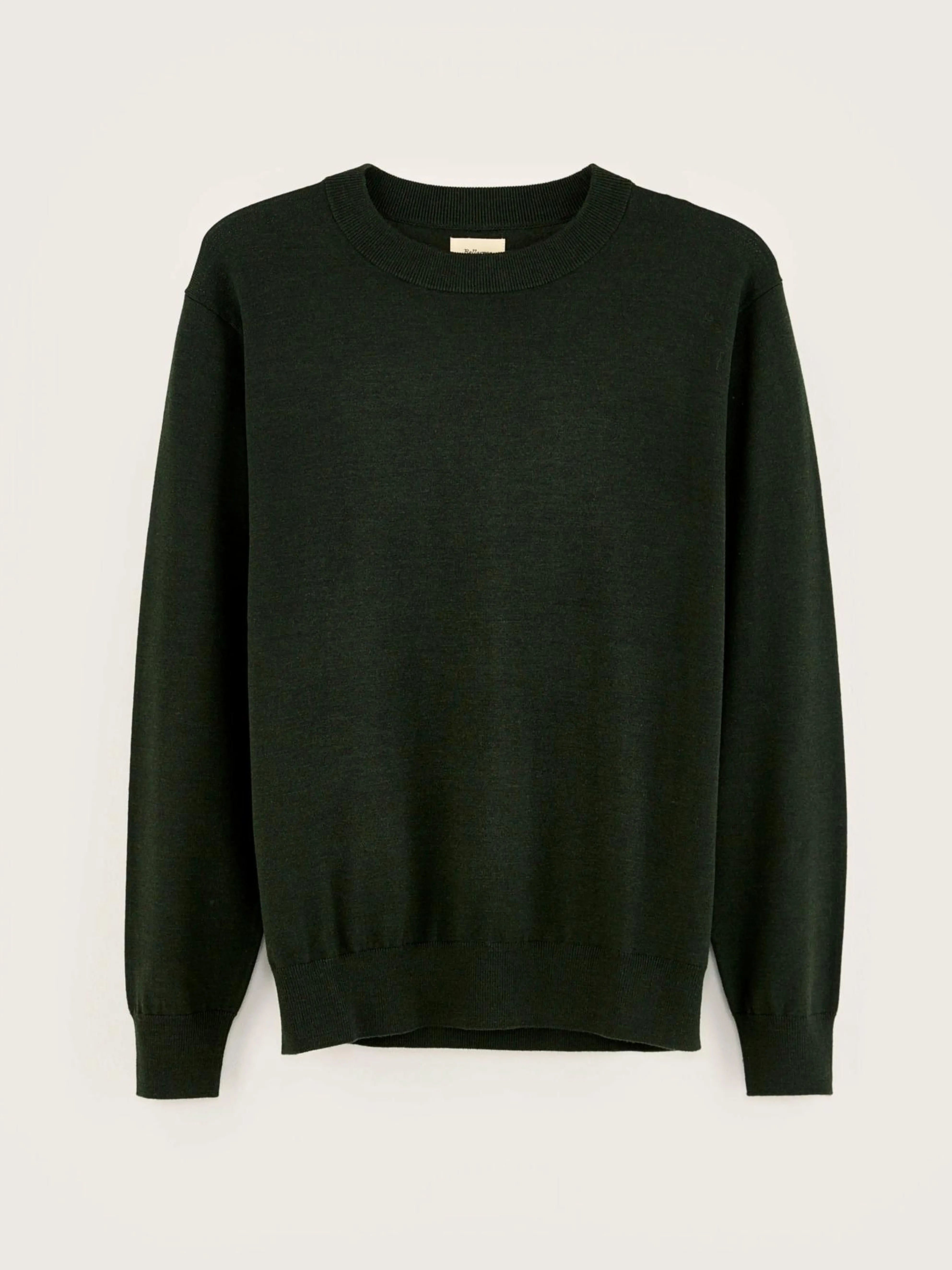 Klassieke, bosgroene sweater met ronde hals, van superfijne merinowol.