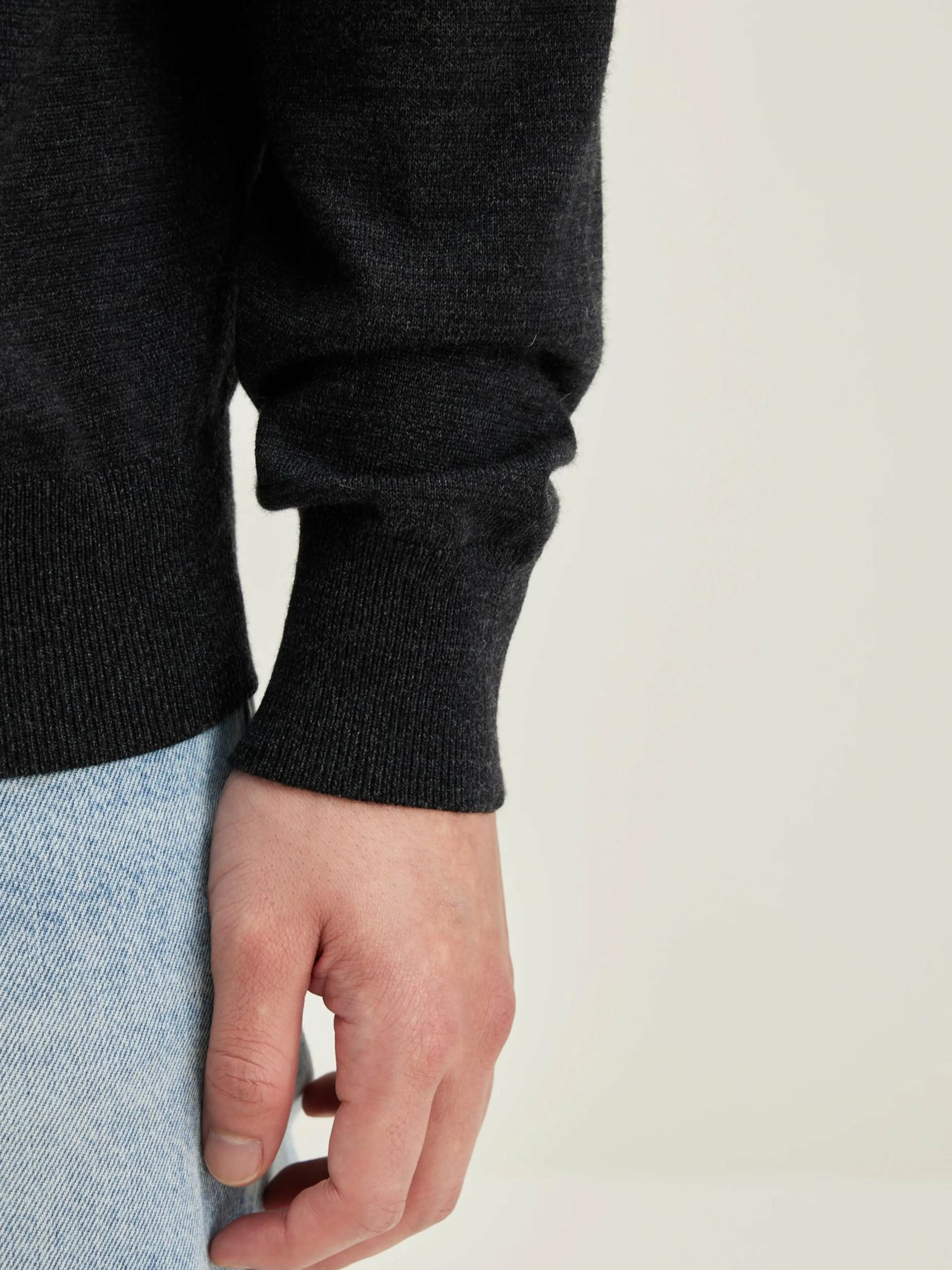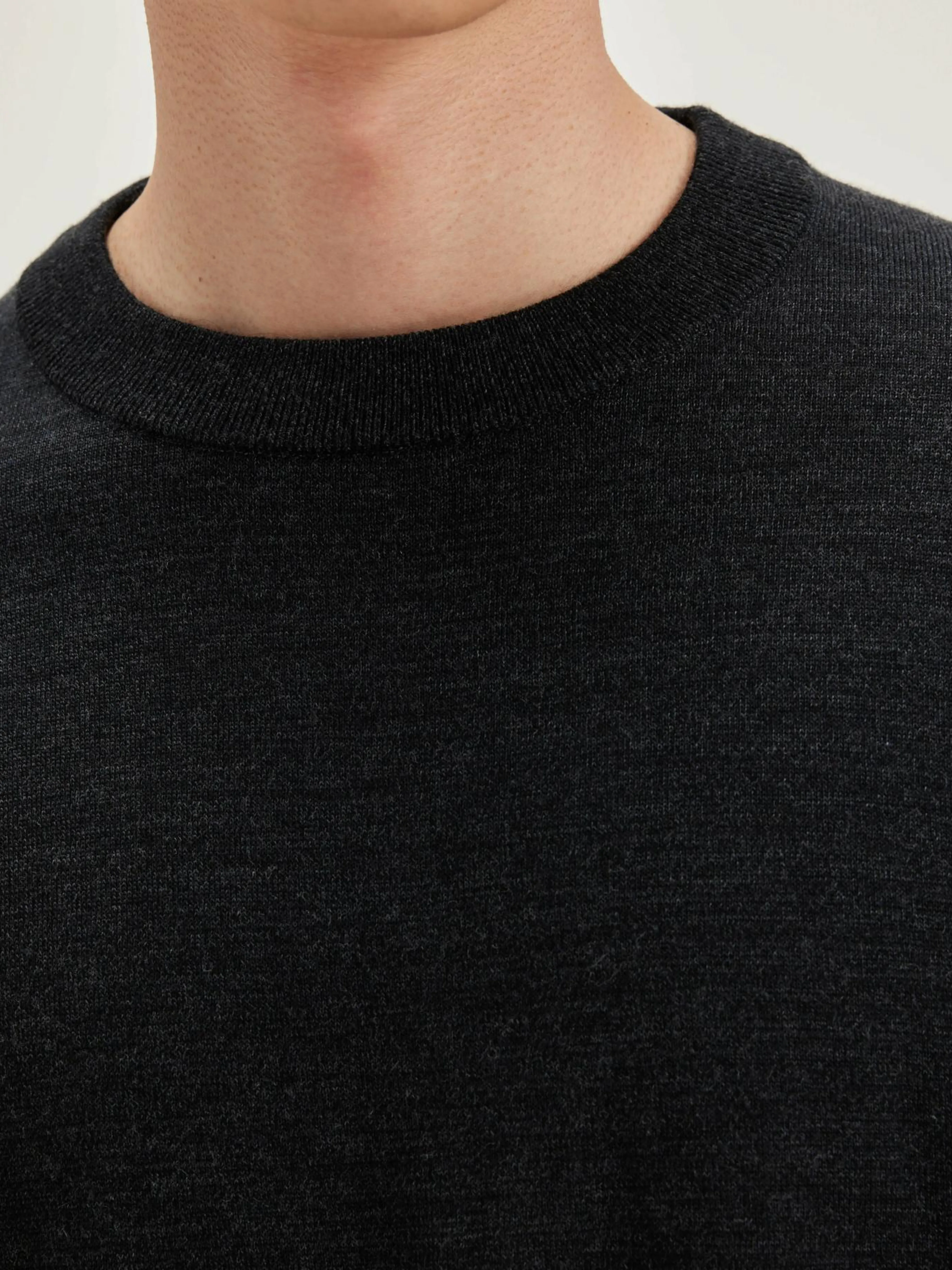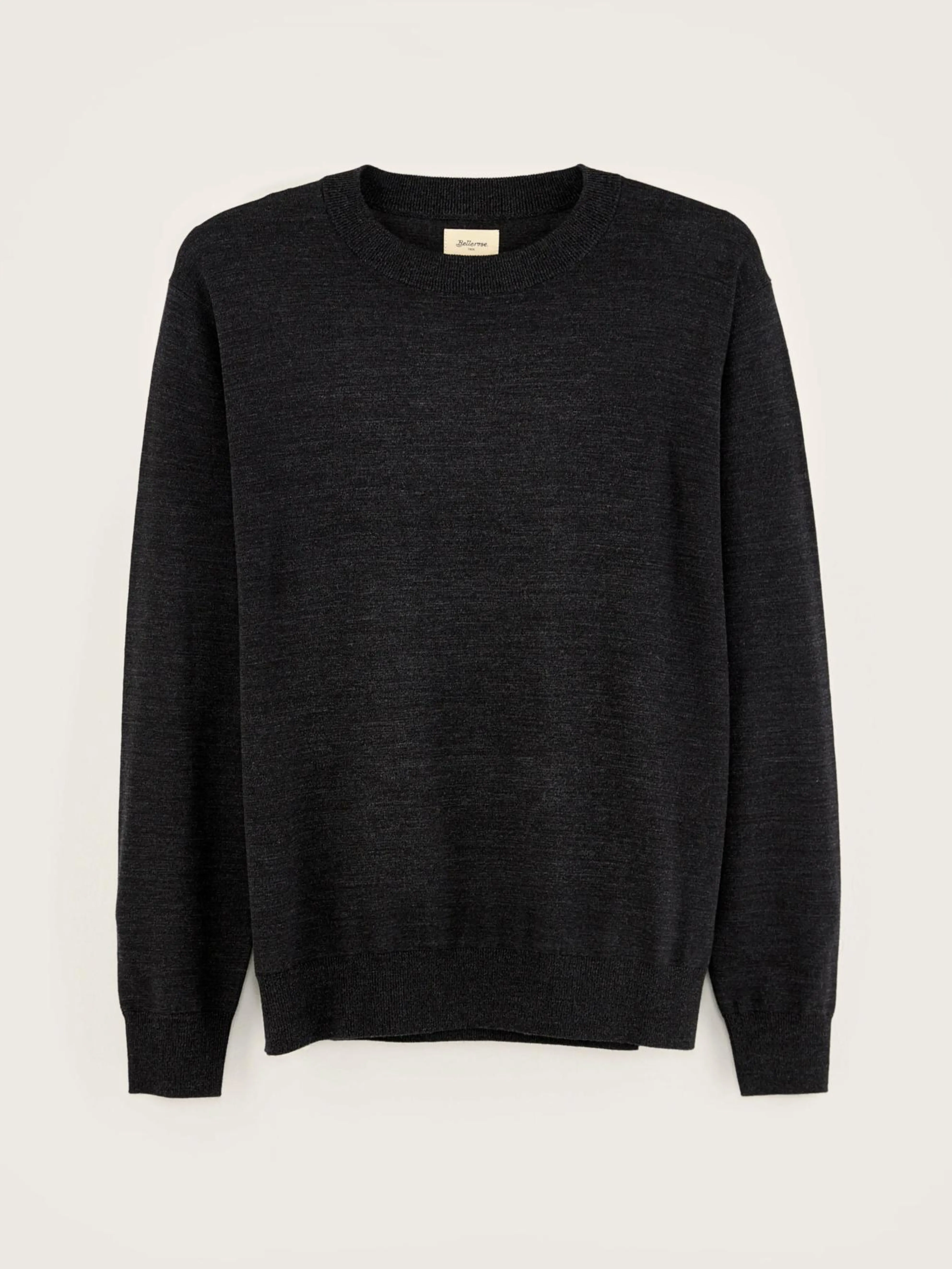 Klassieke, off-black sweater met ronde hals, van superfijne merinowol.