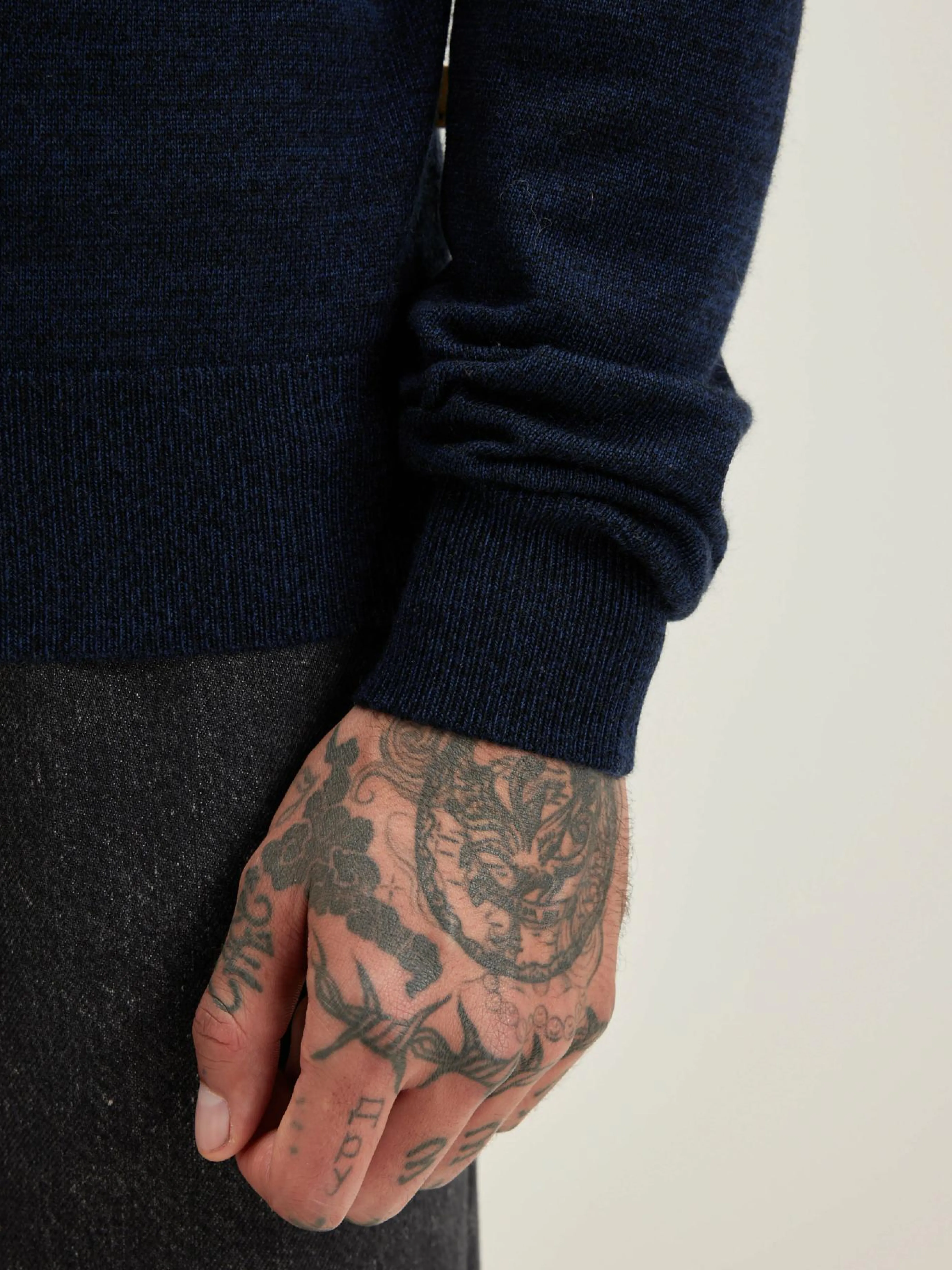 Klassieke, nachtblauwe sweater met rolkraag, van superfijne merinowol.