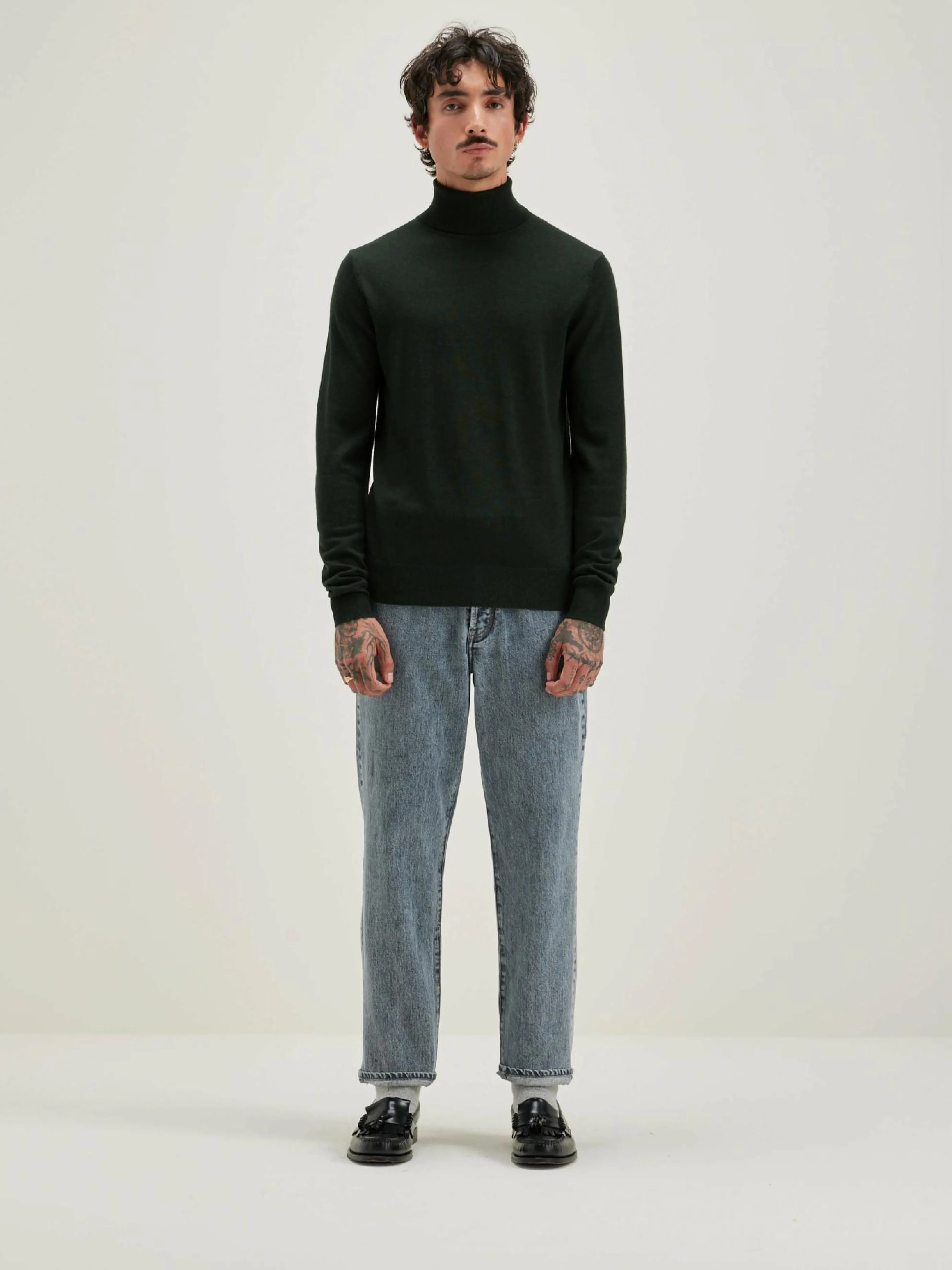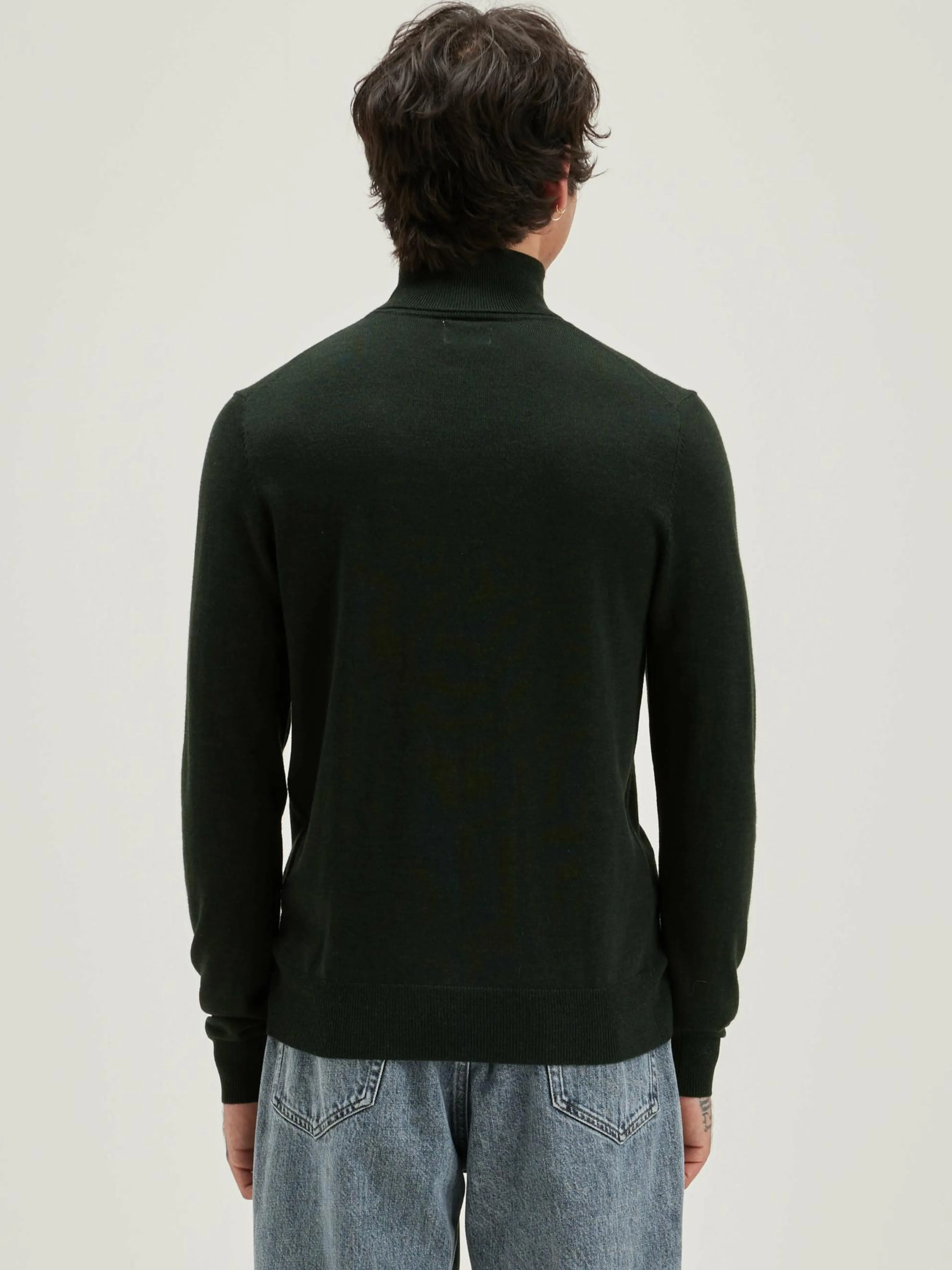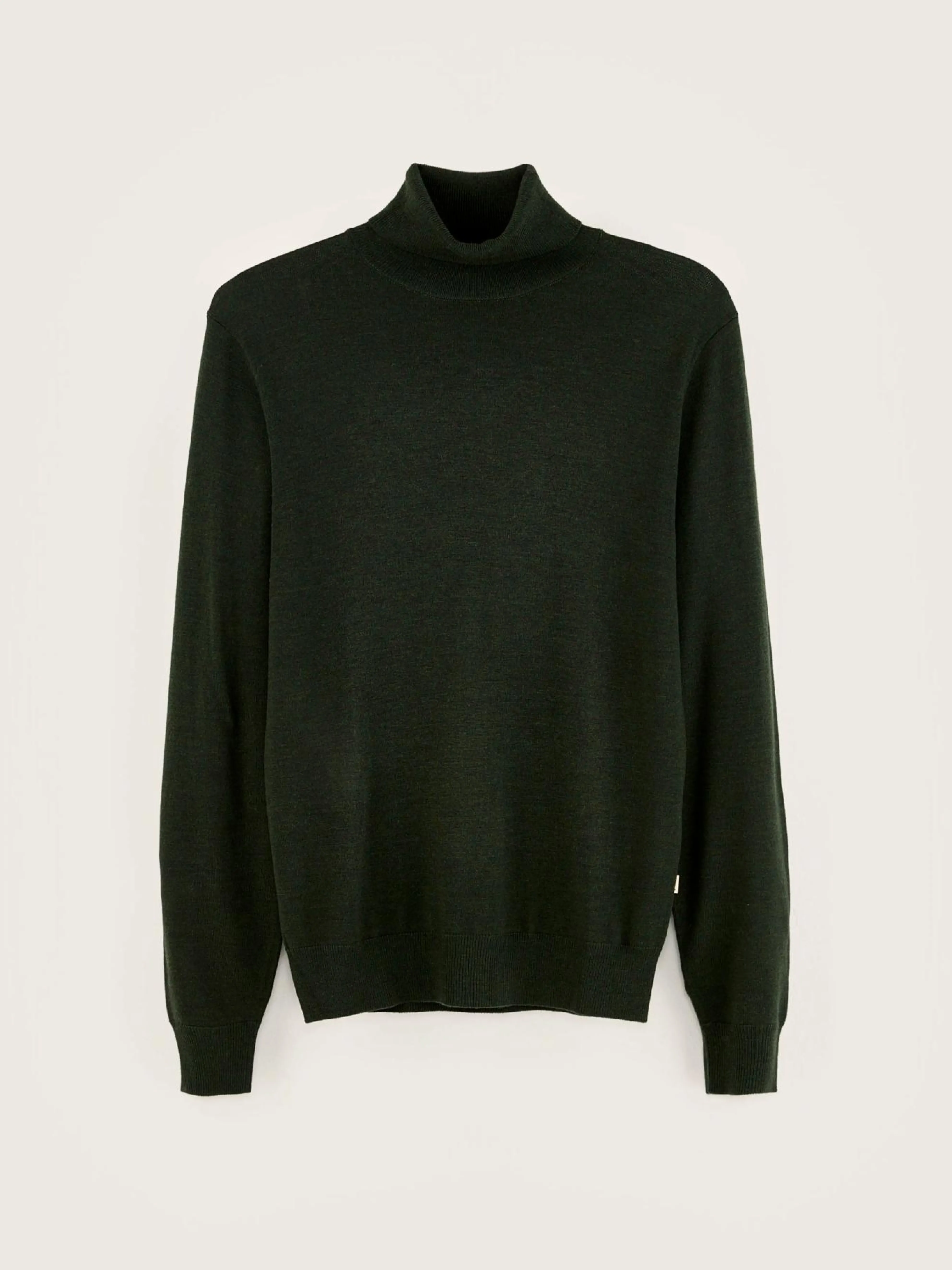 Klassieke, bosgroene sweater met rolkraag, van superfijne merinowol.