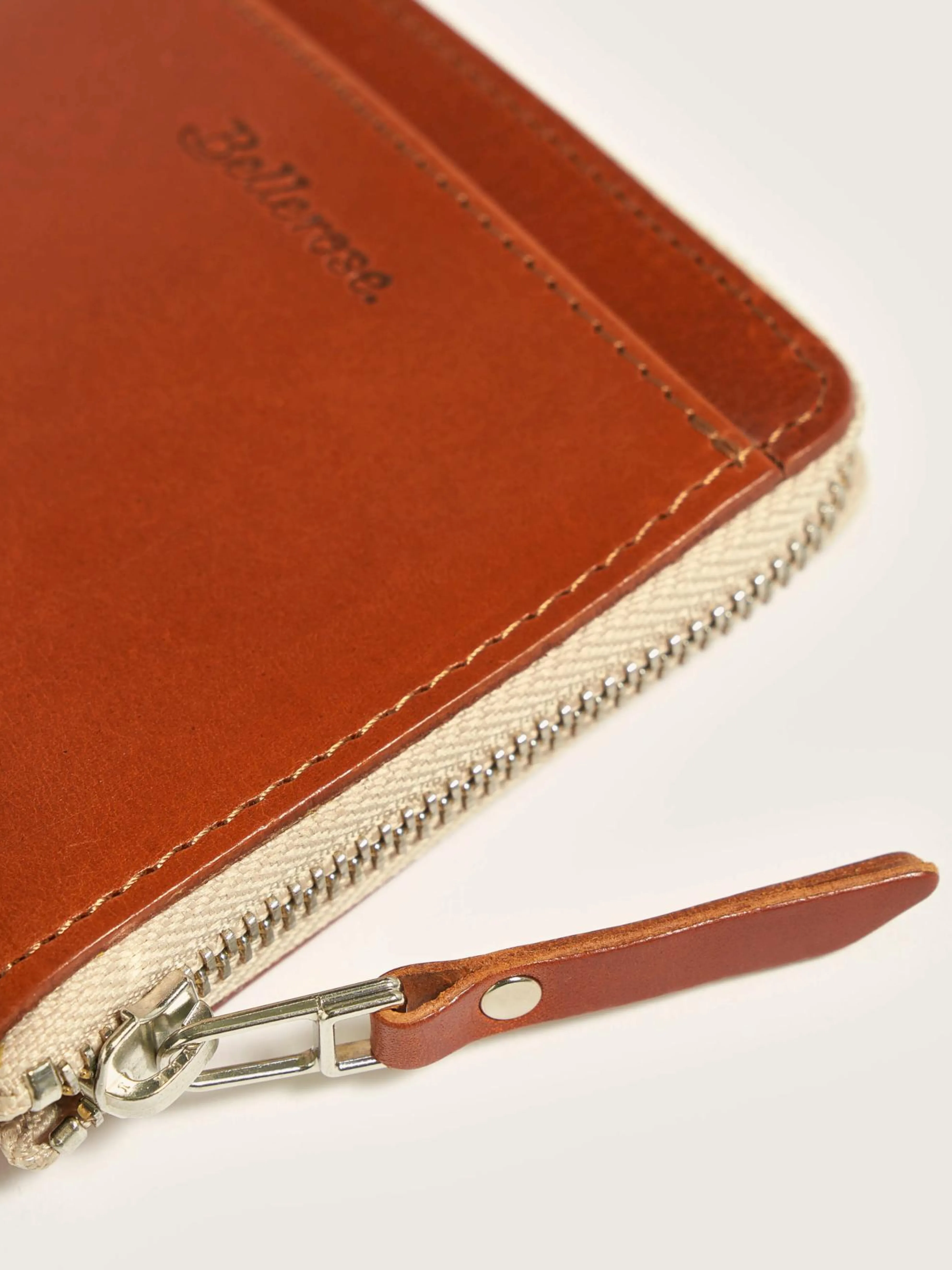 Vierkante portemonnee van glad cognac-kleurig leer met rits, meerdere kaartsleuven en een muntvak.