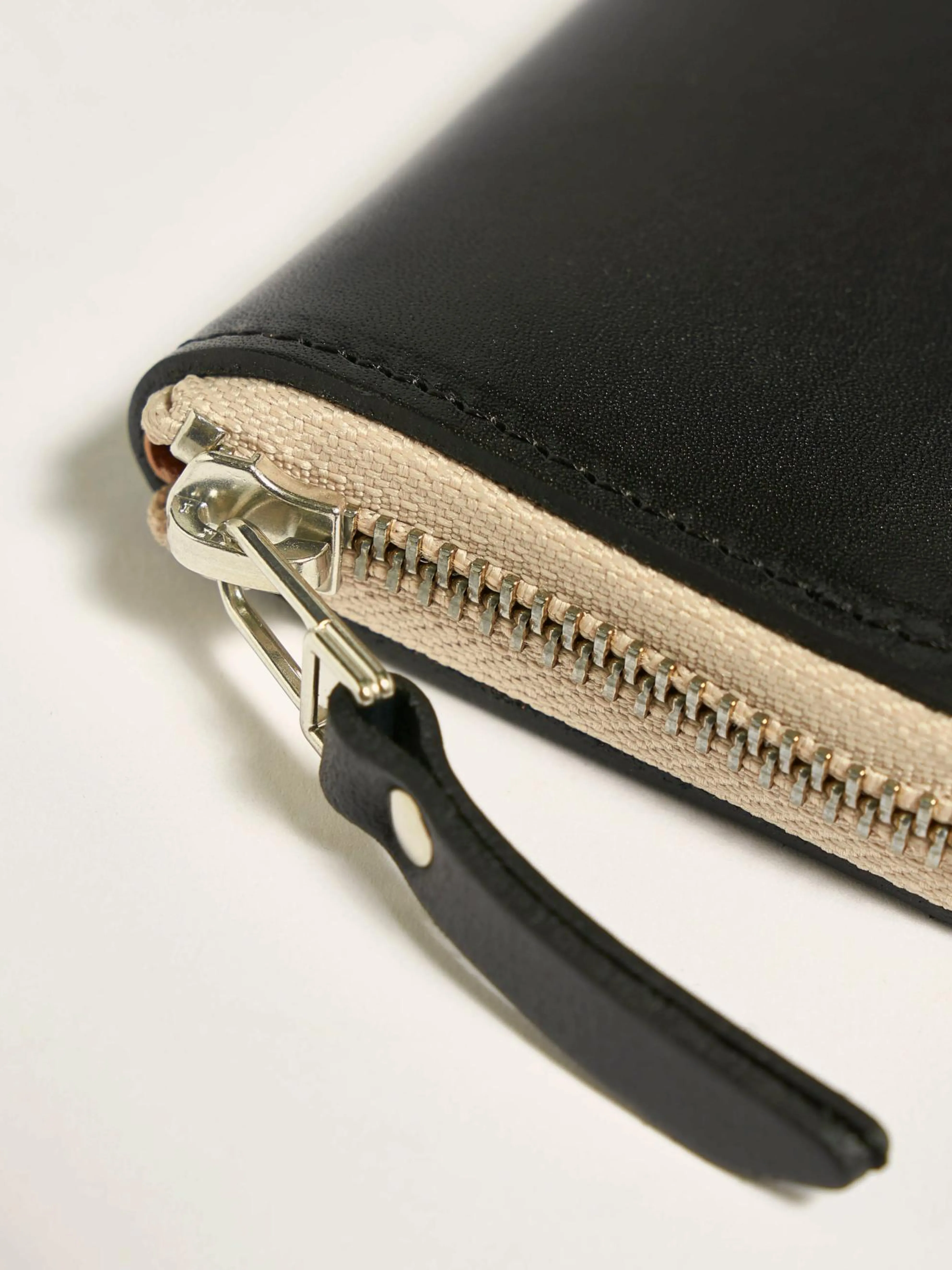 Rechthoekige portemonnee met rits van glad zwart leer met meerdere kaartsleuven.