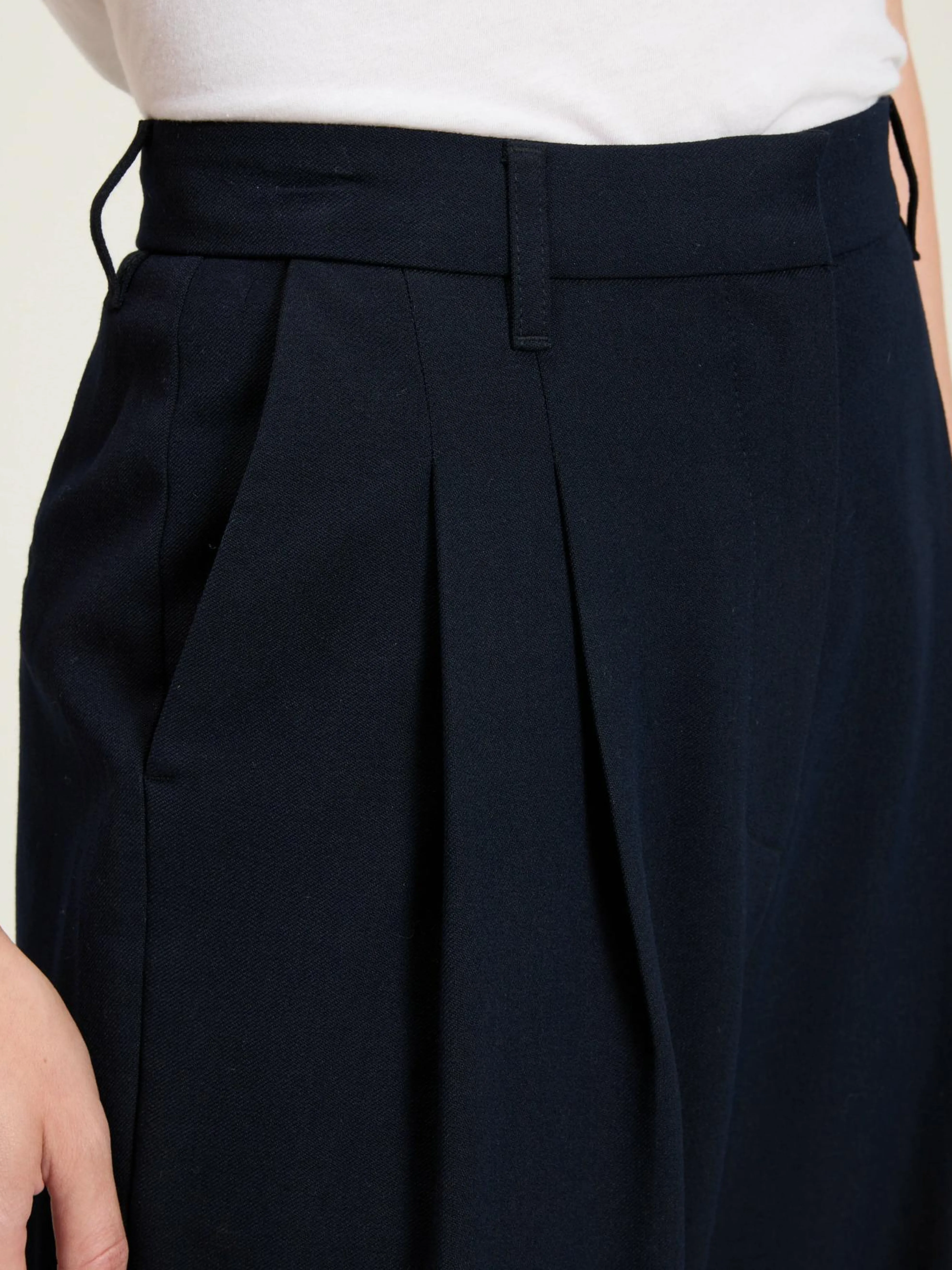 Geklede hoge taille broek met geplooide voorkant en wijde pijpen, in marineblauw.