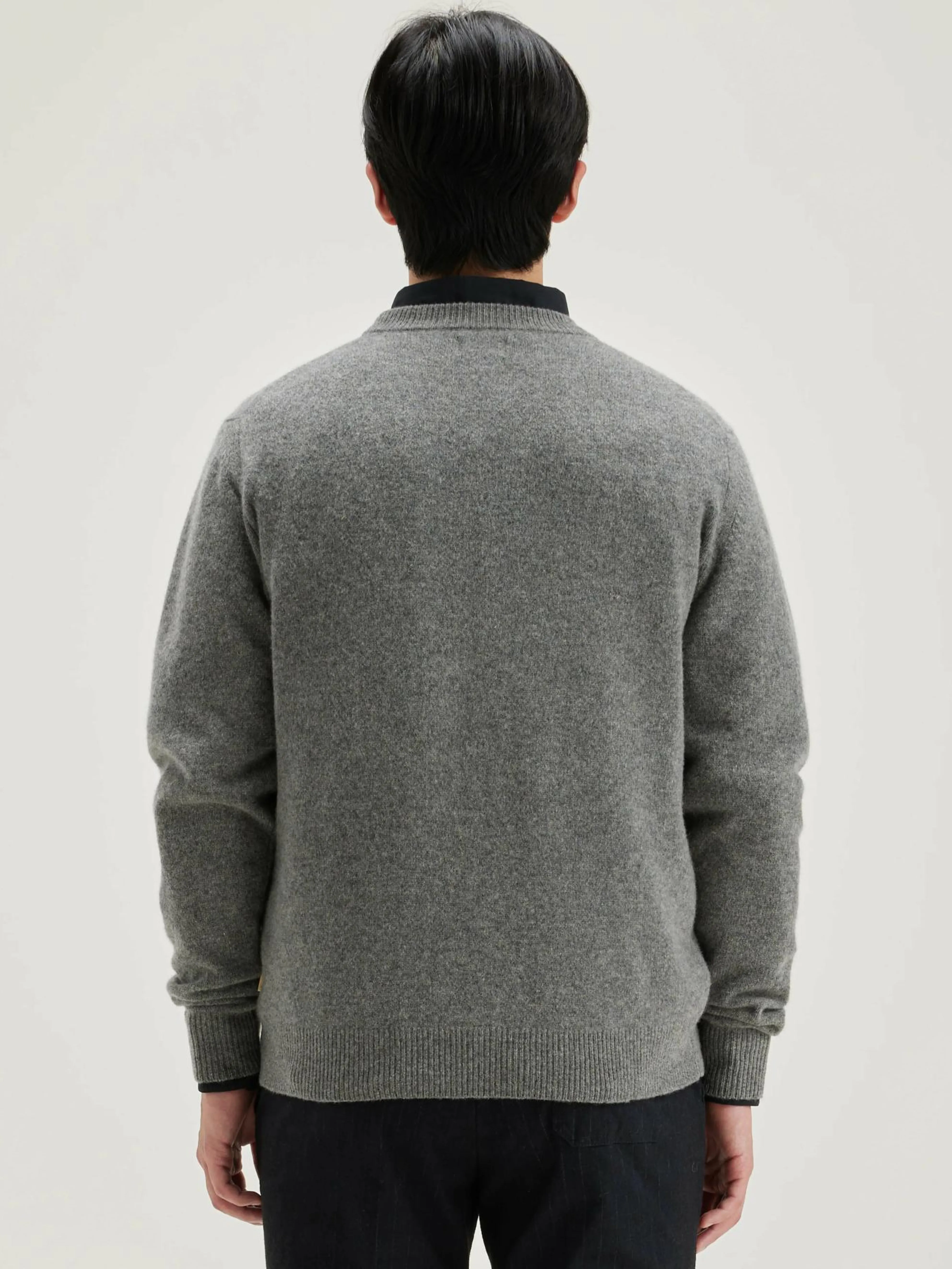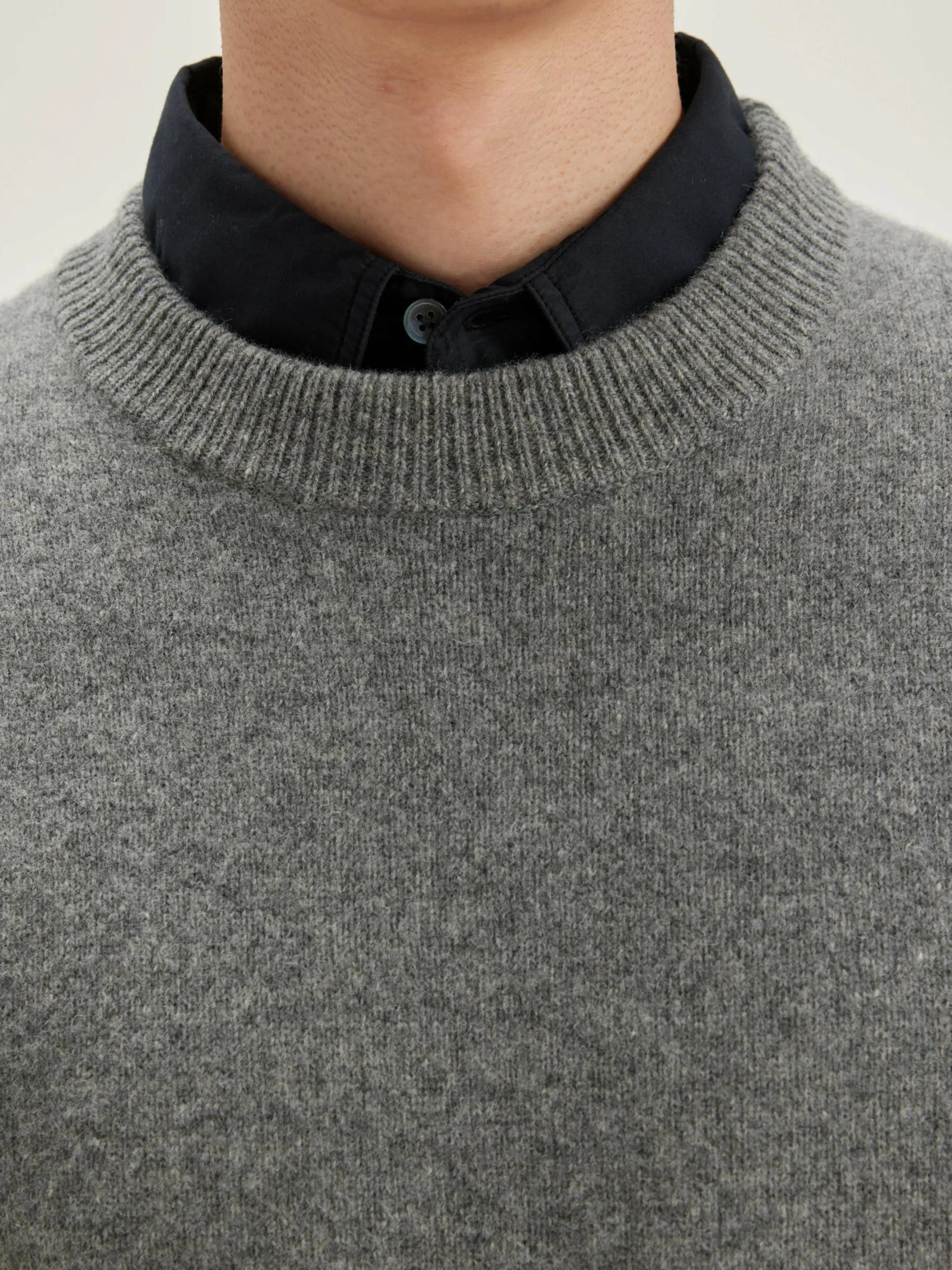 Klassieke, middengrijze sweater met ronde hals, van merinowol.