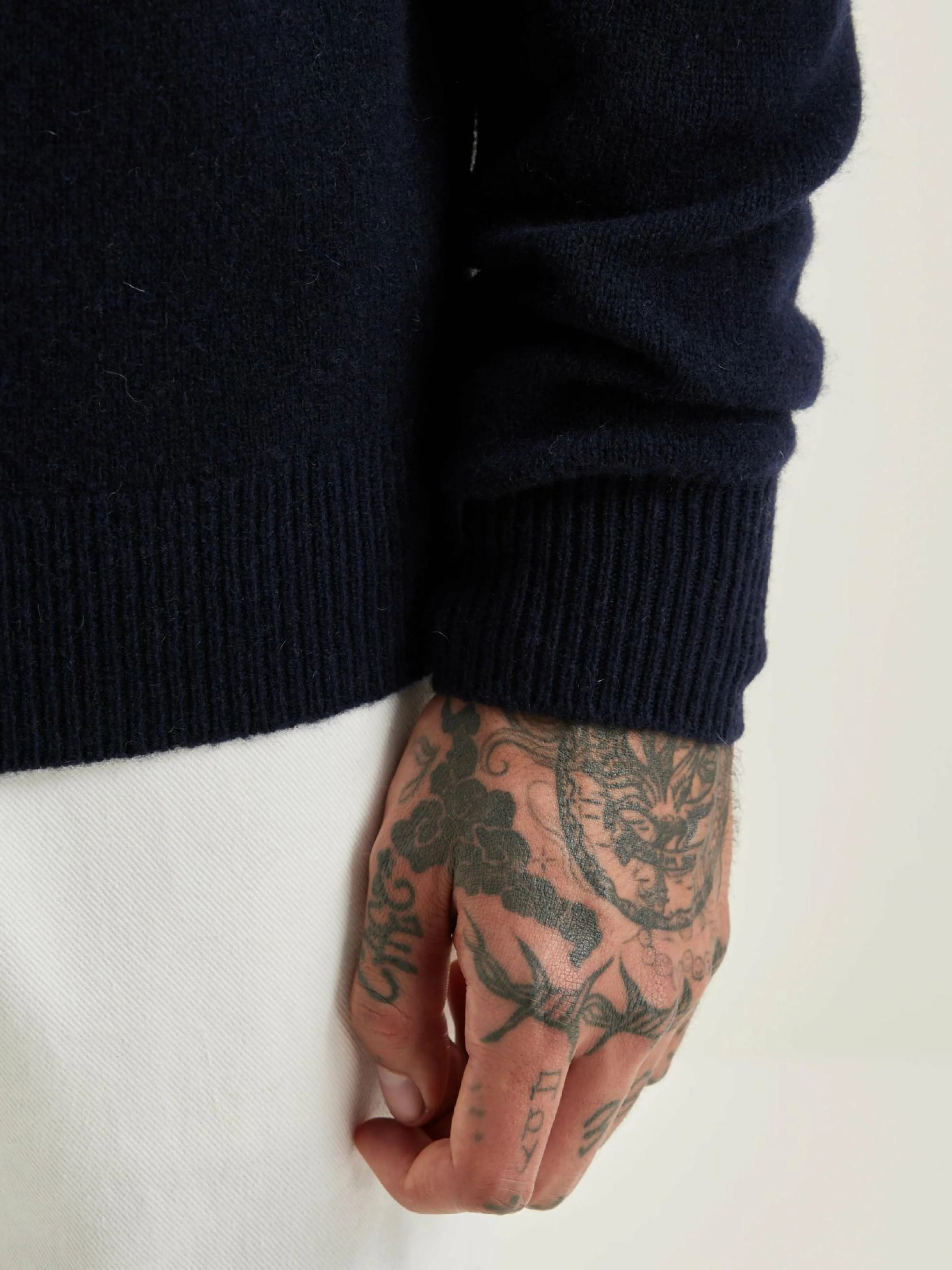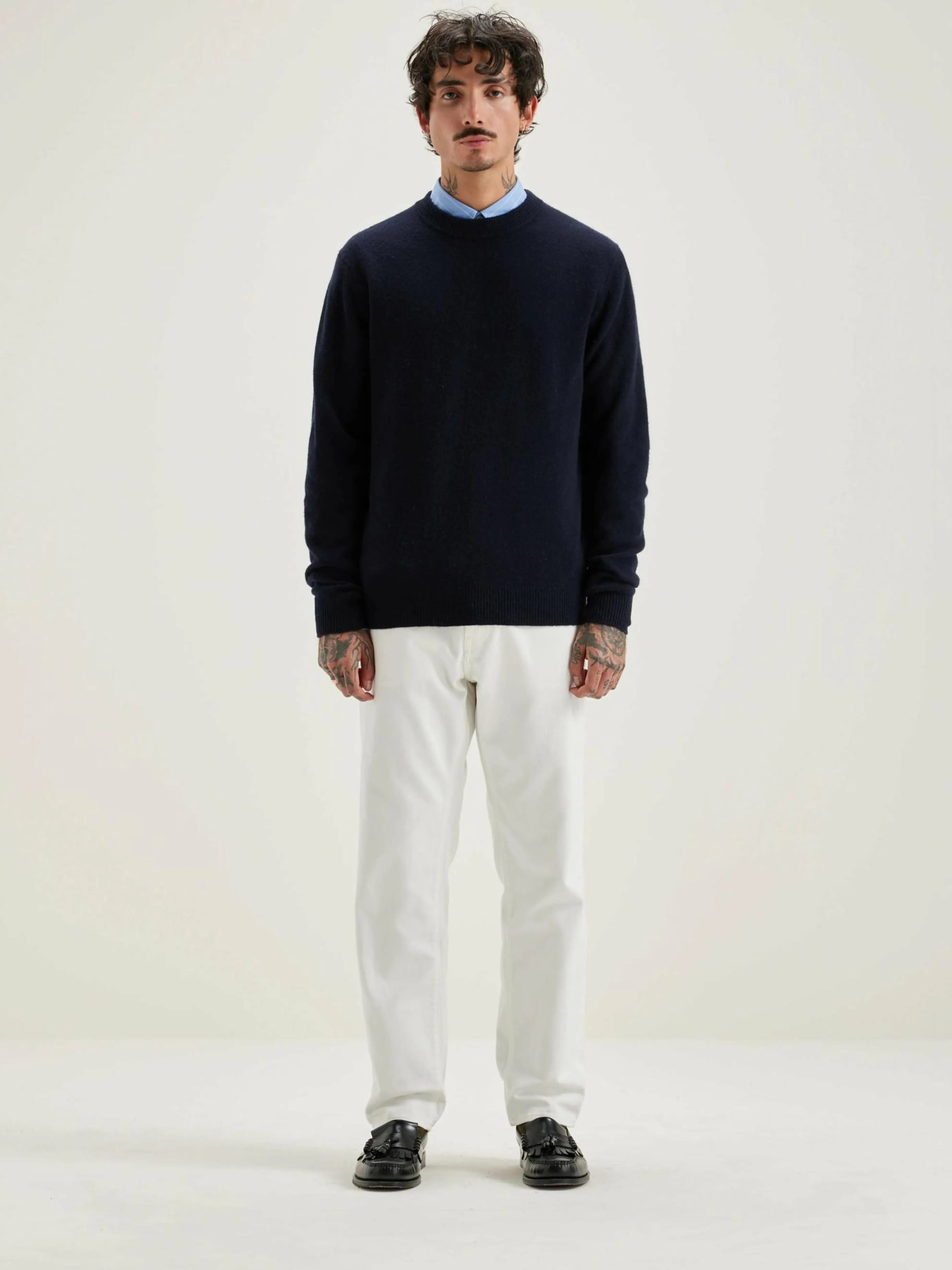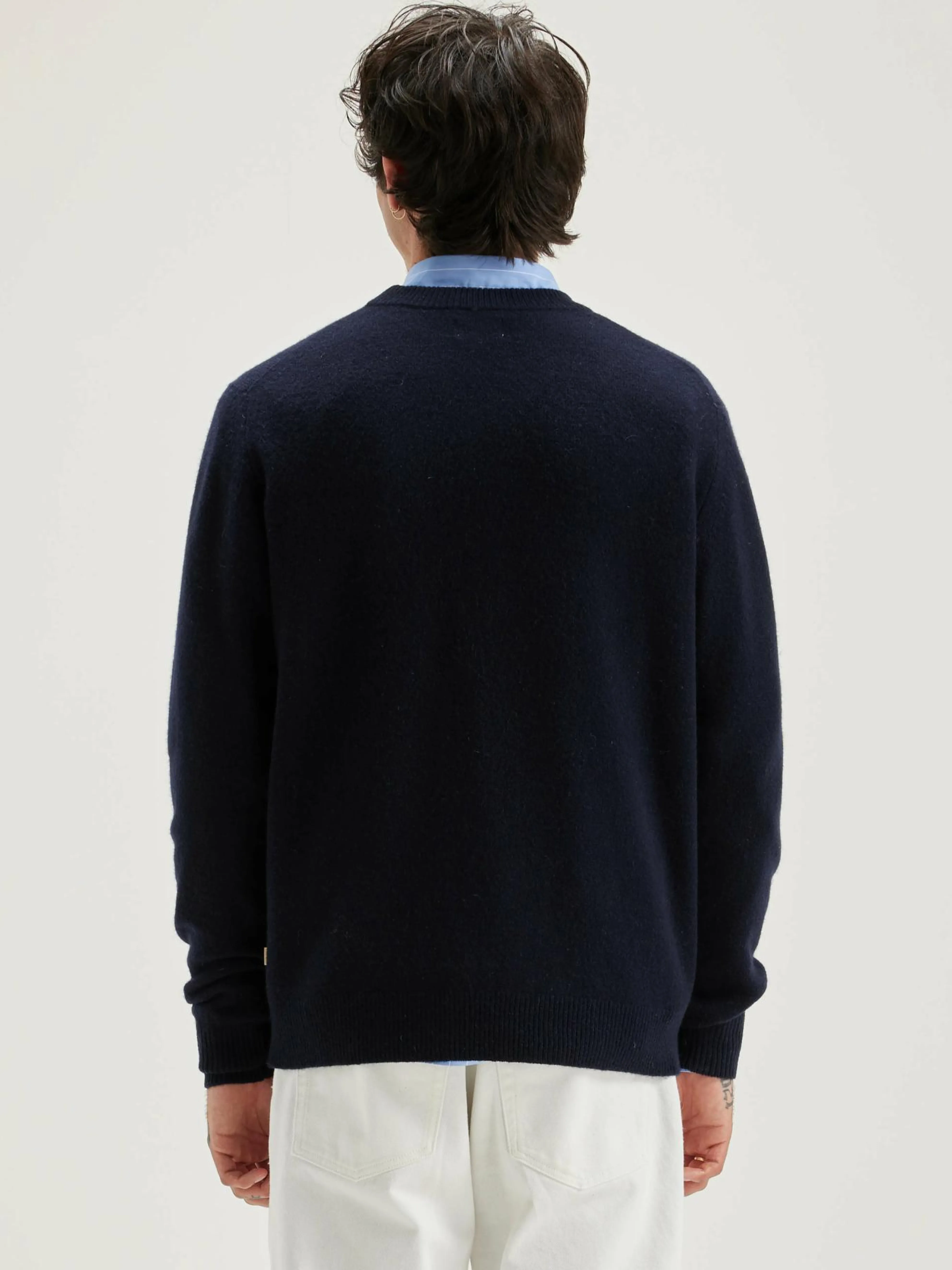 Klassieke, marineblauwe sweater met ronde hals, van merinowol.