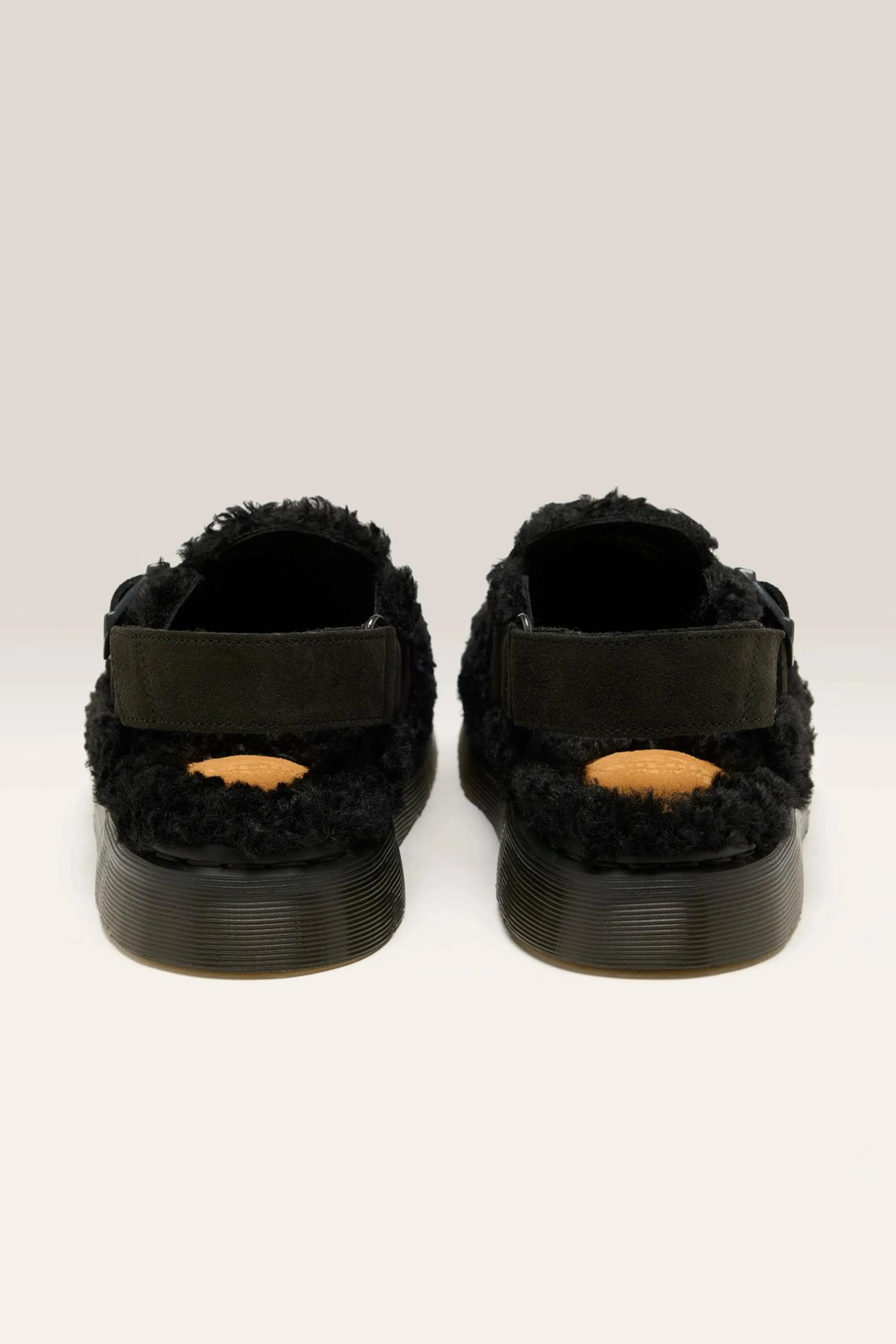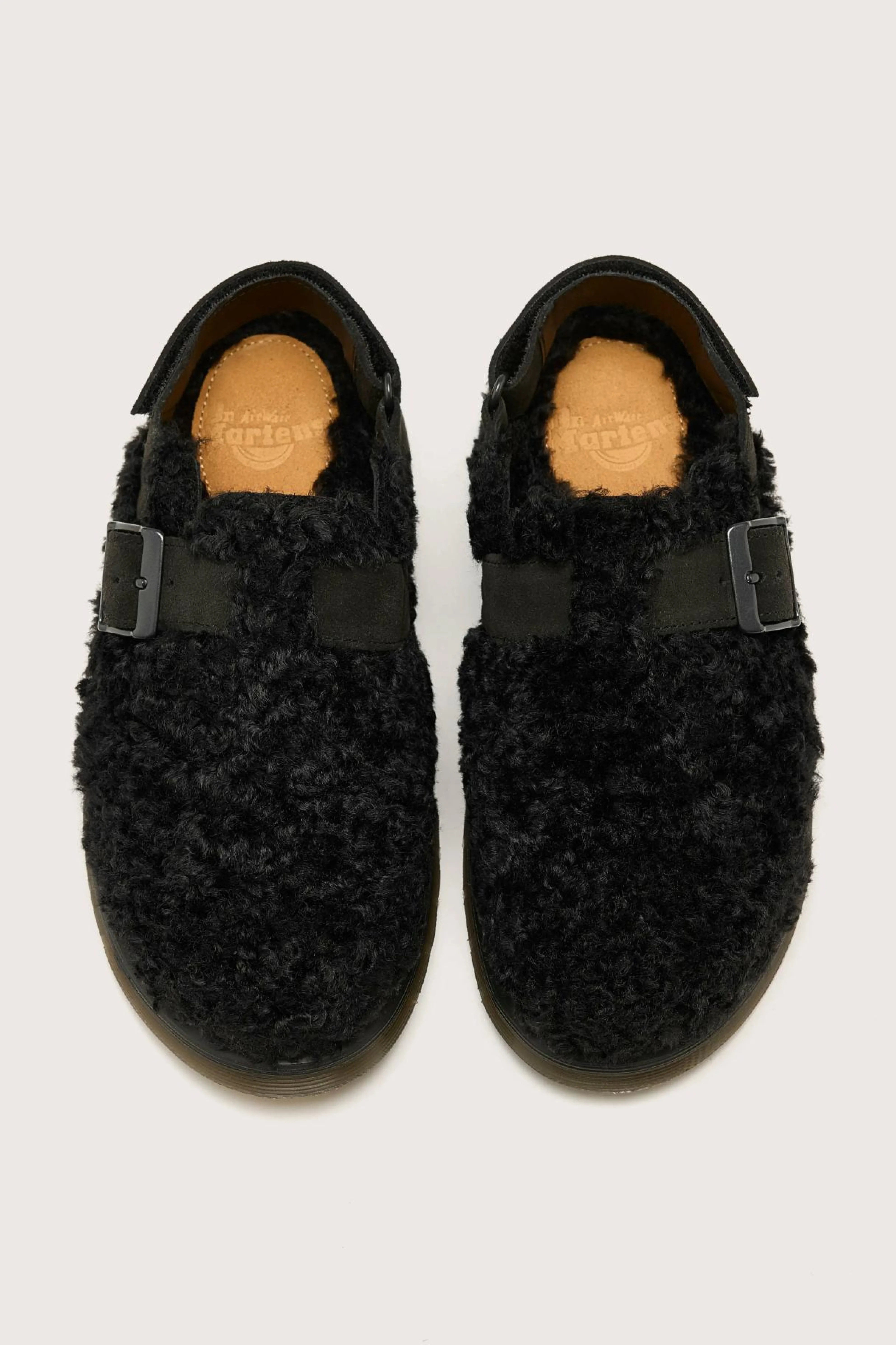 The Dr. Martens Jorge II mules feature a deluxe borg faux fur fleece upper design with soft suede details.