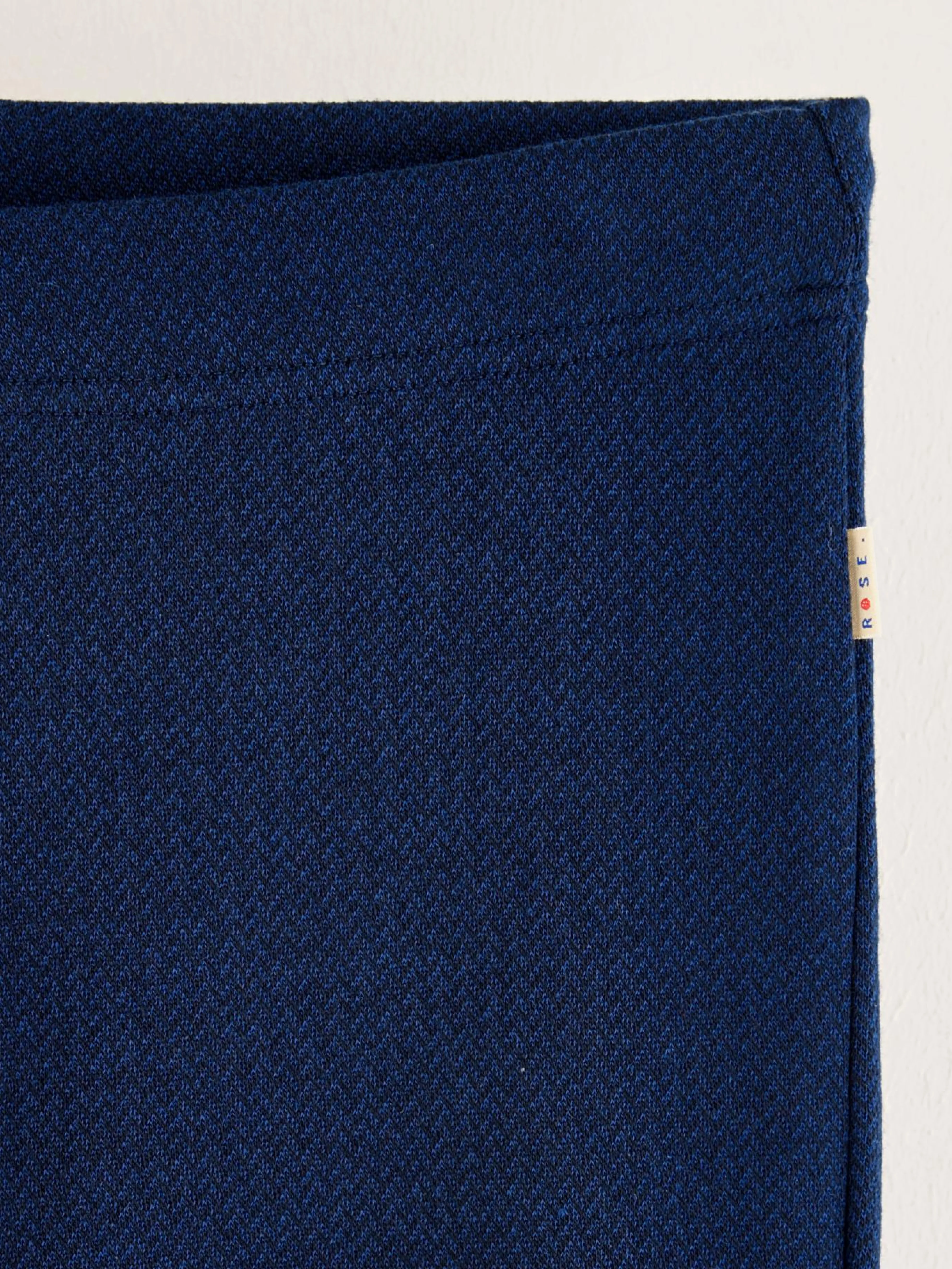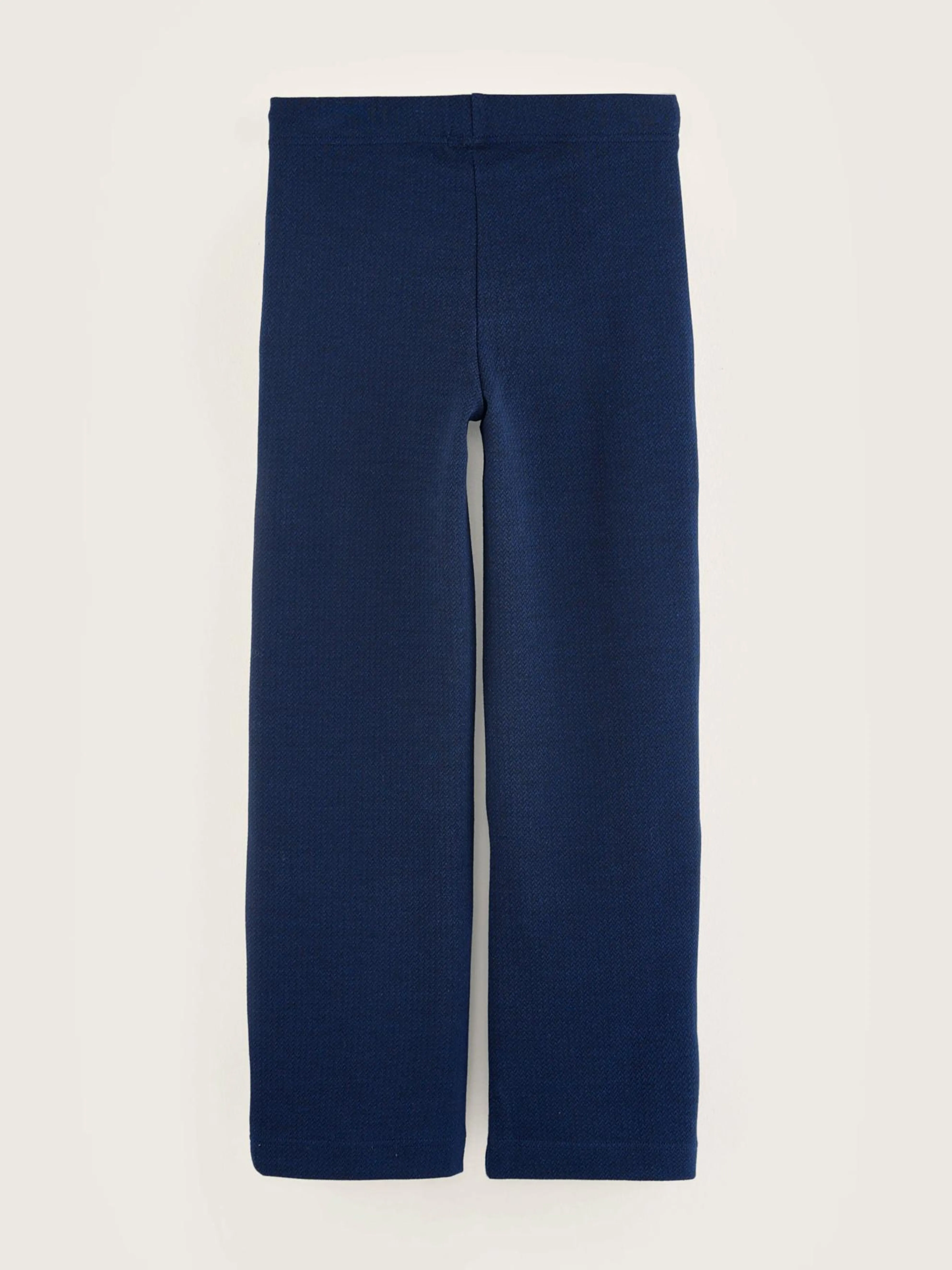 Marineblauwe broek met flared pijpen en elastische tailleband.