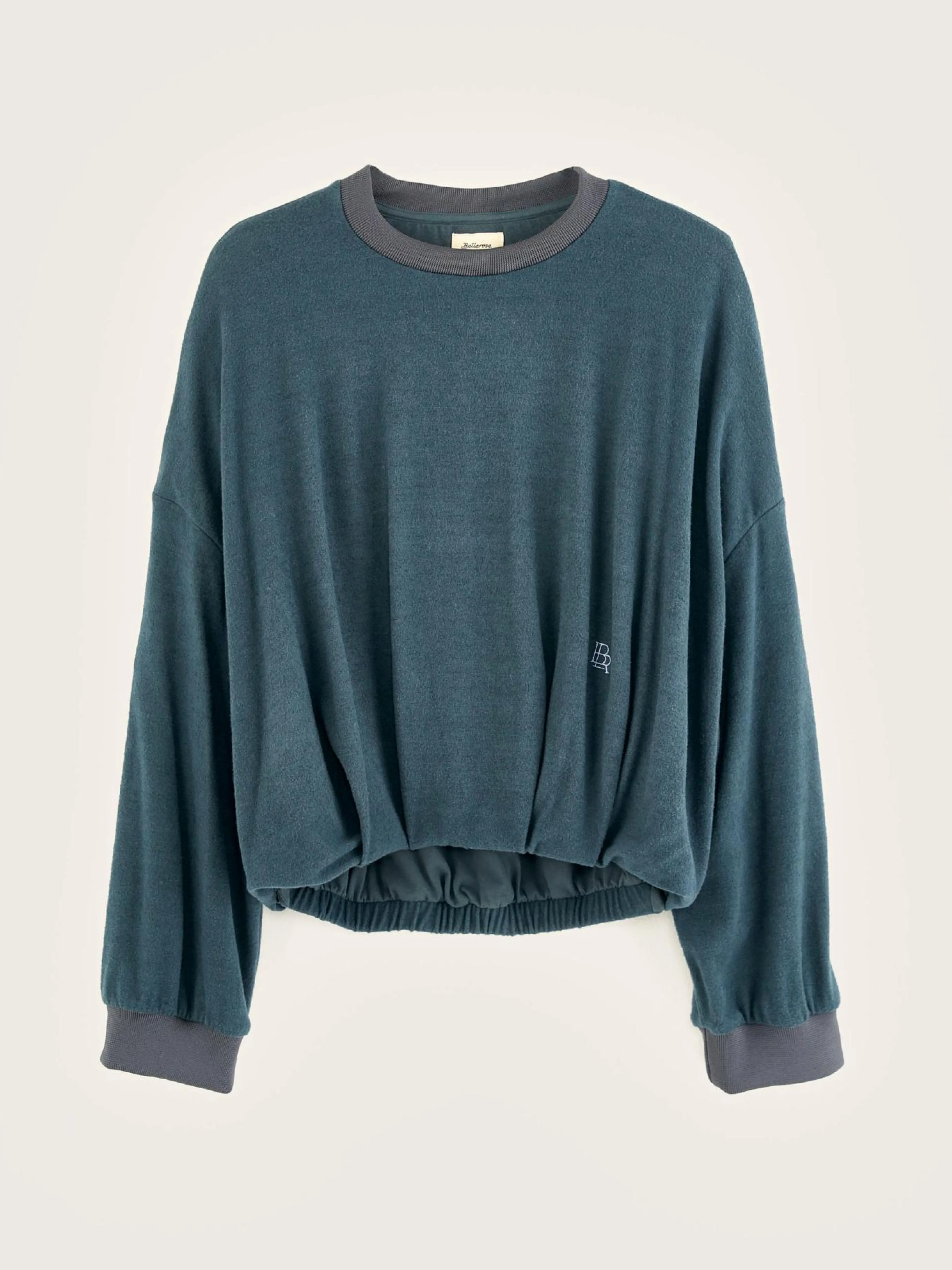Donkergrijs, los sweatshirt met lage schouderlijn.