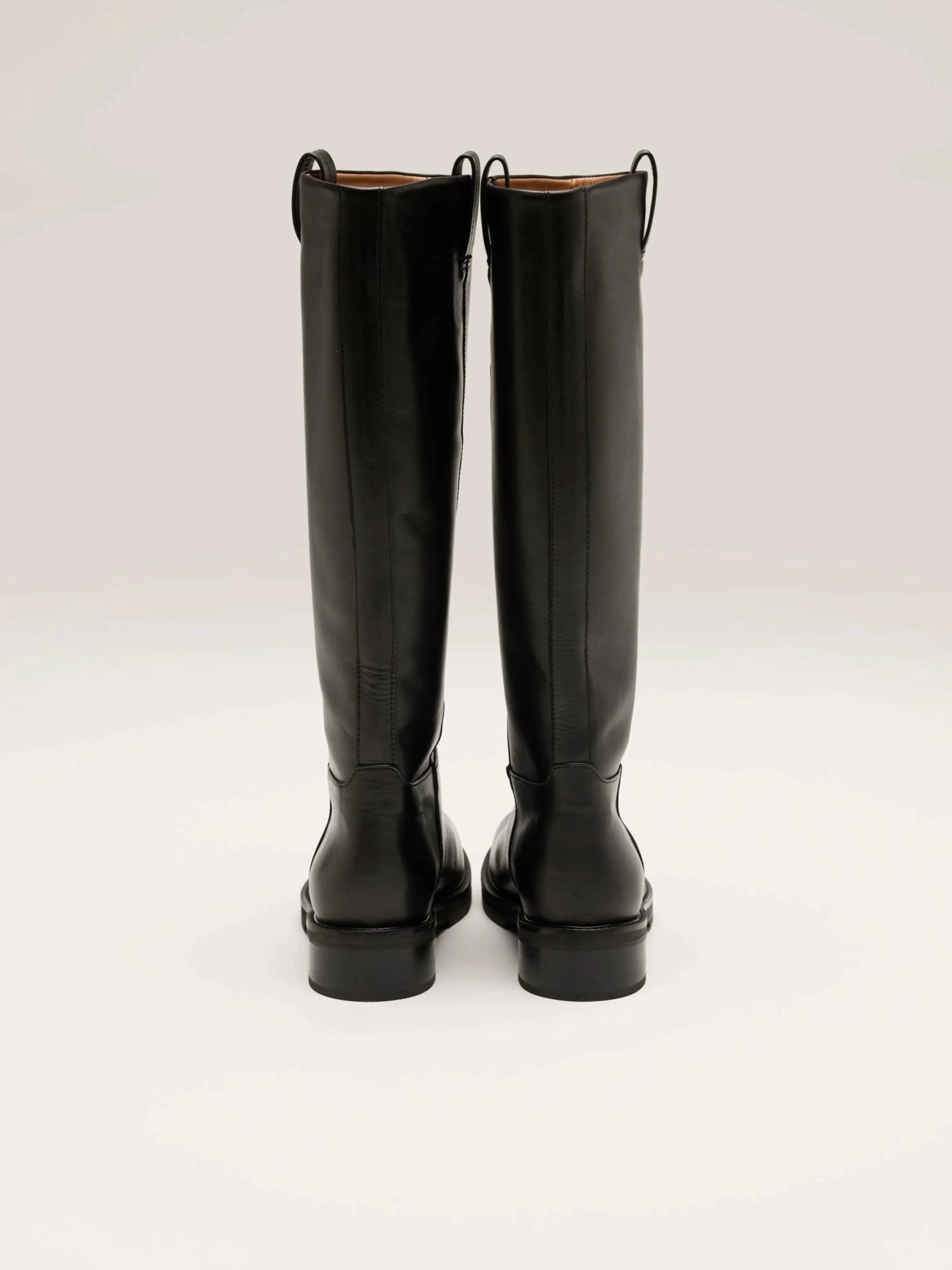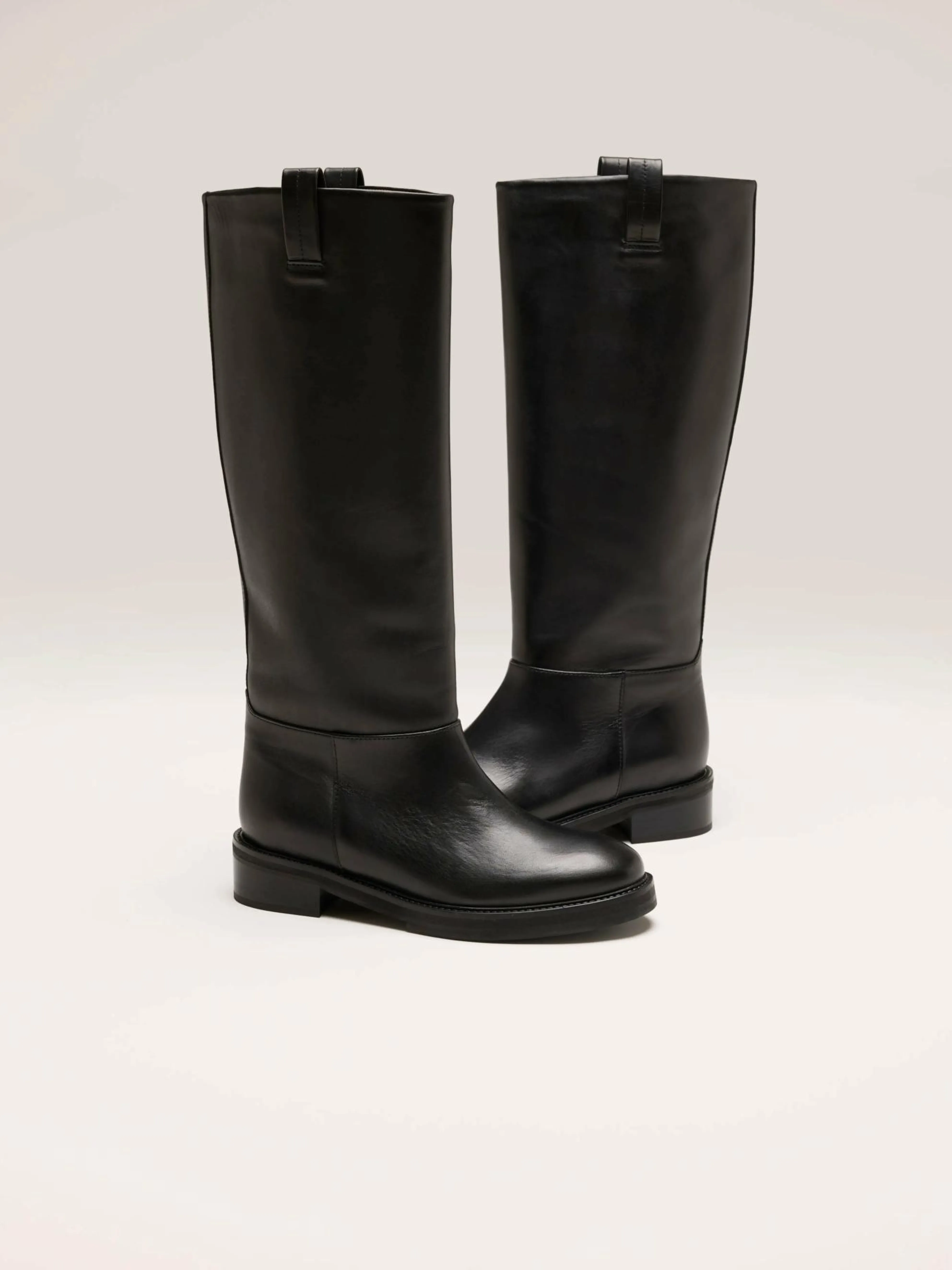 De Flattered Frances leren kuitlaars is een tijdloos, strak silhouet van volnerf zwart leer met een lage hak.