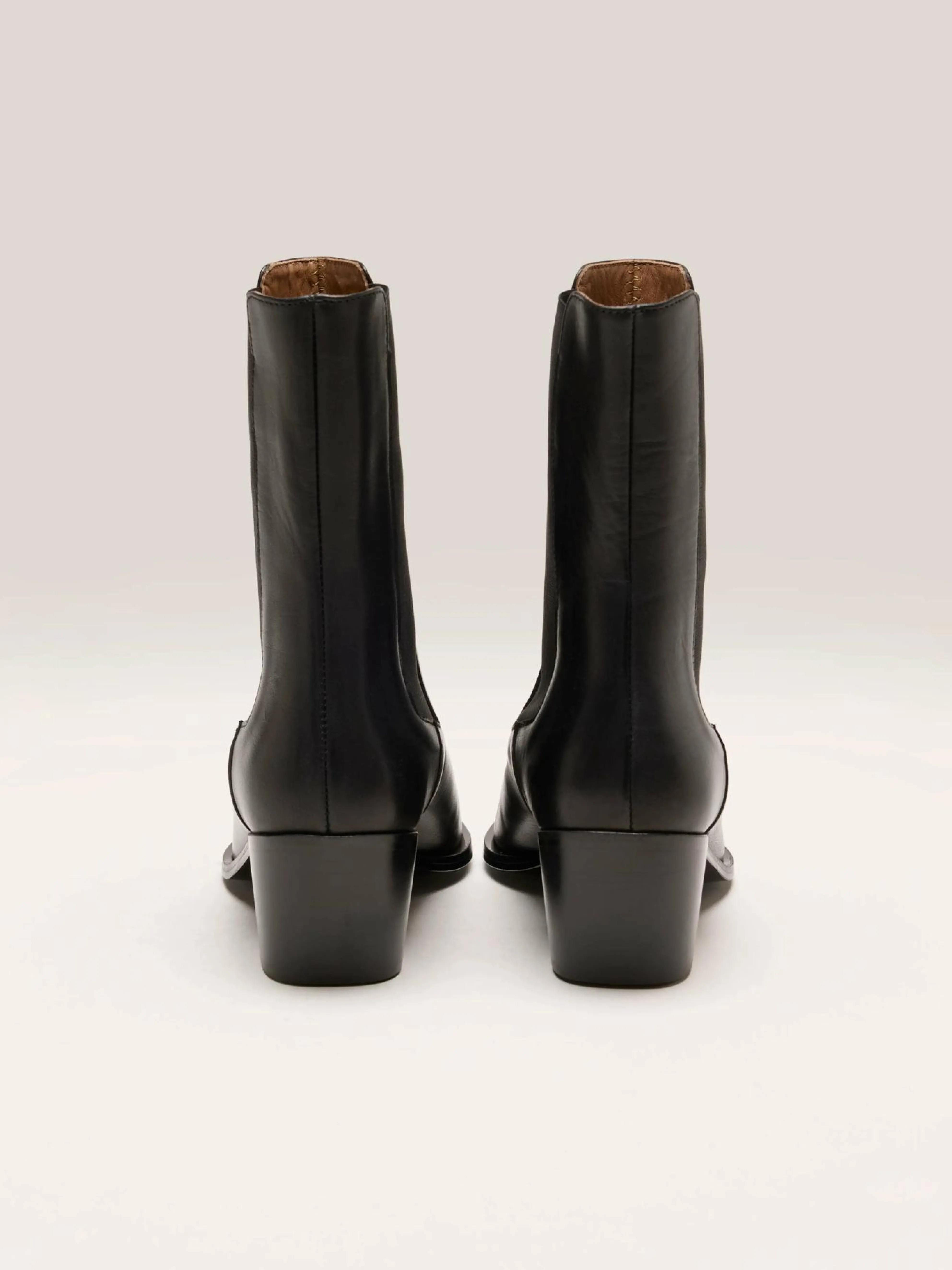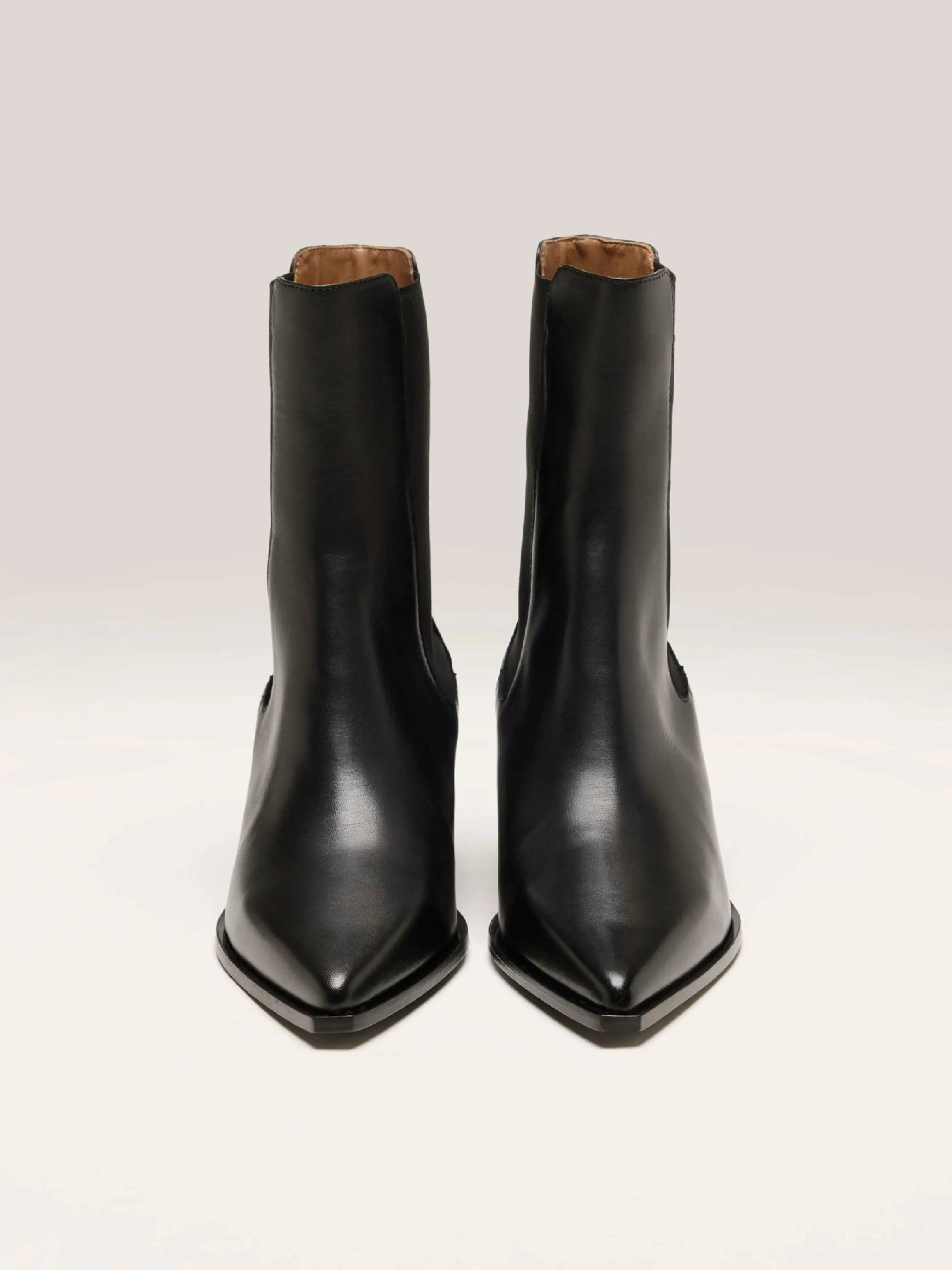 De Flattered Sandra enkellaars is een modern zwart leren ontwerp met een spitse neus.