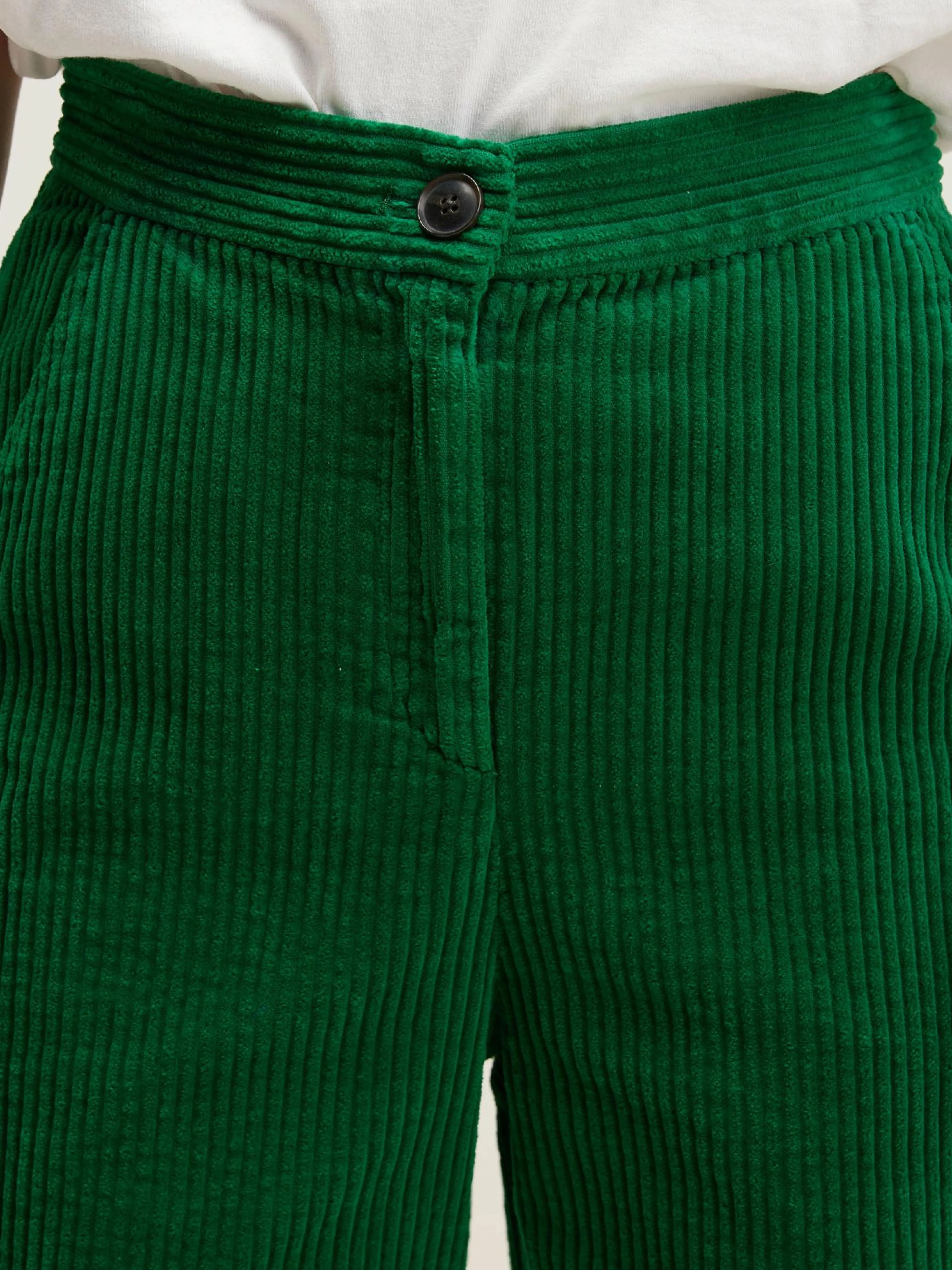 Rechte, grasgroene high-waist broek met wijde pijpen.