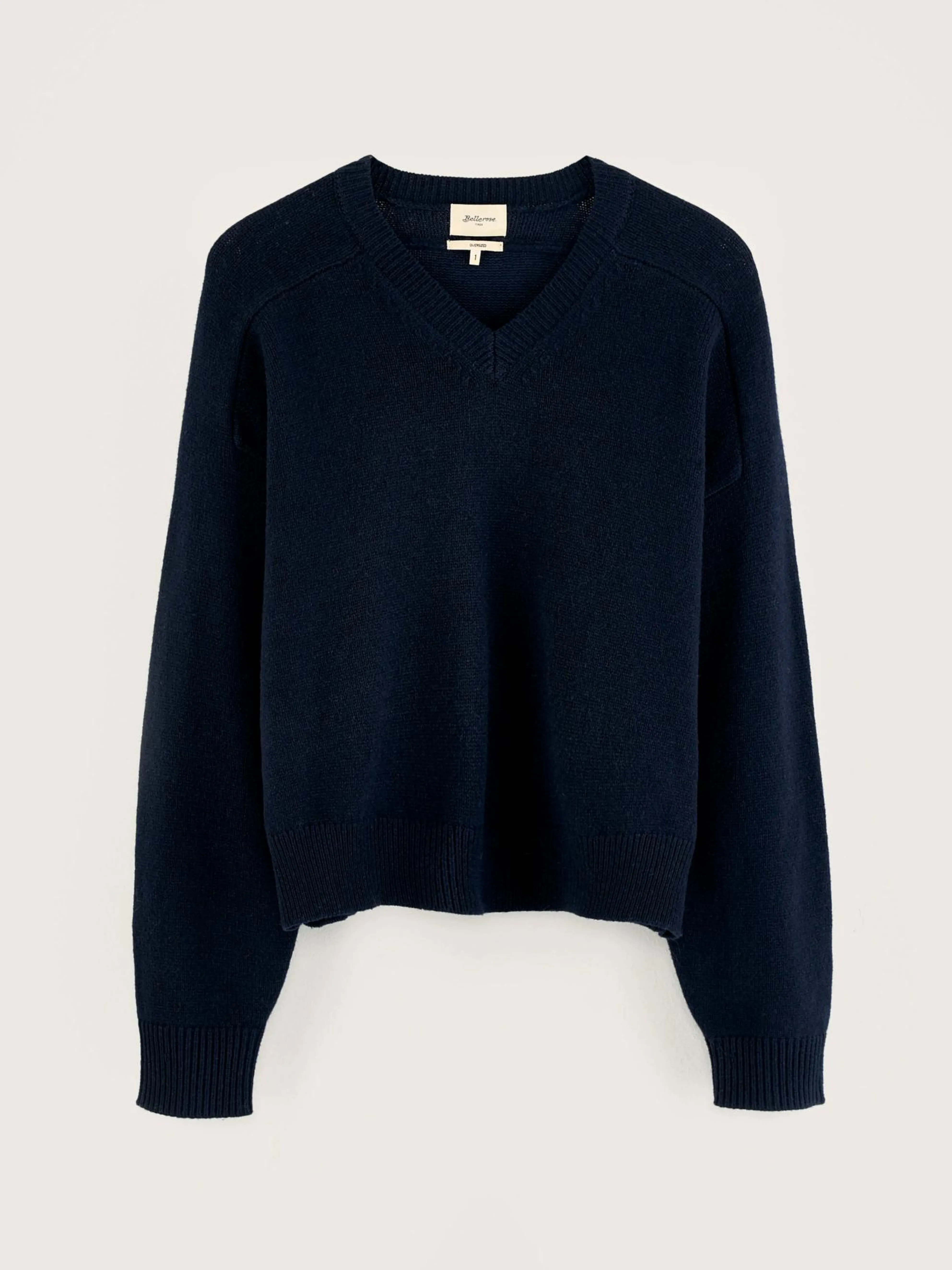Oversizede, donkerblauw sweater met V-hals, van wol en katoen.
