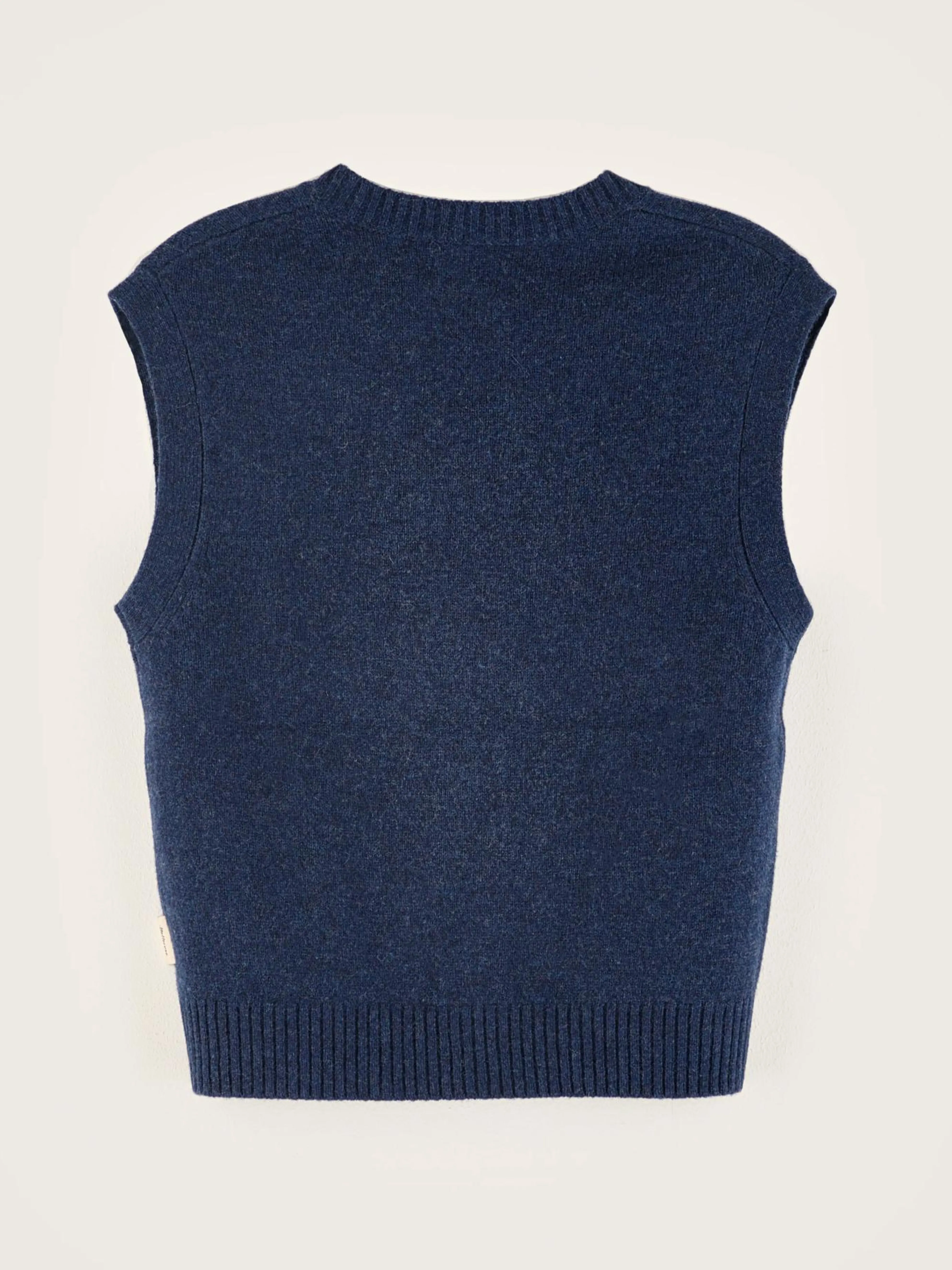 Comfortabele, mouwloze debardeur met V-hals, van inktblauwe merinowol.