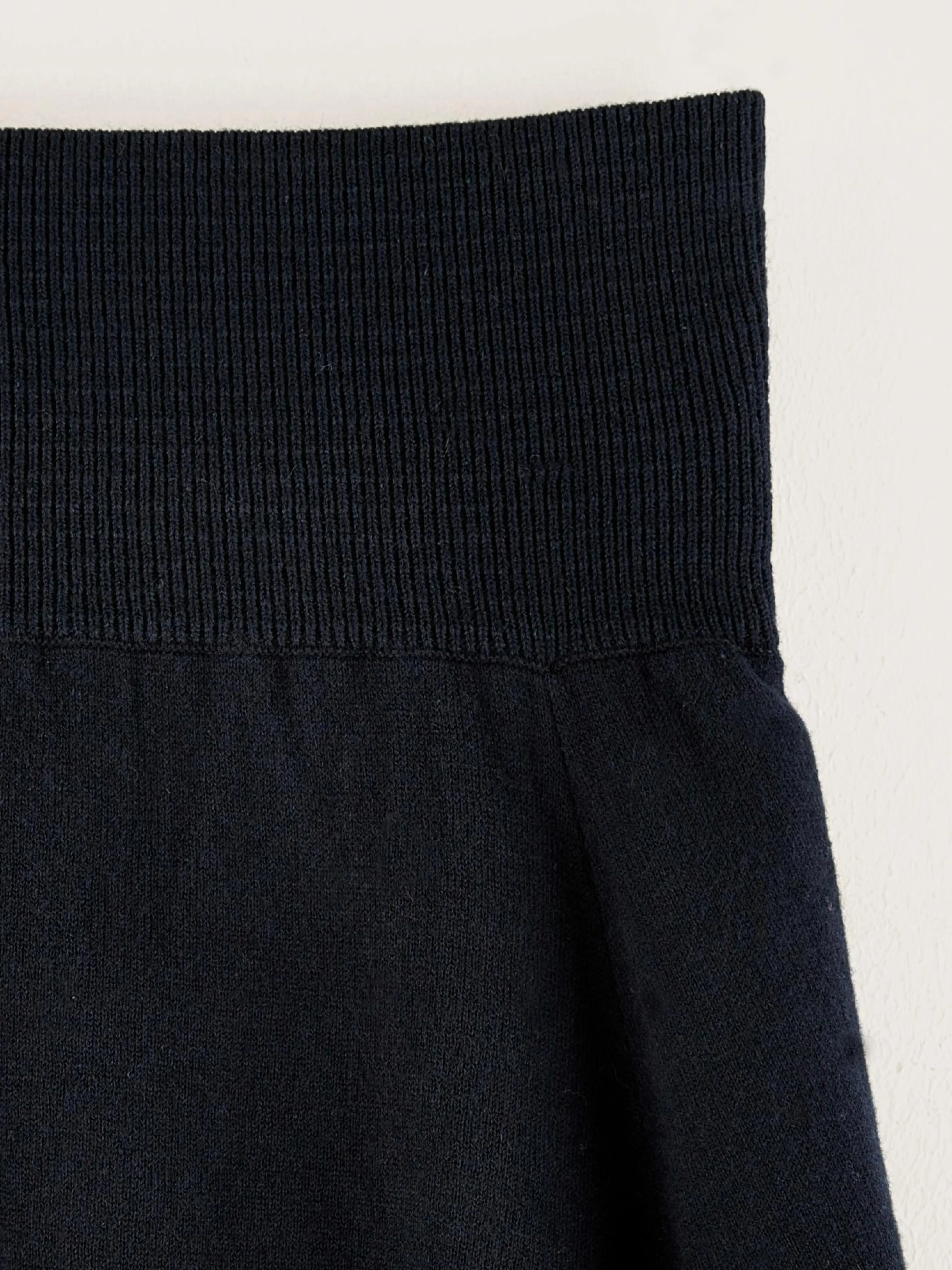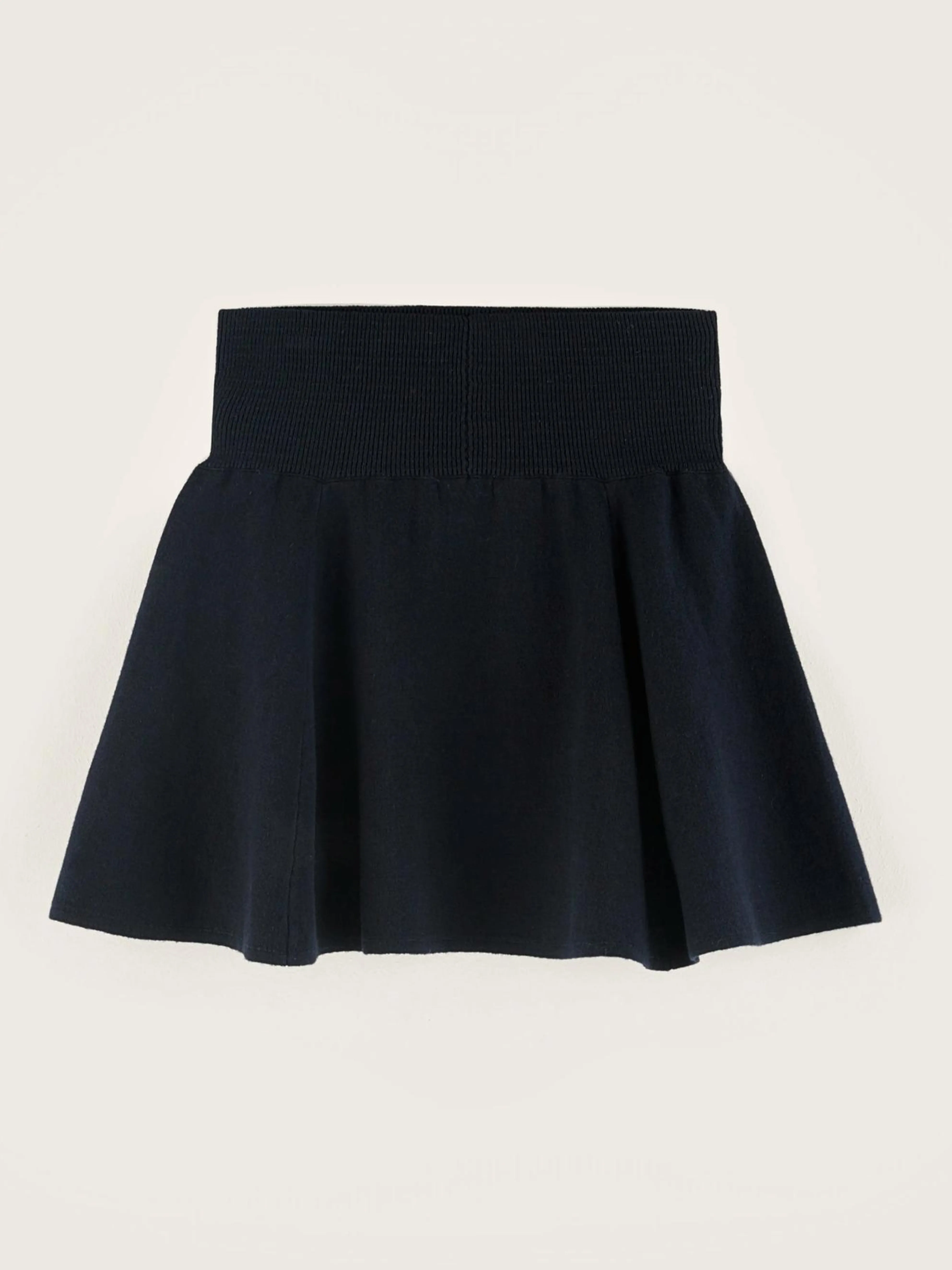Minirok met brede elastische tailleband van marineblauw tricot.