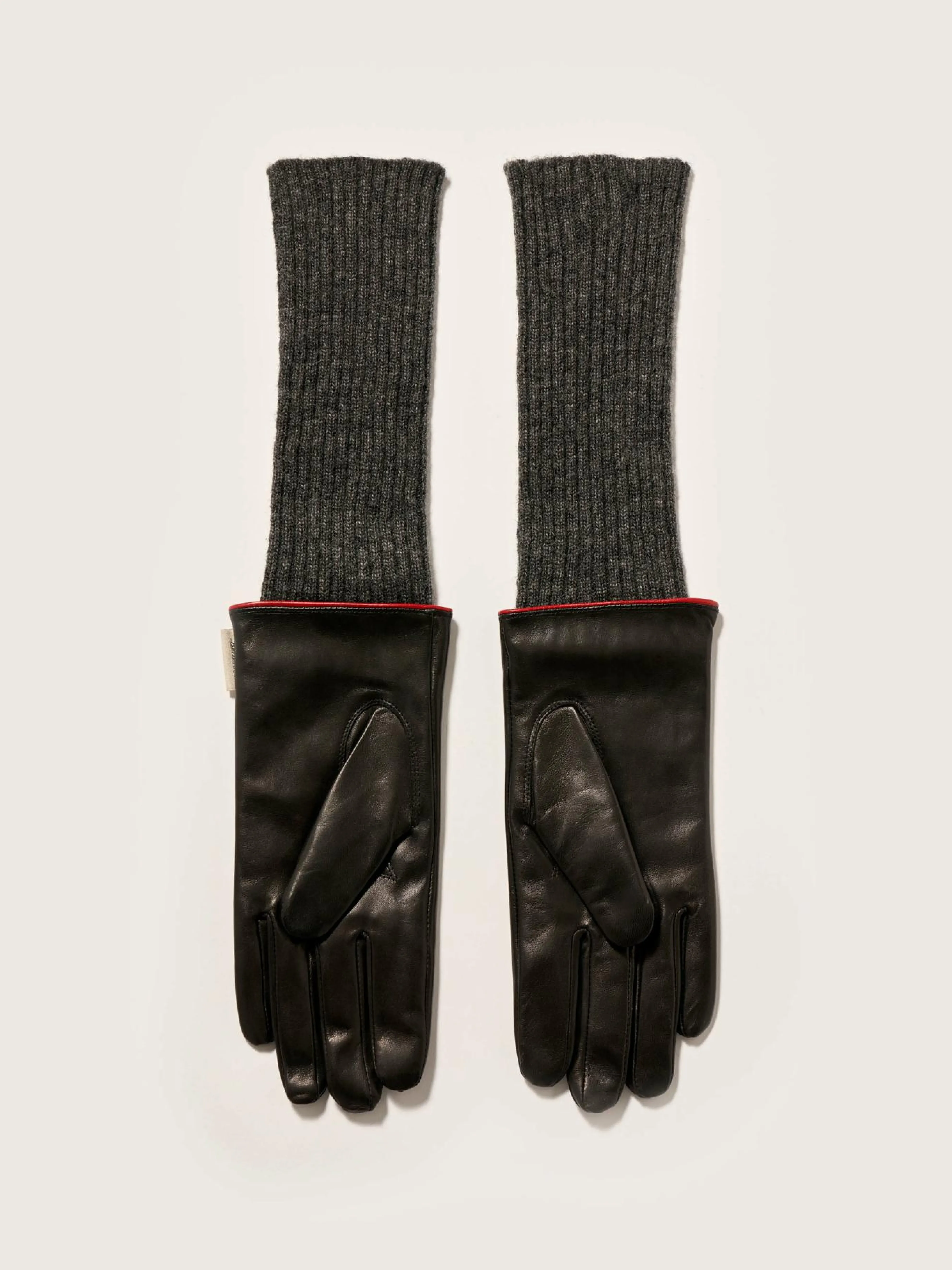 Zwartleren handschoen met grijze ribgebreide polsen.