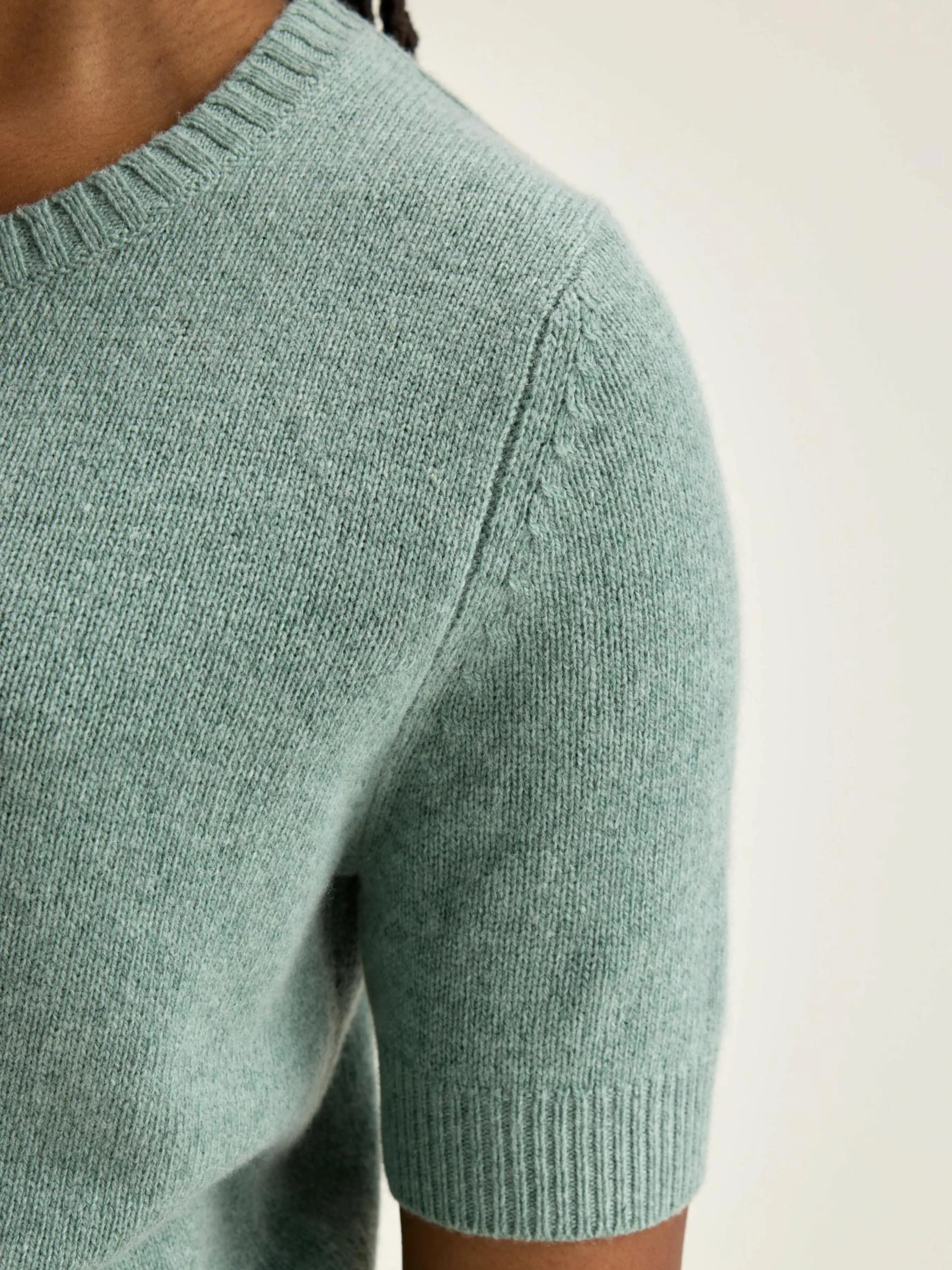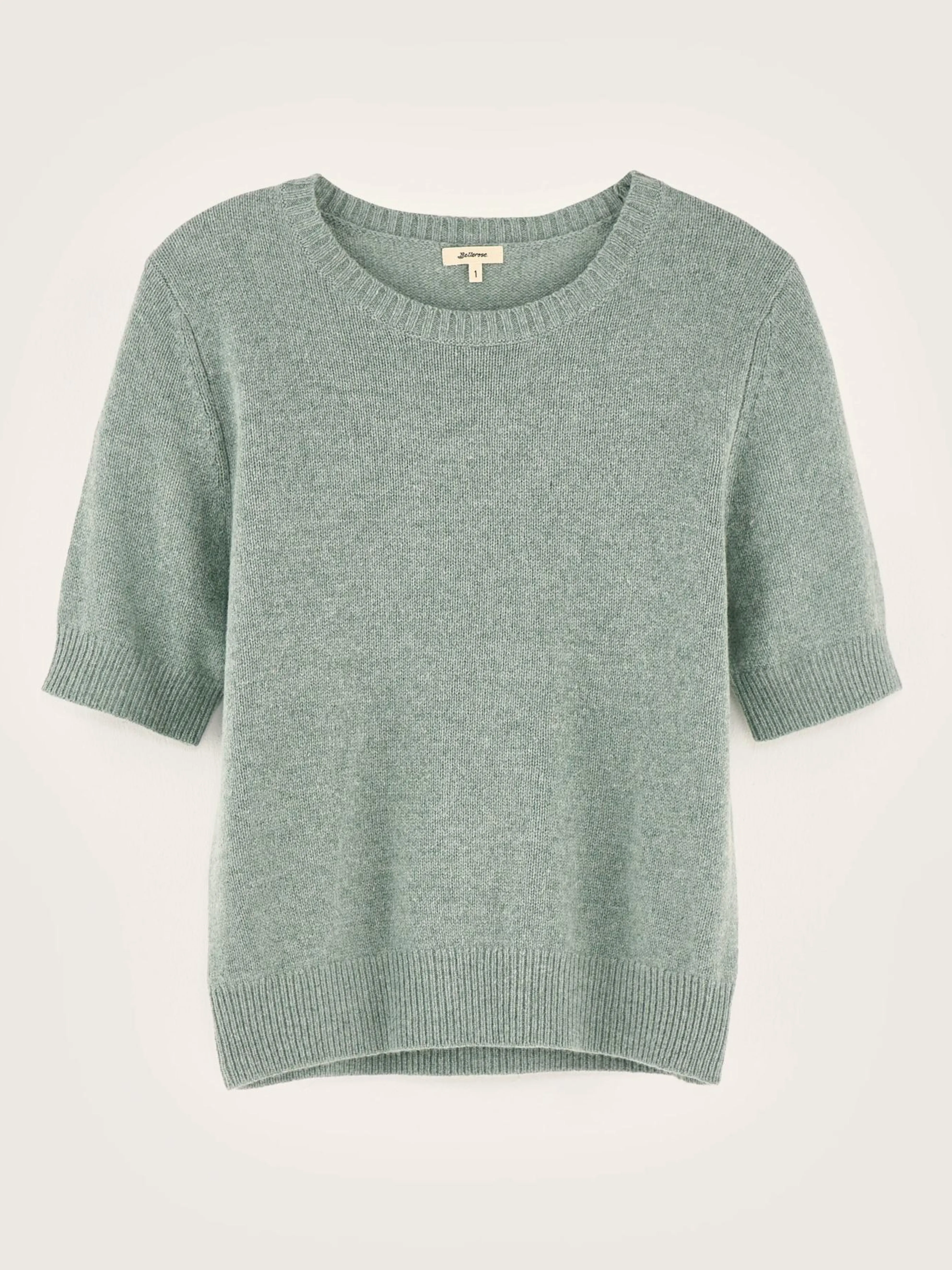 Aansluitende, blauw-grijze trui met korte mouwen.