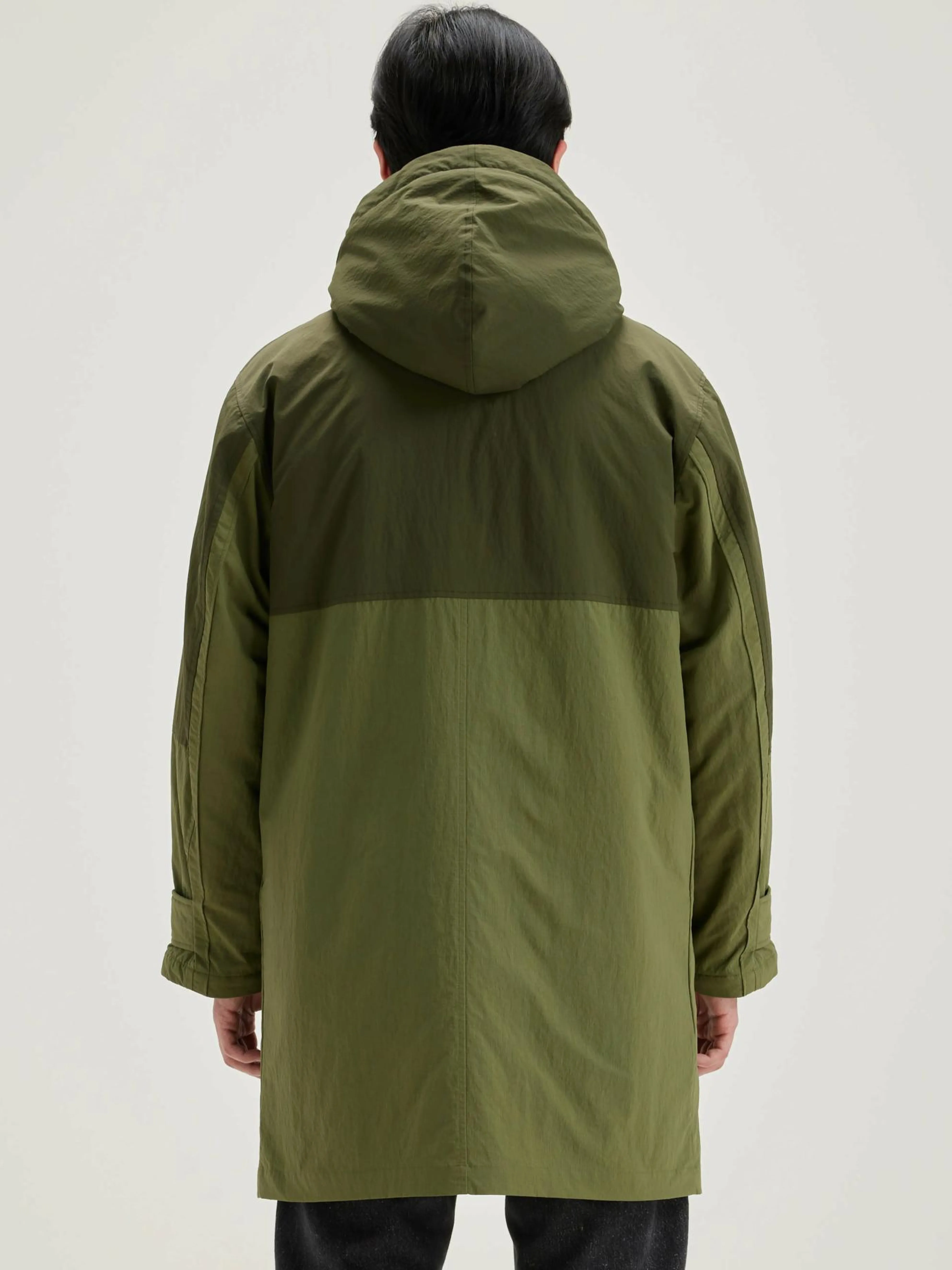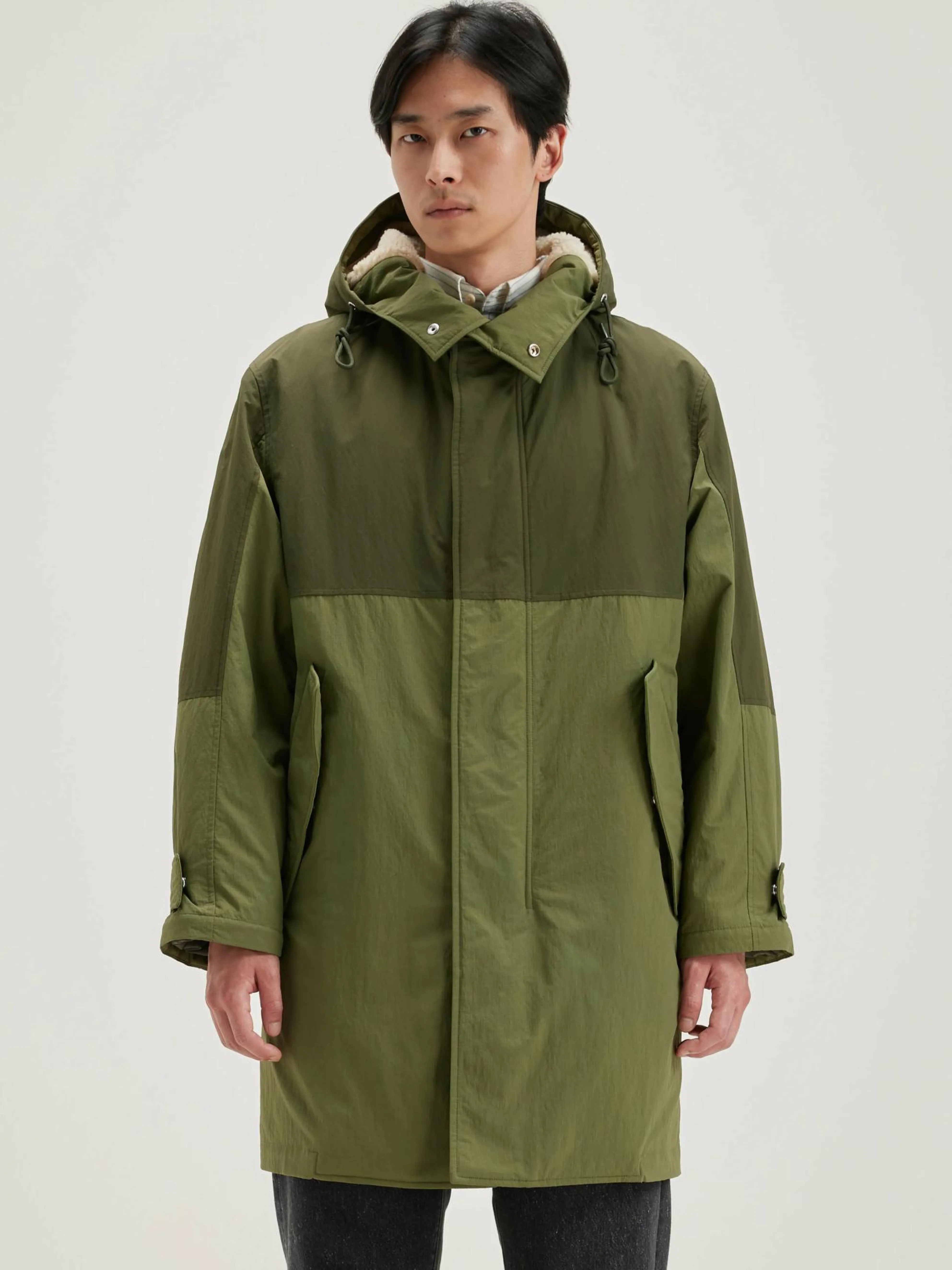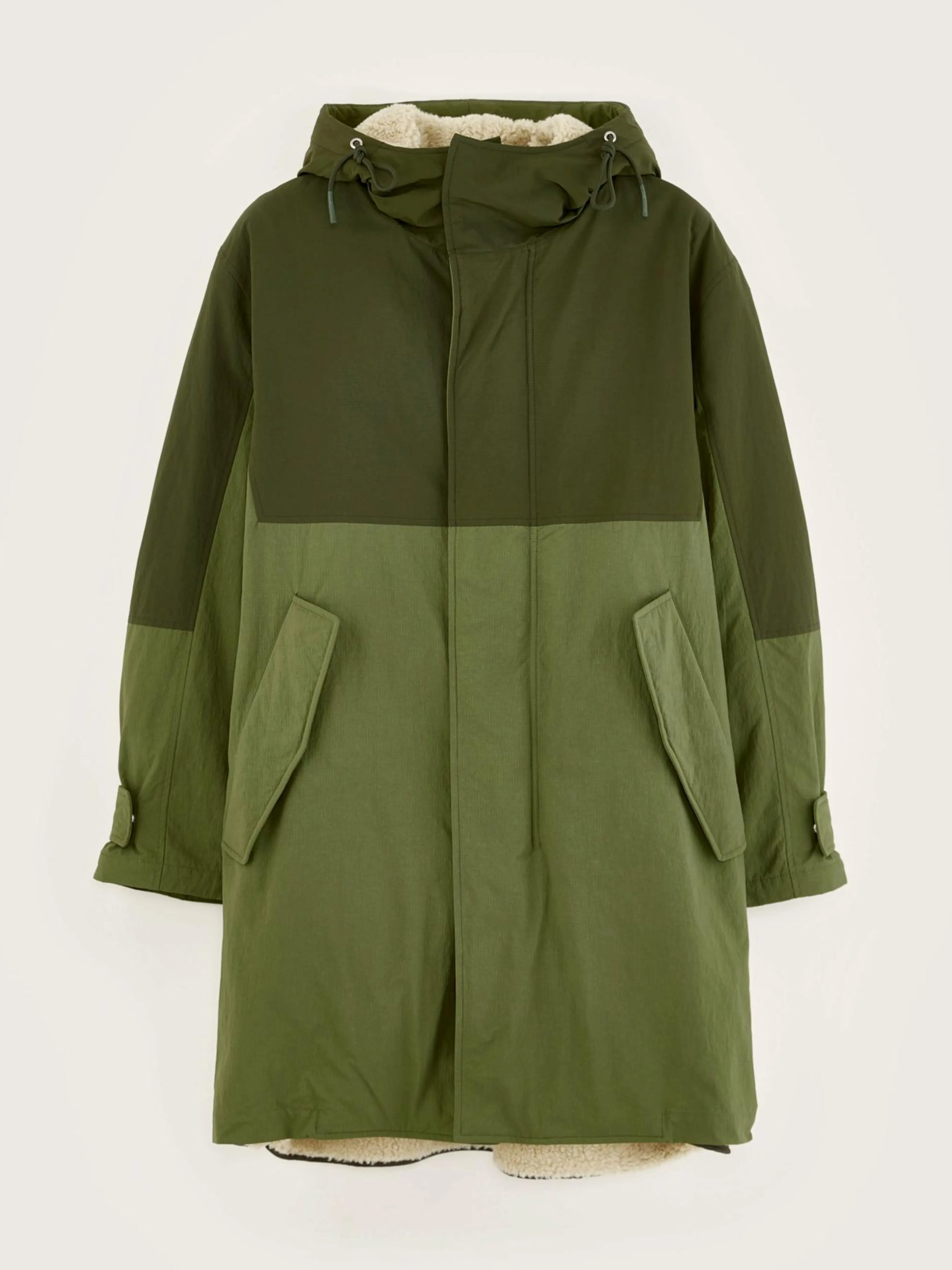 Klassieke parka met capuchon, van kakigroen canvas katoen met zachte ecru teddyvoering.