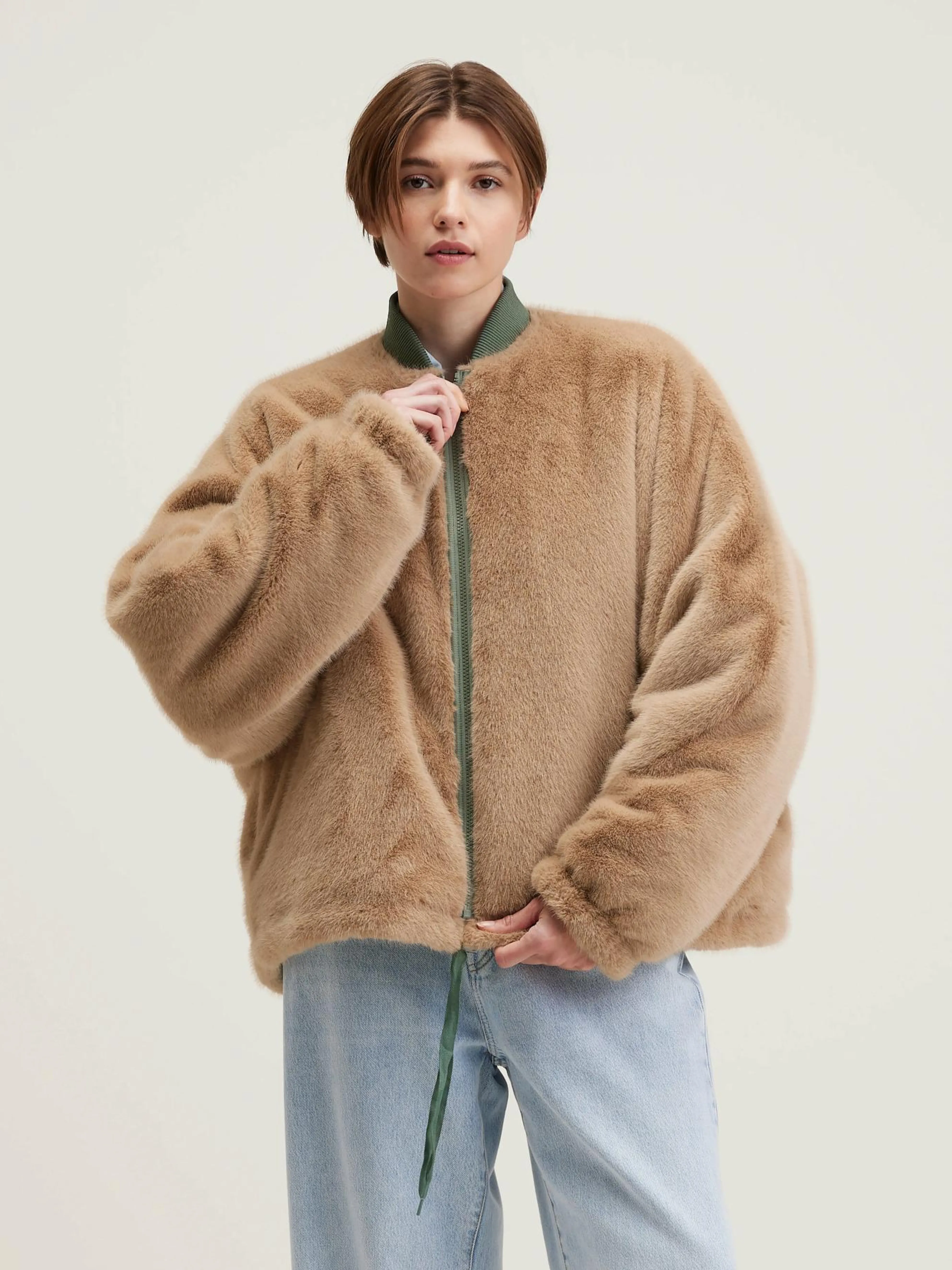 Omkeerbare, gewatteerde en oversizede jas, in een glanzende eucalyptusgroene stof.