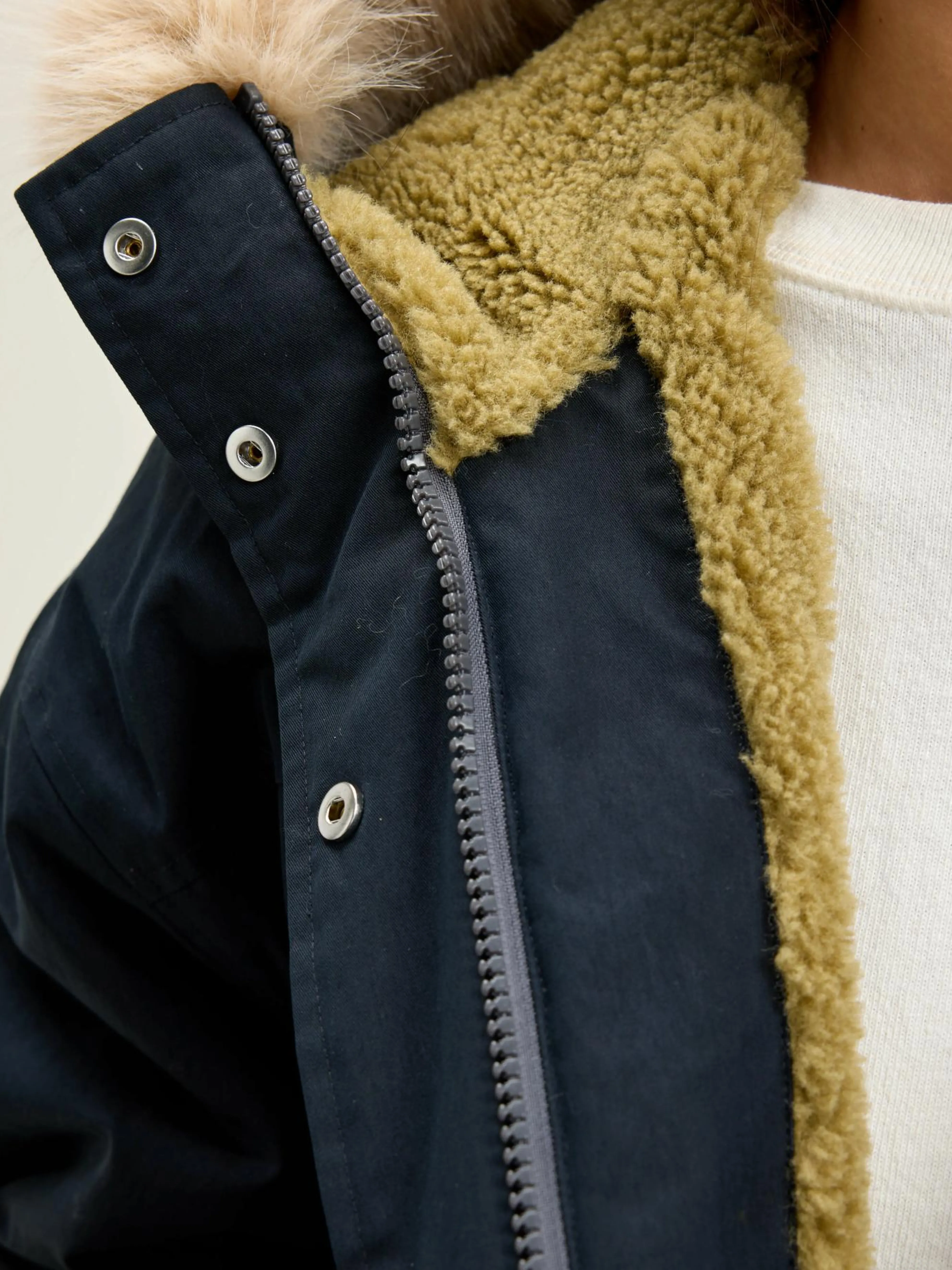 Marineblauwe parka in duffeljasstijl, met een met nepbont afgezette capuchon, ruime mouwen, geribde mouwranden en voering van teddystof.