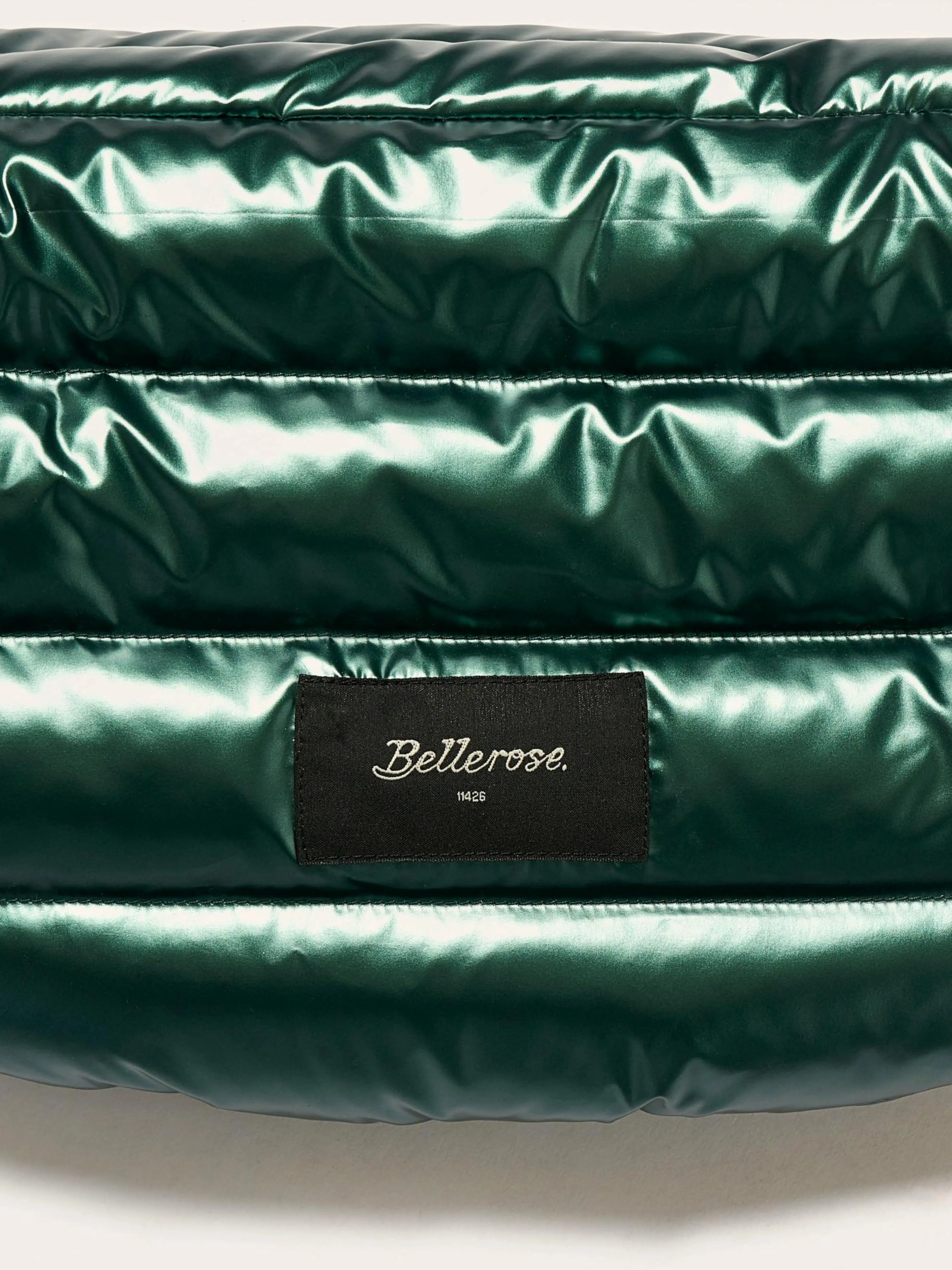 Gewatteerde puffer sling bag van glanzend donkergroen nylon.