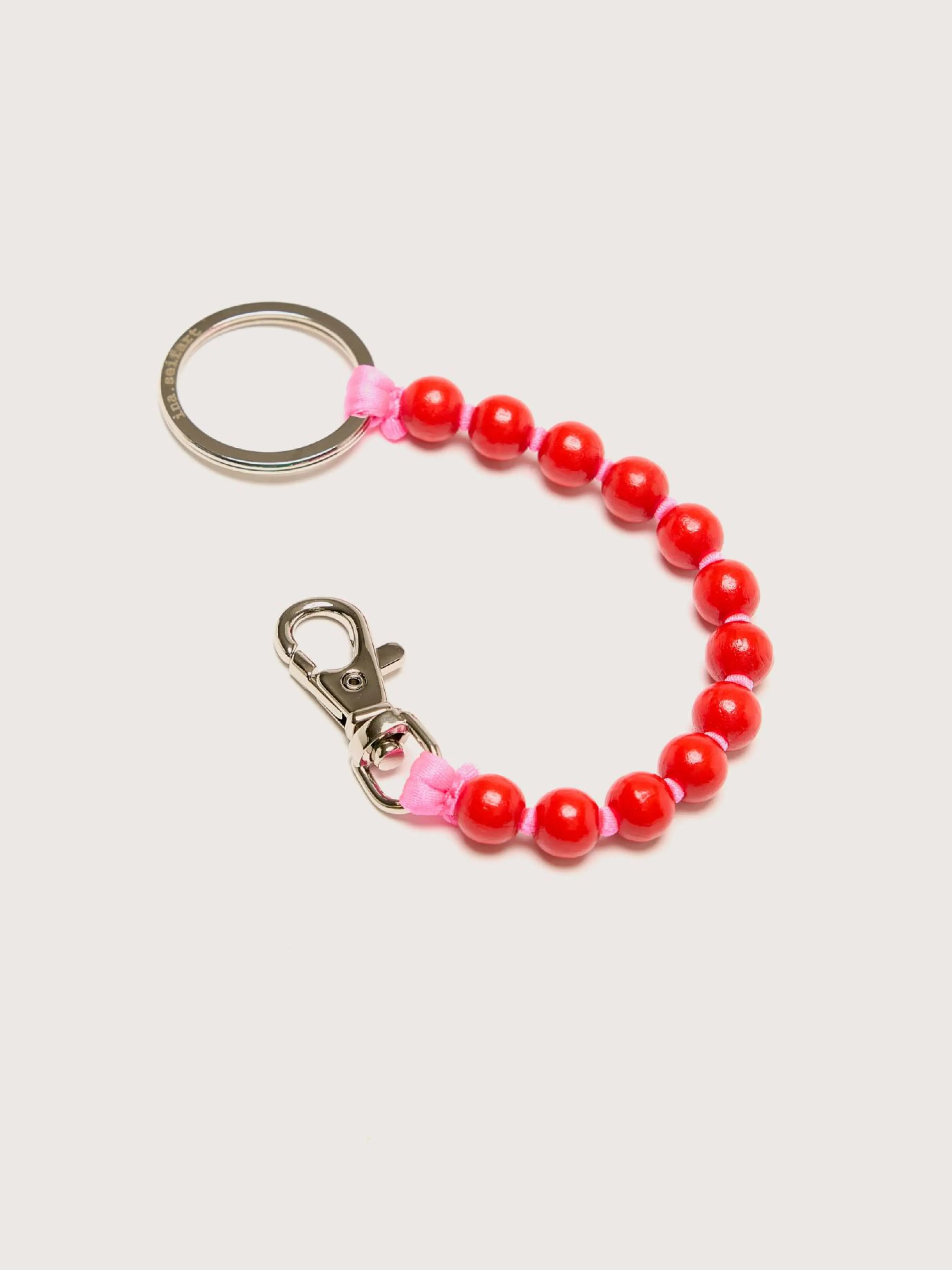 De Ina Seifart Perlen Short Sleutelhanger heeft houten kralen met een veganistische, niet-giftige afwerking, een metalen sluiting en sleutelring.