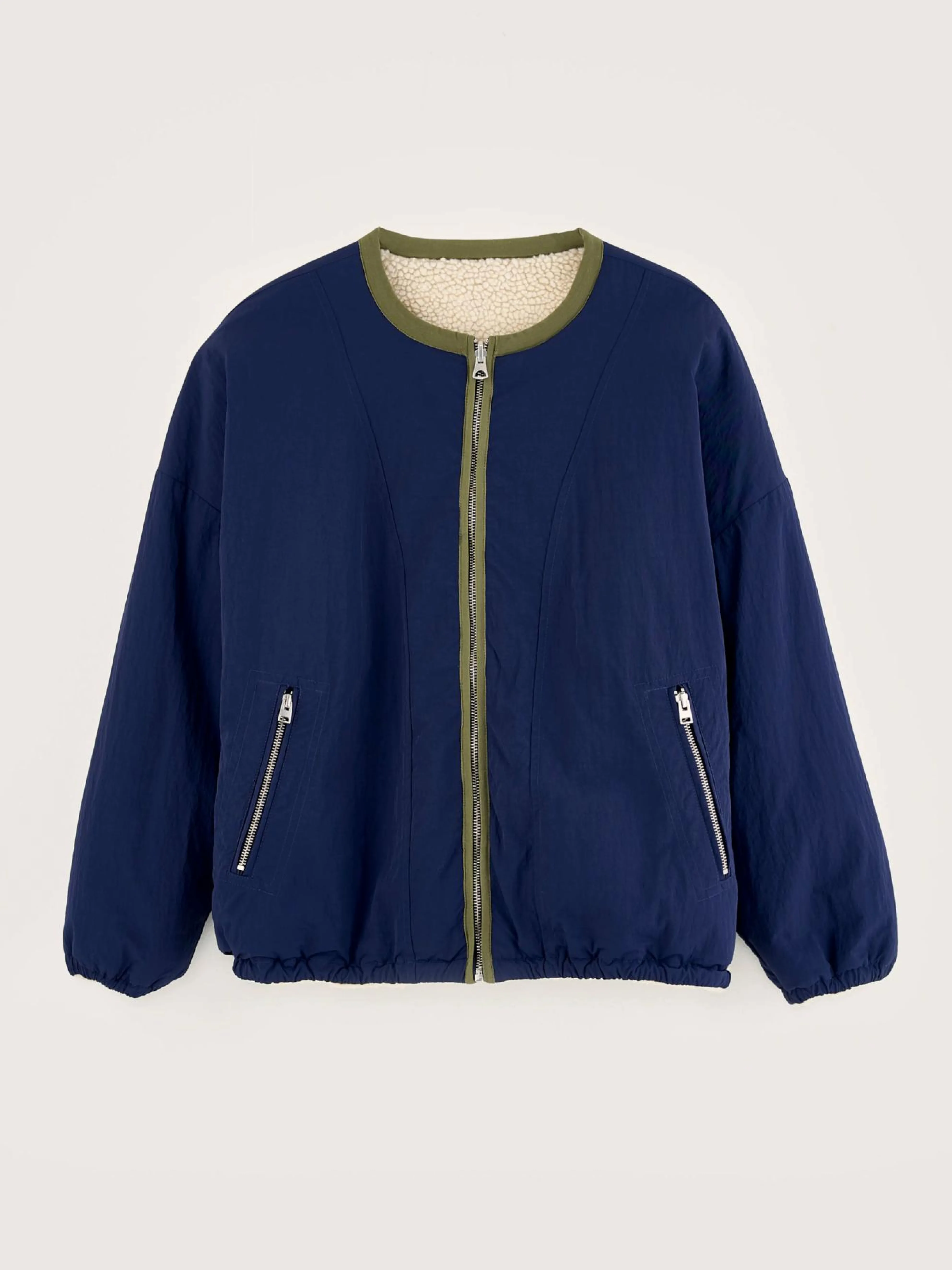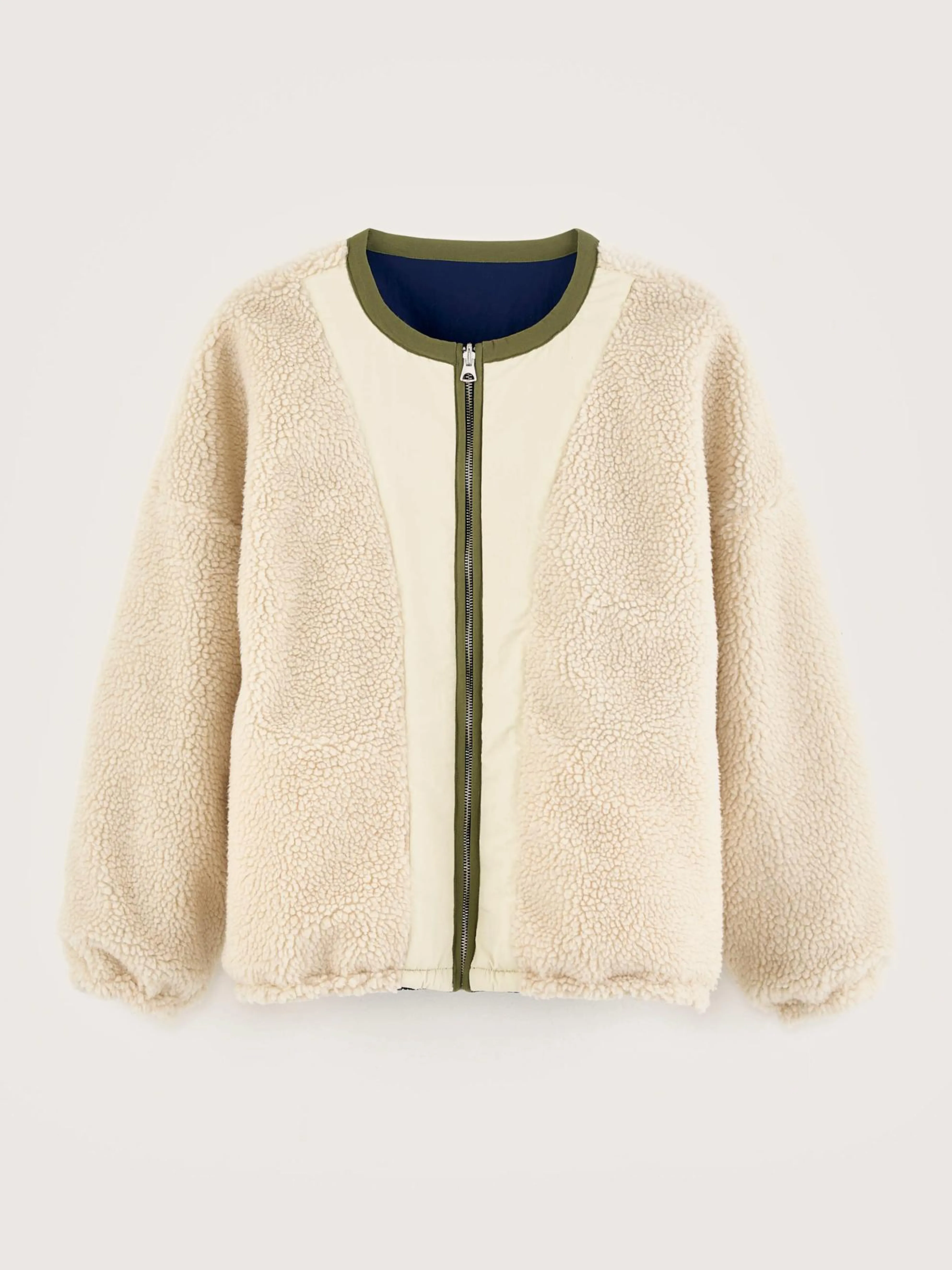 Omkeerbare en oversizede jas met één kant in ecru teddy en de andere kant in marineblauw nylon.