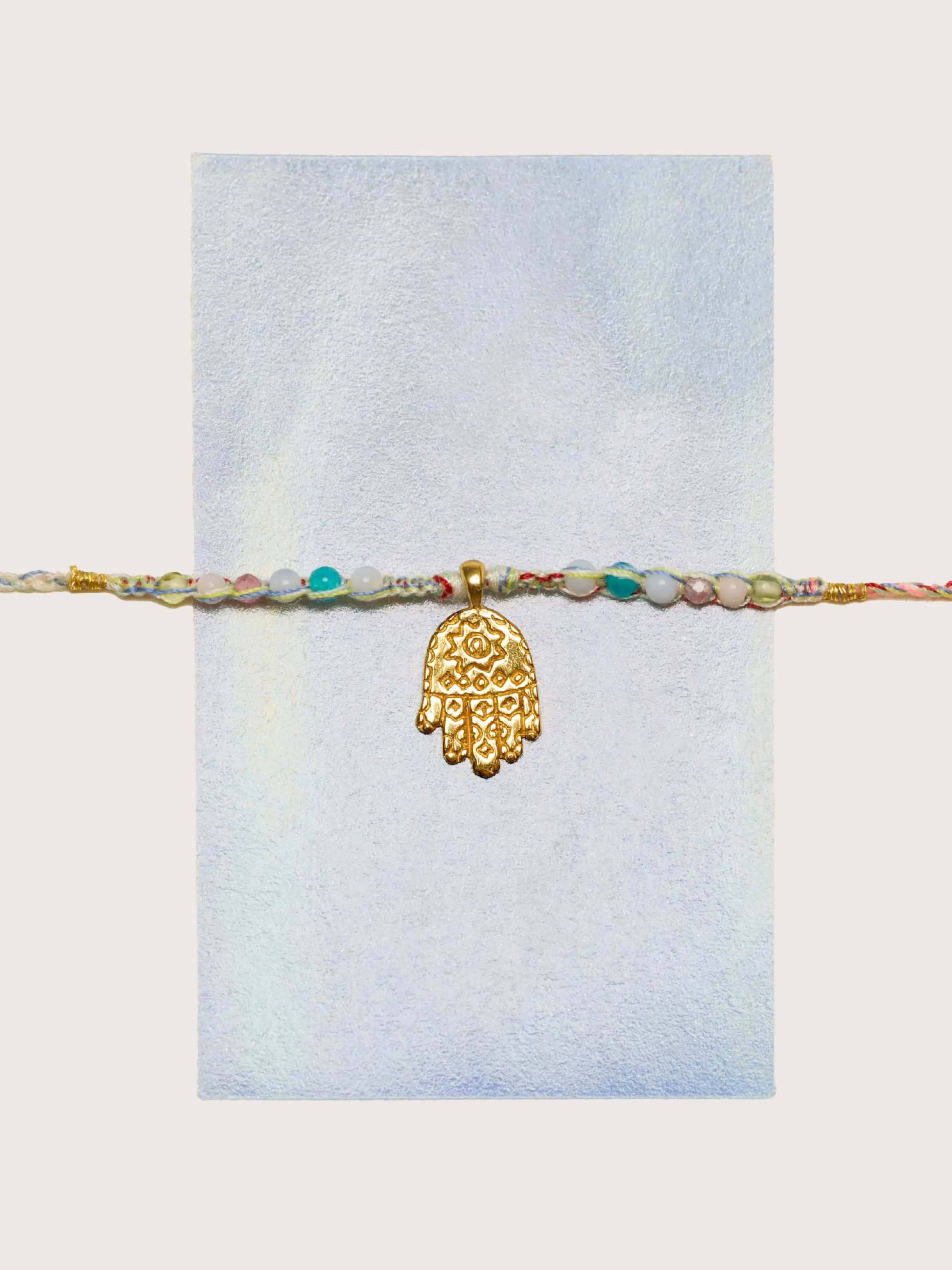 De Hamsa armband is een handgemaakte, verstelbare vlecht van fijn koord versierd met edelstenen en een vergulde bedel.